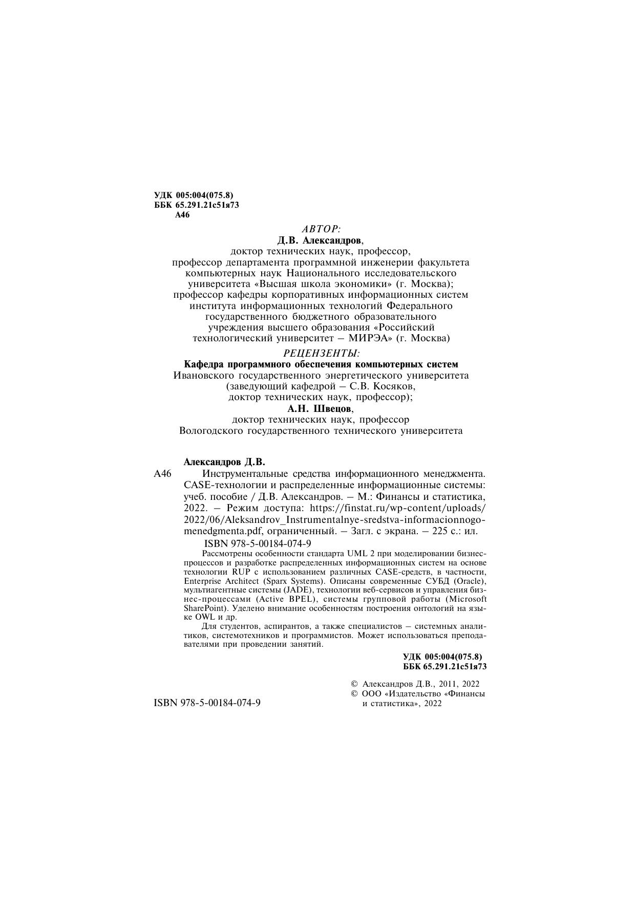 Рассмотрены особенности стандарта UML-2 при моделировании бизнес-процессов и разработке распределенных информационных систем на основе технологии RUP с использованием различных CASE-средств, в частности, Enterprise Archtect (Sparx Systems). Описаны современные СУБД (Oracle), мульагентные системы (JADE), технологии веб-сервисов и управления бизнес-процессами (Active BPEL), системы групповой программы (Microsoft SharePoint). Уделено внимание особенностям построения онтологий на языке OWL и др. Для студентов, аспирантов, а также специалистов - системных аналитоков, системотехников и программистов. Может использоваться преподавателями при проведении занятий.