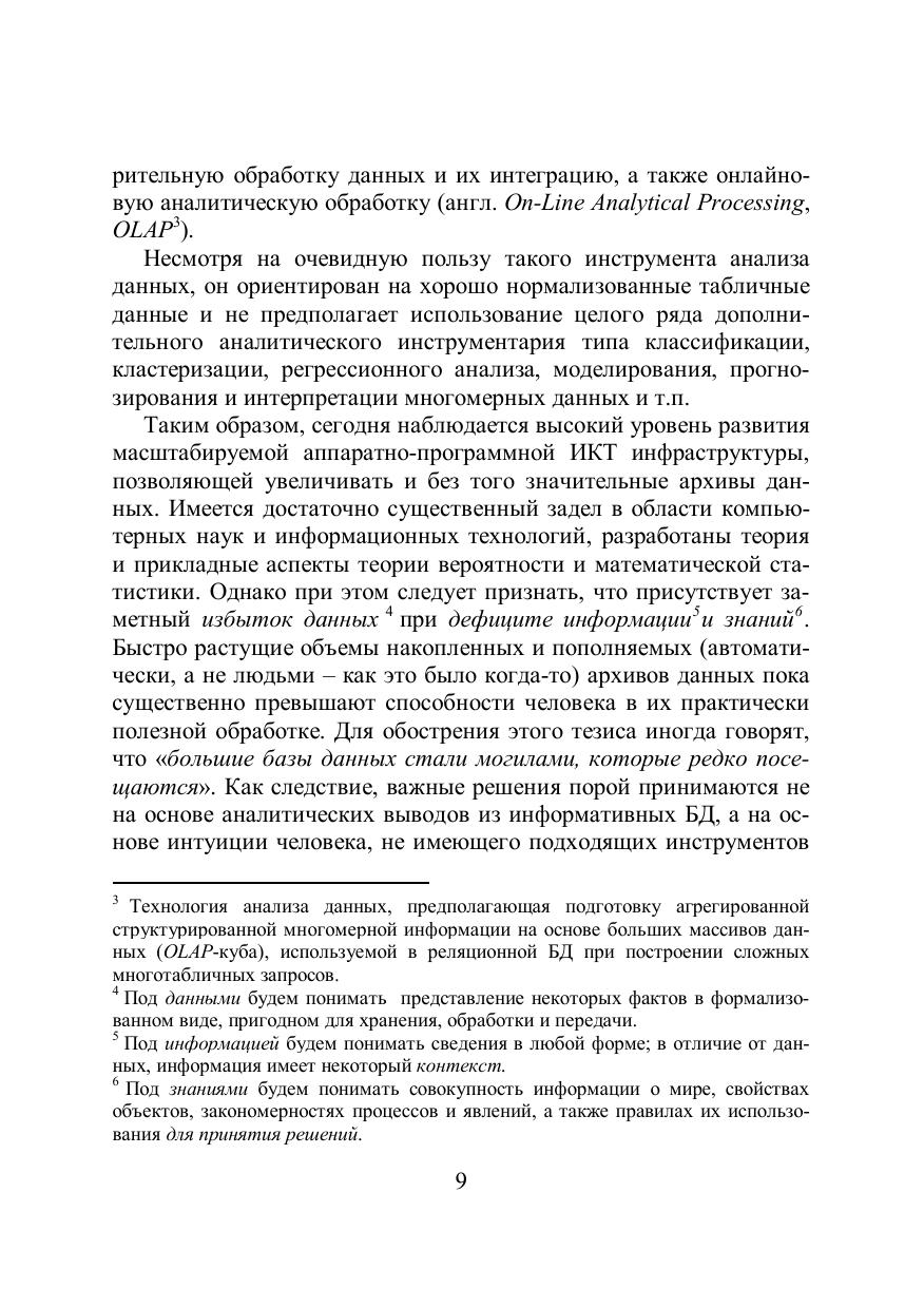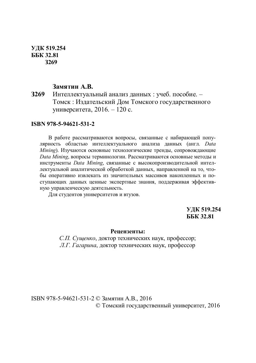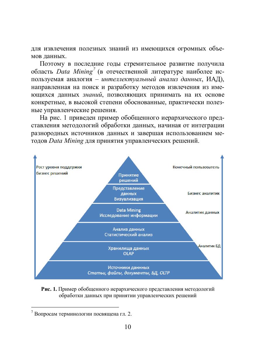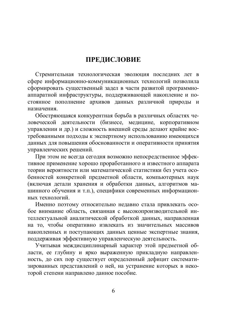 В работе рассматриваются вопросы, связанные с набирающей популярность областью интеллектуального анализа данных (англ. Data Mining). Изучаются основные технологические тренды, сопровождающие Data Mining, вопросы терминологии. Рассматриваются основные методы и инструменты Data Mining, связанные с высокопроизводительной интеллектуальной аналитической обработкой данных, направленной на то, чтобы оперативно извлекать из значительных массивов накопленных и по ступающих данных ценные экспертные знания, поддерживая эффектив ную управленческую деятельность. Для студентов университетов и втузов.