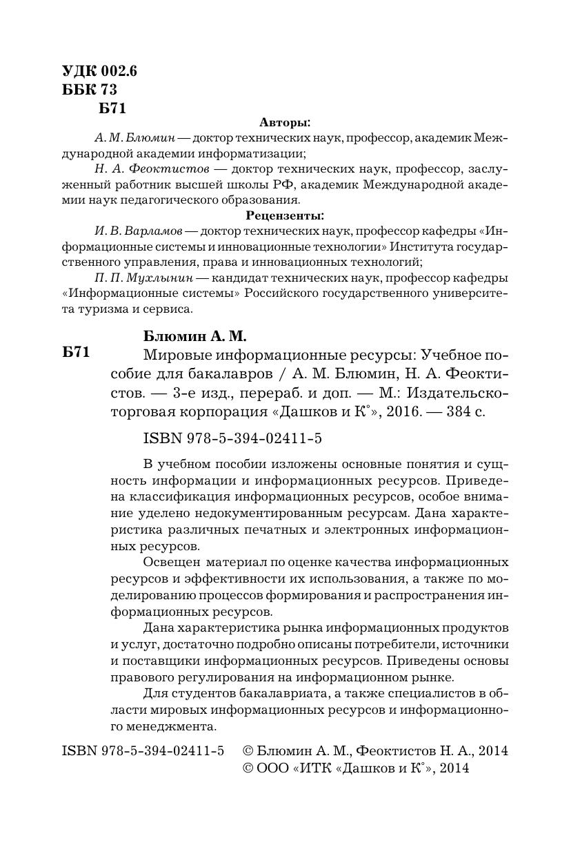 В учебном пособии изложены основные понятия и сущность информации и информационных ресурсов. Приведена классификация информационных ресурсов, причем особое внимание обращено на недокументированные ресурсы. Дана характеристика различных печатных и электронных информационных ресурсов. Впервые приведен материал по оценке качества информационных ресурсов и эффективности их использования, а также по моделированию процессов формирования и распространения информационных ресурсов. Рассмотрена характеристика рынка информационных продуктов и услуг, достаточно подробно описаны потребители, источники и поставщики информационных ресурсов. Приведены основы правового регулирования на информационном рынке. Для студентов вузов и специалистов в области мировых информационных ресурсов и информационного менеджмента.