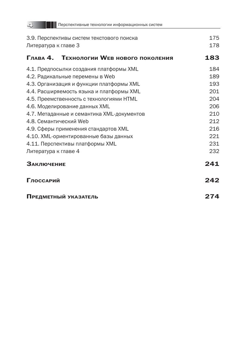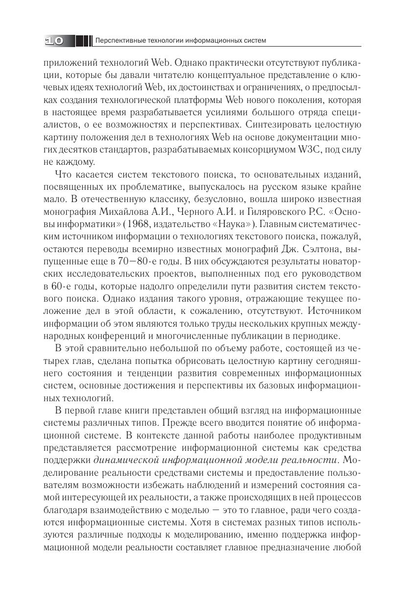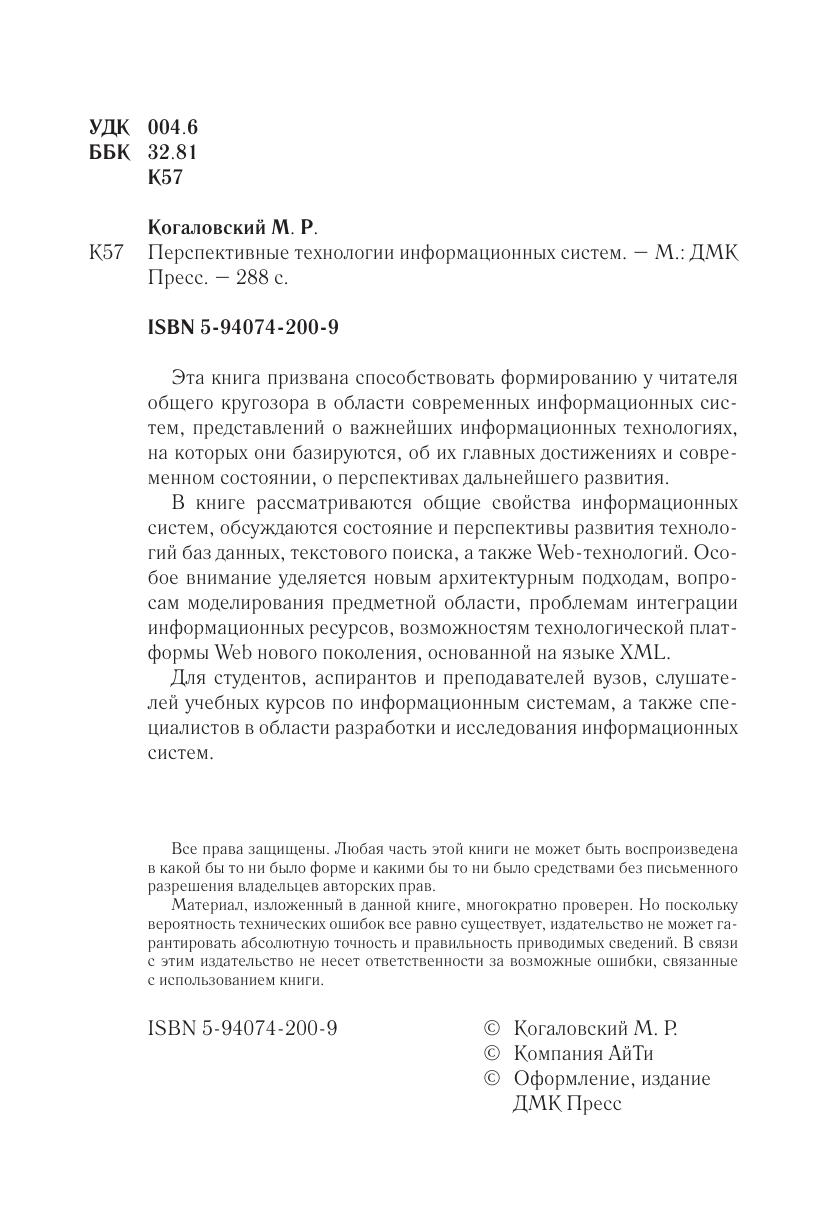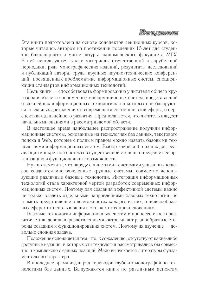 Эта книга призвана способствовать формированию у читателя общего кругозора в области современных информационных систем, представлений о важнейших информационных технологиях, на которых они базируются, об их главных достижениях и современном состоянии, о перспективах дальнейшего развития. В книге рассматриваются общие свойства информационных систем, обсуждаются состояние и перспективы развития технологий баз данных, текстового поиска, а также Web технологий. Особое внимание уделяется новым архитектурным подходам, вопросам моделирования предметной области, проблемам интеграции информационных ресурсов, возможностям технологической платформы Web нового поколения, основанной на языке XML. Для студентов, аспирантов и преподавателей вузов, слушателей учебных курсов по информационным системам, а также специалистов в области разработки и исследования информационных систем.