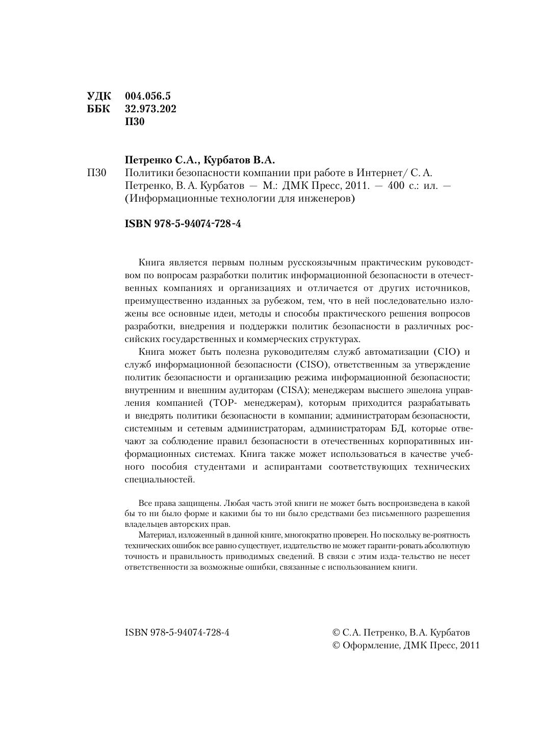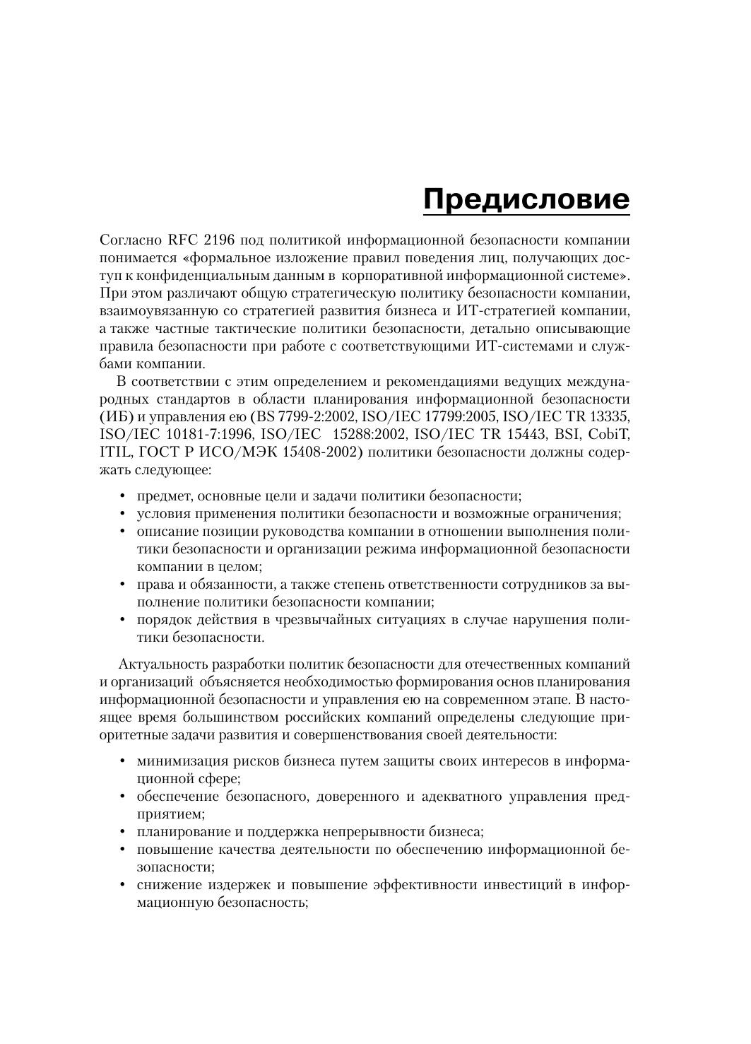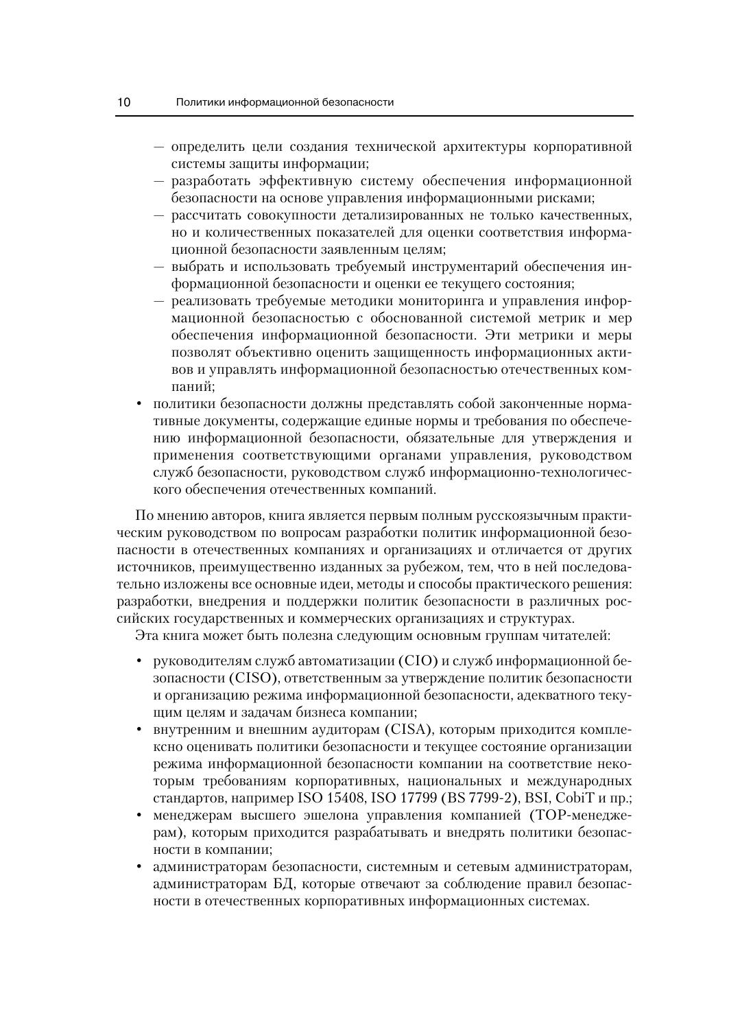 Книга является первым полным русскоязычным практическим руководством по вопросам разработки политик информационной безопасности в отечественных компаниях и организациях и отличается от других источников, преимущественно изданных за рубежом, тем, что в ней последовательно изложены все основные идеи, методы и способы практического решения вопросов разработки, внедрения и поддержки политик безопасности в различных российских государственных и коммерческих структурах. Книга может быть полезна руководителям служб автоматизации (CIO) и служб информационной безопасности (CISO), ответственным за утверждение политик безопасности и организацию режима информационной безопасности, внутренним и внешним аудиторам (CISA), менеджерам высшего эшелона управления компанией (ТОР менеджерам), которым приходится разрабатывать и внедрять политики безопасности в компании, администраторам безопасности, системным и сетевым администраторам, администраторам БД, которые отвечают за соблюдение правил безопасности в отечественных корпоративных информационных системах. Книга также может использоваться в качестве учебного пособия студентами и аспирантами соответствующих технических специальностей.