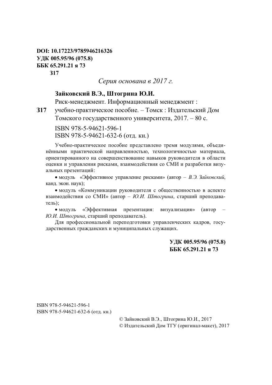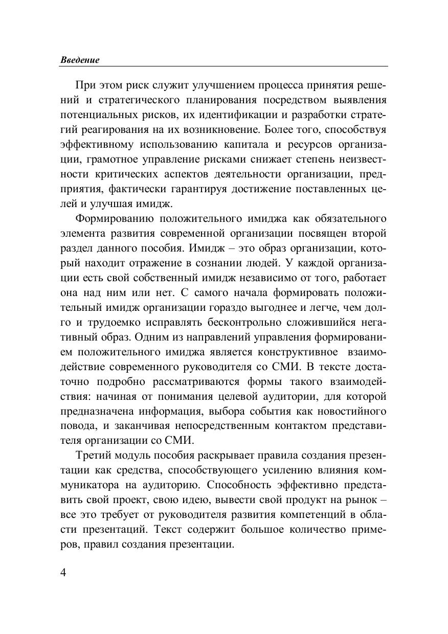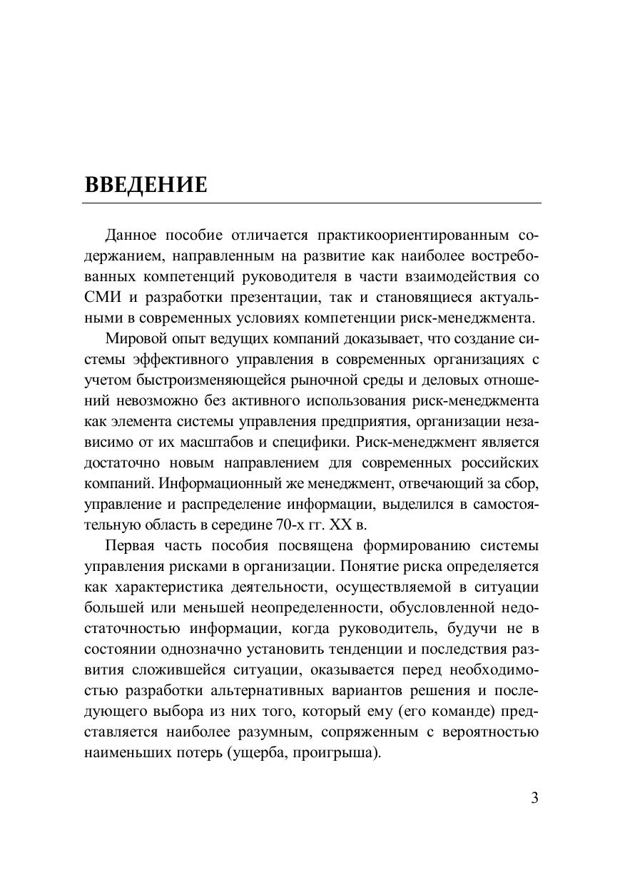 Учебно-практическое пособие представлено тремя модулями, объединёнными практической направленностью, технологичностью материала, ориентированного на совершенствование навыков руководителя в области оценки и управления рисками, взаимодействия со СМИ и разработки визуальных презентаций: модуль «Эффективное управление рисками» (автор – В.Э. Зайковский, канд. экон. наук), модуль «Коммуникации руководителя с общественностью в аспекте взаимодействия со СМИ» (автор – Ю.И. Штогрина, старший преподаватель), модуль «Эффективная презентация: визуализация» (автор – Ю.И. Штогрина, старший преподаватель). Для профессиональной переподготовки управленческих кадров, государственных гражданских и муниципальных служащих.
