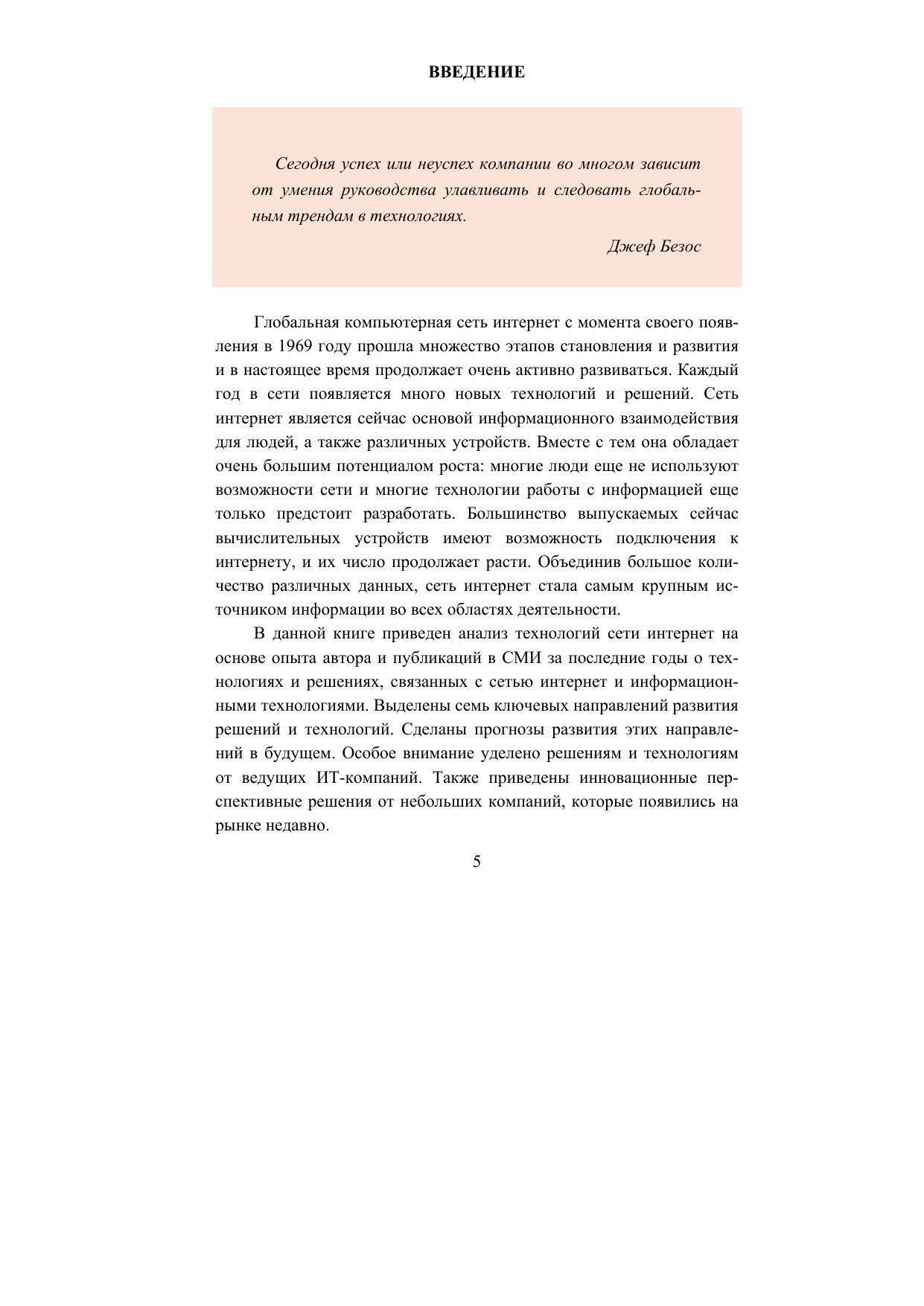 Результатом прочтения книги является понимание концепции развития интернет-технологий в настоящем и ближайшем будущем. В книге приведен обзор и анализ наиболее перспективных технологий, которые взаимосвязаны с сетью интернет и которым в настоящеевремя уделяется значительное внимание как со стороны пользователей, так и со стороны ИТ-компаний, а также в СМИ. Книга состоит из семи самостоятельных глав, каждая из которых описывает отдельное направление развития сети интернет и технологий, с ним связанных. Книга будет полезна специалистам технологических компаний — руководителям различных уровней, которые ответственны за принятие решений, а также главным и ведущим специалистам.