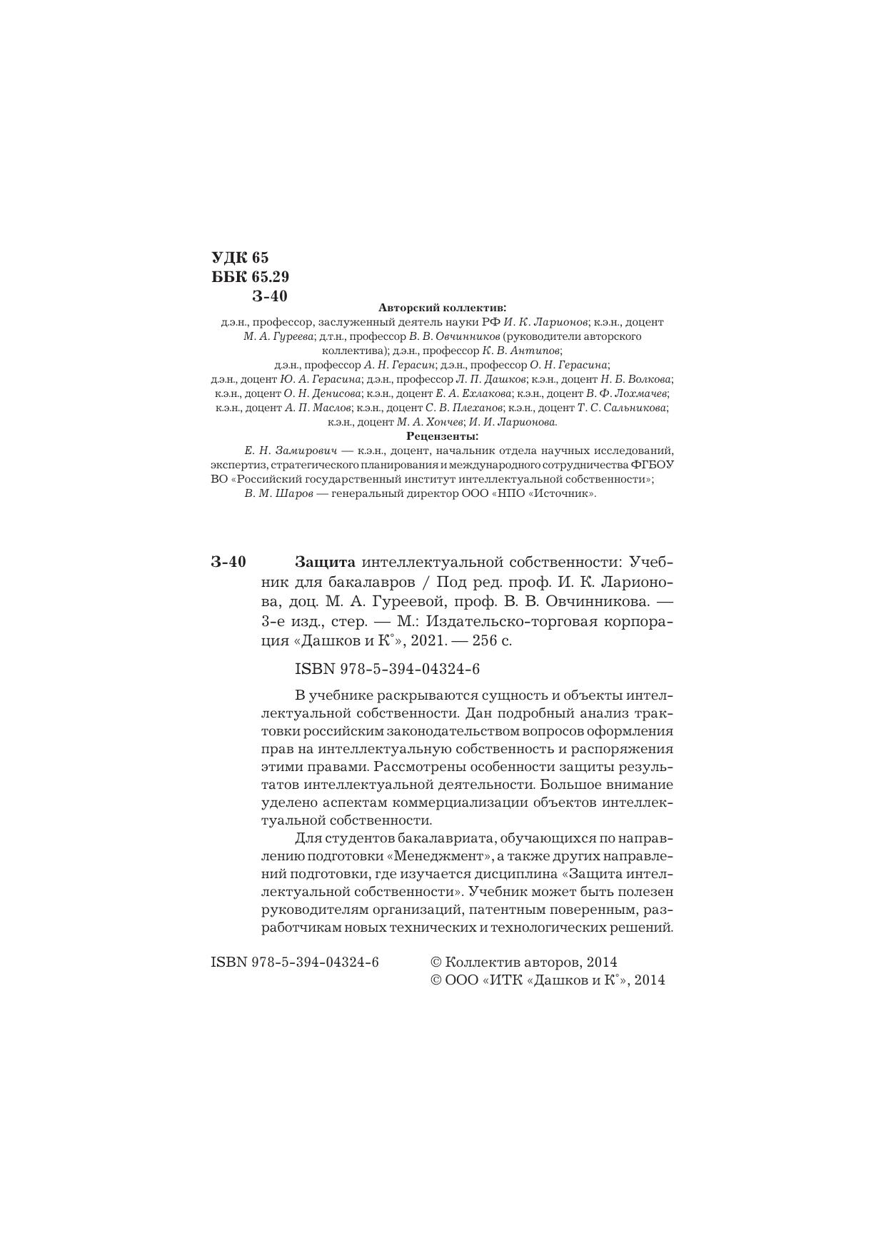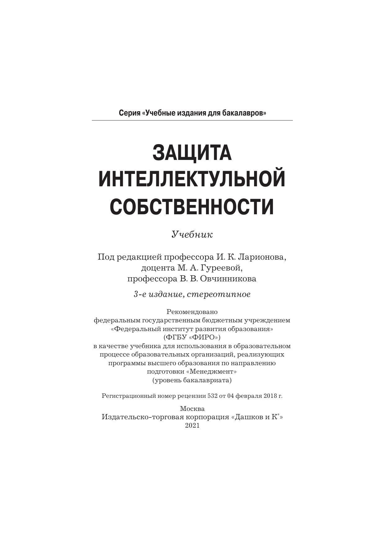 В учебнике раскрываются сущность и объекты интеллектуальной собственности. Дан подробный анализ трактовки российским законодательством вопросов оформления прав на интеллектуальную собственность и распоряжения этими правами. Рассмотрены особенности защиты результатов интеллектуальной деятельности. Большое внимание уделено аспектам коммерциализации объектов интеллектуальной собственности. Для студентов бакалавриата, обучающихся по направлению подготовки «Менеджмент», а также других направлений подготовки, где изучается дисциплина «Защита интеллектуальной собственности». Учебник может быть полезен руководителям организаций, патентным поверенным, разработчикам новых технических и технологических решений.