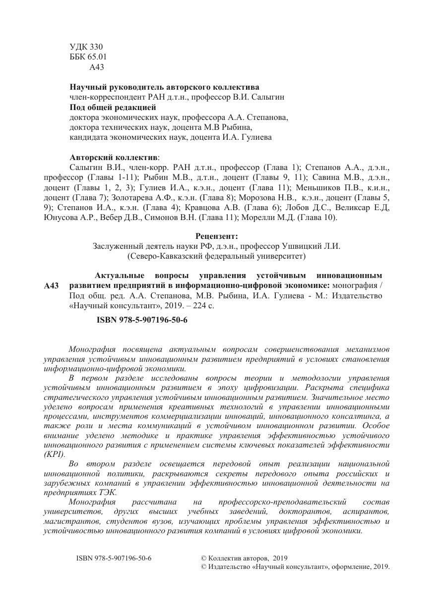 Монография посвящена актуальным вопросам совершенствования механизмов управления устойчивым инновационным развитием предприятий в условиях становления информационно-цифровой экономики.