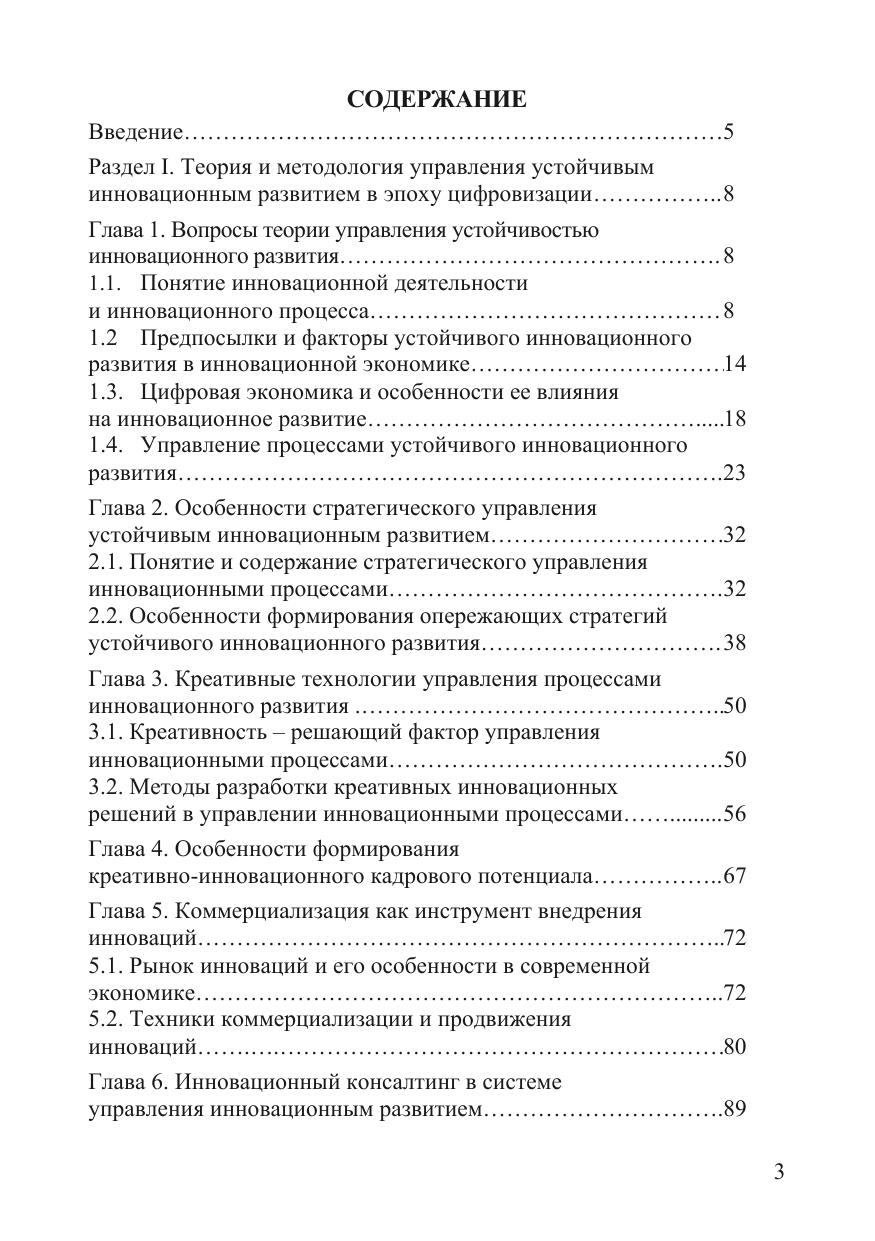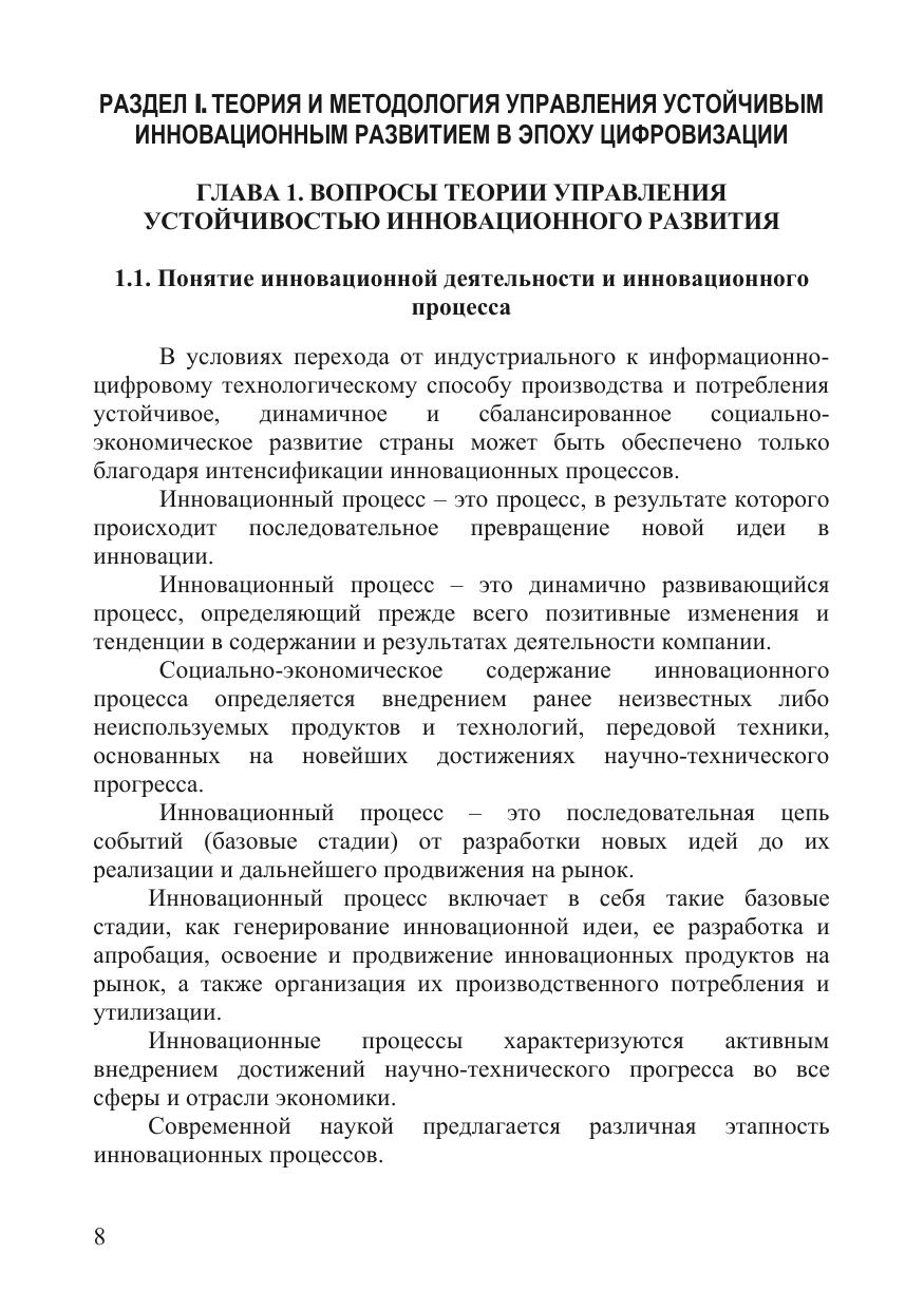 В первом разделе исследованы вопросы теории и методологии управления устойчивым инновационным развитием в эпоху цифровизации. Раскрыта специфика стратегического управления устойчивым инновационным развитием. Значительное место уделено вопросам применения креативных технологий в управлений инновационными процессами, инструментов коммерциализации инноваций, инновационного консалтинга, а также роль и места коммуникаций в устойчивом инновационном развитии. Особое внимание уделено методике и практике управления эффективностью устойчивого инновационного развития с применением системы ключевых показателей эффективности (KPI).