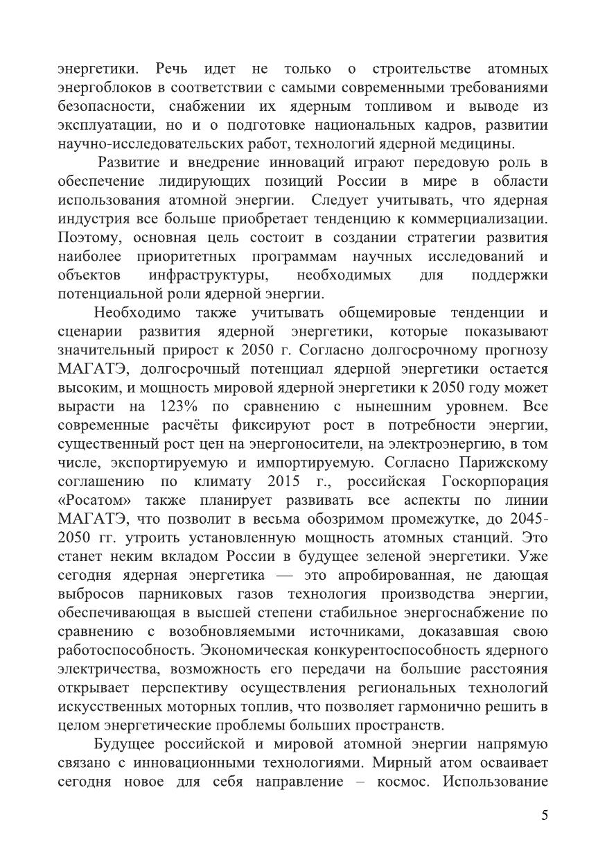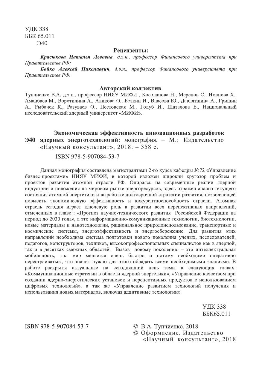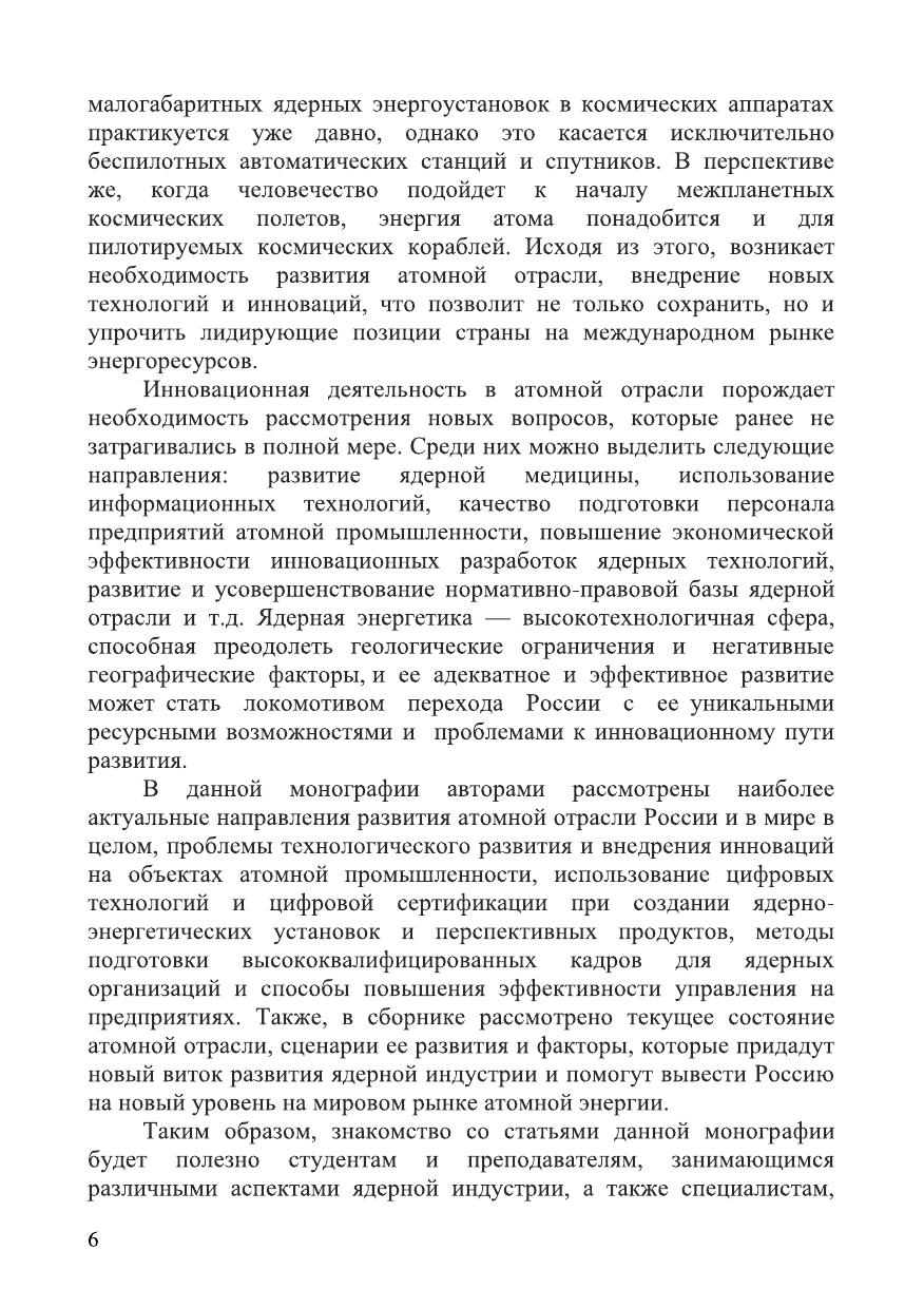 Данная монография составлена магистрантами 2-го курса кафедры №72 «Управление бизнес-проектами» НИЯУ МИФИ, в которой изложен широкий кругозор проблем и проектов развития атомной отрасли РФ. Опираясь на современные реалии ядерной индустрии и положения на мировом рынке энергоресурсов, здесь отражен анализ текущего состояния атомной энергетики и выработке долгосрочной стратегии развития, позволяющей повысить экономическую эффективность и кокурентноспособность отрасли. Атомная отрасль сегодня играет ключевую роль в развитии всех перспективных направлений, отмеченных в главе : «Прогноз научно-технического развития Российской Федерации на период до 2030 года», а это информационно-комуникационные технологии, биотехнологии, новые материалы и нанотехнологии, рациональное природоиспользование, транспортные и космические системы, энергоэффективность и энергосбережение. Для развития этих направлений необходима система подготовки нового поколения ученых, исследователей, педагогов, конструкторов, техников, высокопрофессиональных специалистов как в ядерной, так и в десятках смежных областей. Вызов новому поколению - это интеллектуальная мобильность, т.к. мир меняется очень быстро и потому необходимо оперативно перестраиваться, что значит нужно для этого обладать всеми необходимыми знаниями. В работе раскрыты актуальные на сегодняшний день темы в следующих главах: «Коммуникационные стратегии в области ядерной энергетики», «Управление качеством при создании ядерно-энергетических установок и перспективных продуктов с использованием цифровых технологий», а так же «Управление развитием технологий получения и использования новых материалов, включая аддитивные технологии»