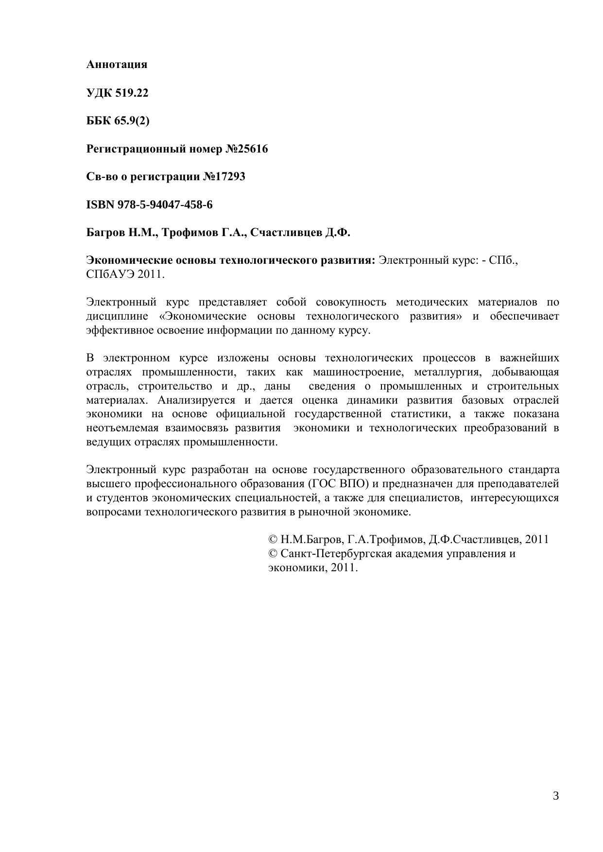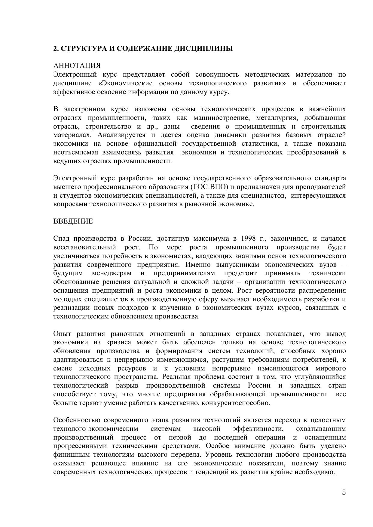 Электронный курс представляет собой совокупность методических материалов по дисциплине «Экономические основы технологического развития» и обеспечивает эффективное освоение информации по данному курсу. В электронном курсе изложены основы технологических процессов в важнейших отраслях промышленности, таких как машиностроение, металлургия, добывающая отрасль, строительство и др., даны сведения о промышленных и строительных материалах. Анализируется и дается оценка динамики развития базовых отраслей экономики на основе официальной государственной статистики, а также показана неотъемлемая взаимосвязь развития экономики и технологических преобразований в ведущих отраслях промышленности. Электронный курс разработан на основе государственного образовательного стандарта высшего профессионального образования (ГОС ВПО) и предназначен для преподавателей и студентов экономических специальностей, а также для специалистов, интересующихся вопросами технологического развития в рыночной экономике.
