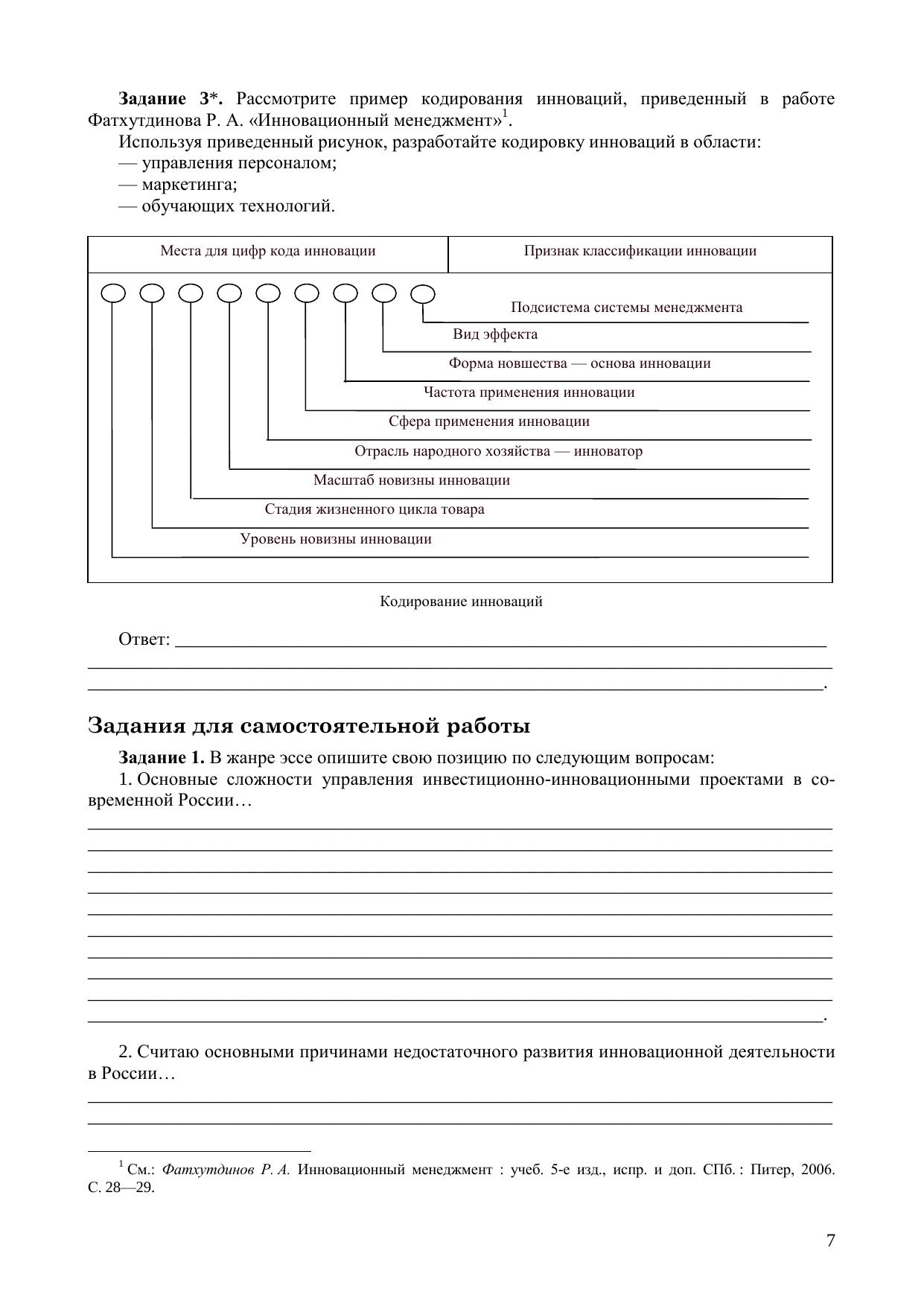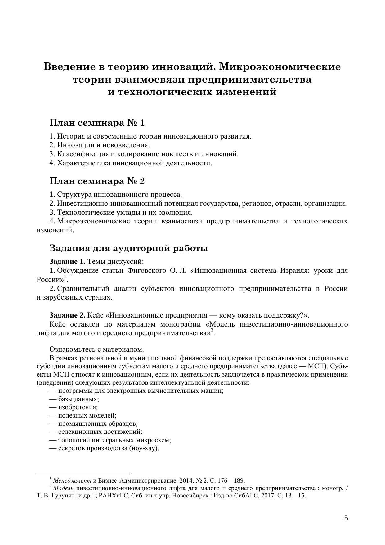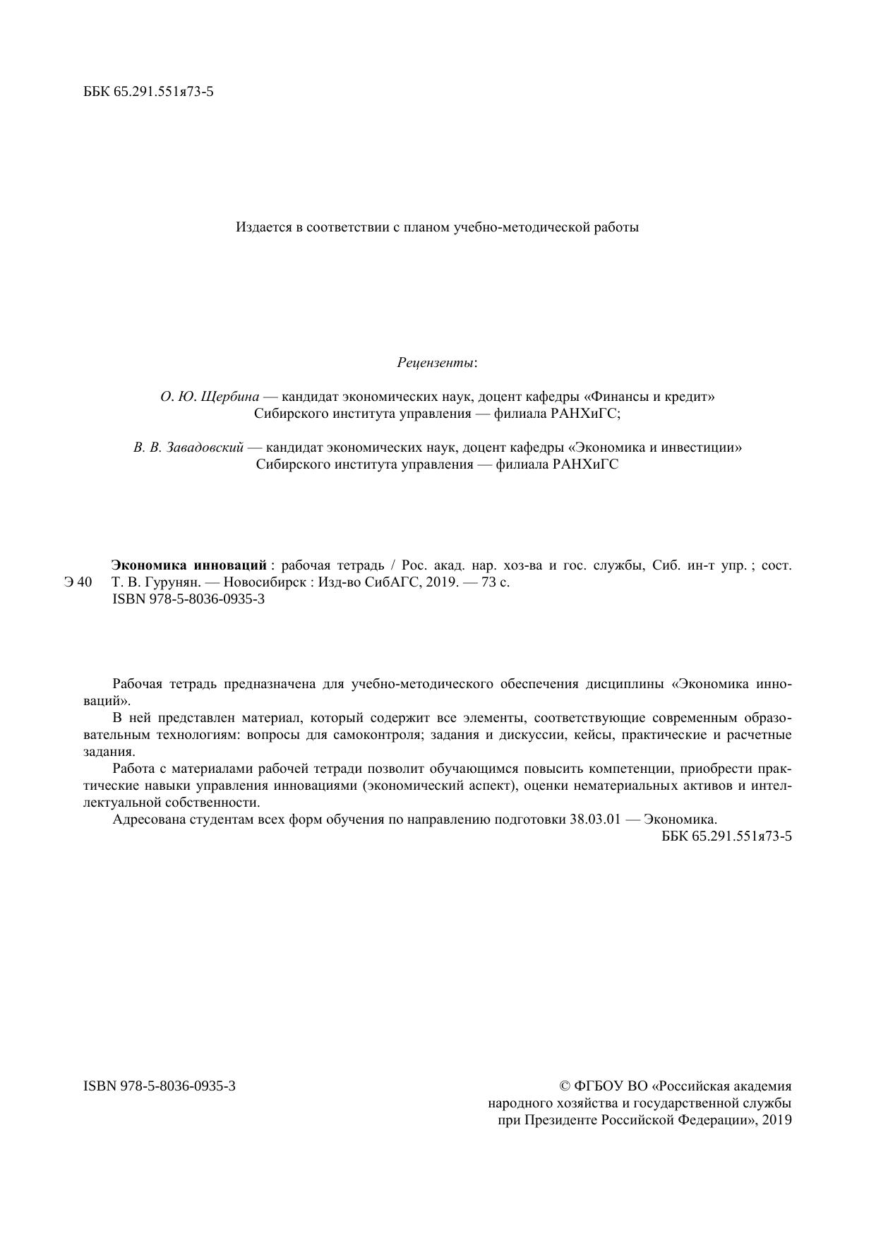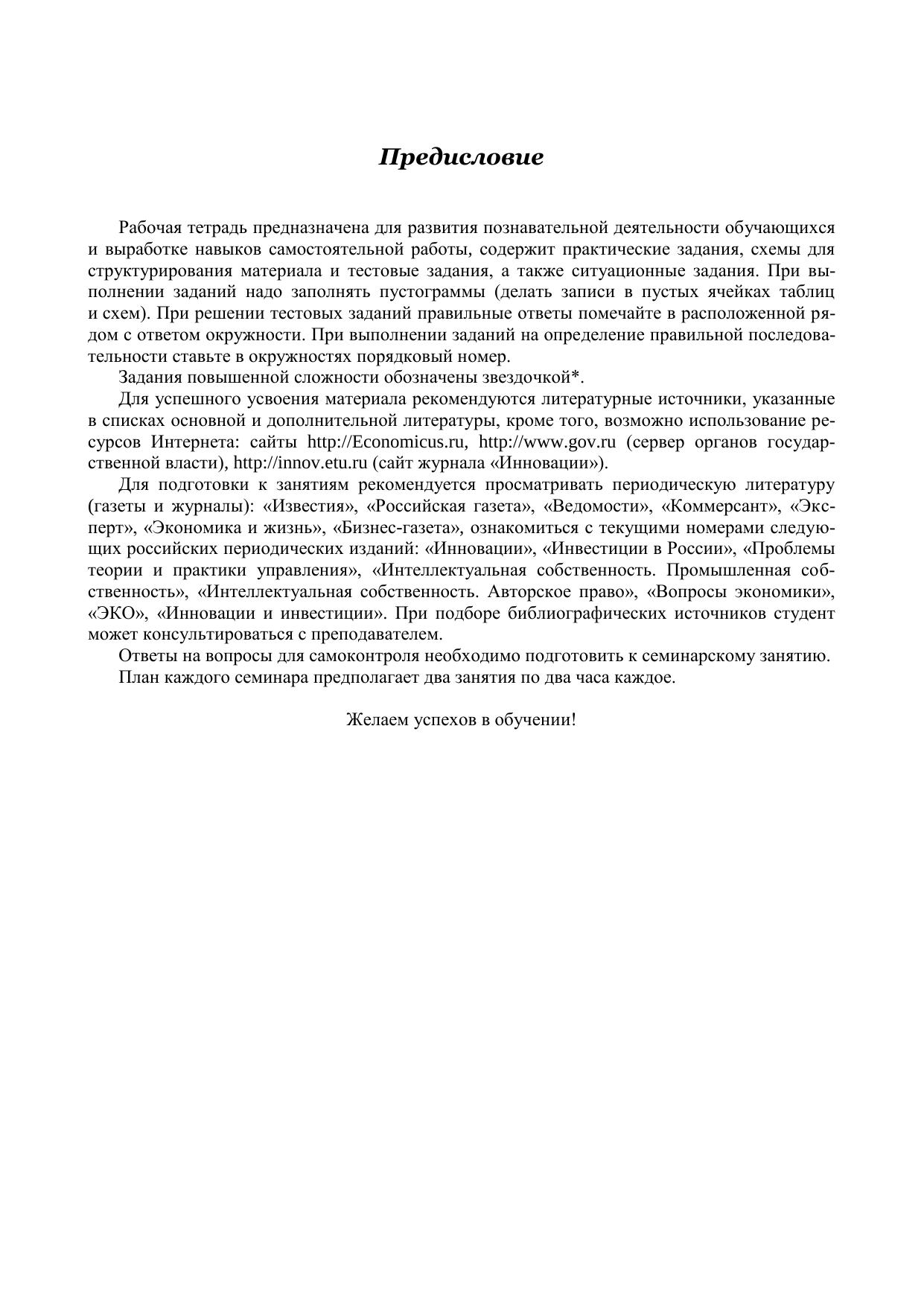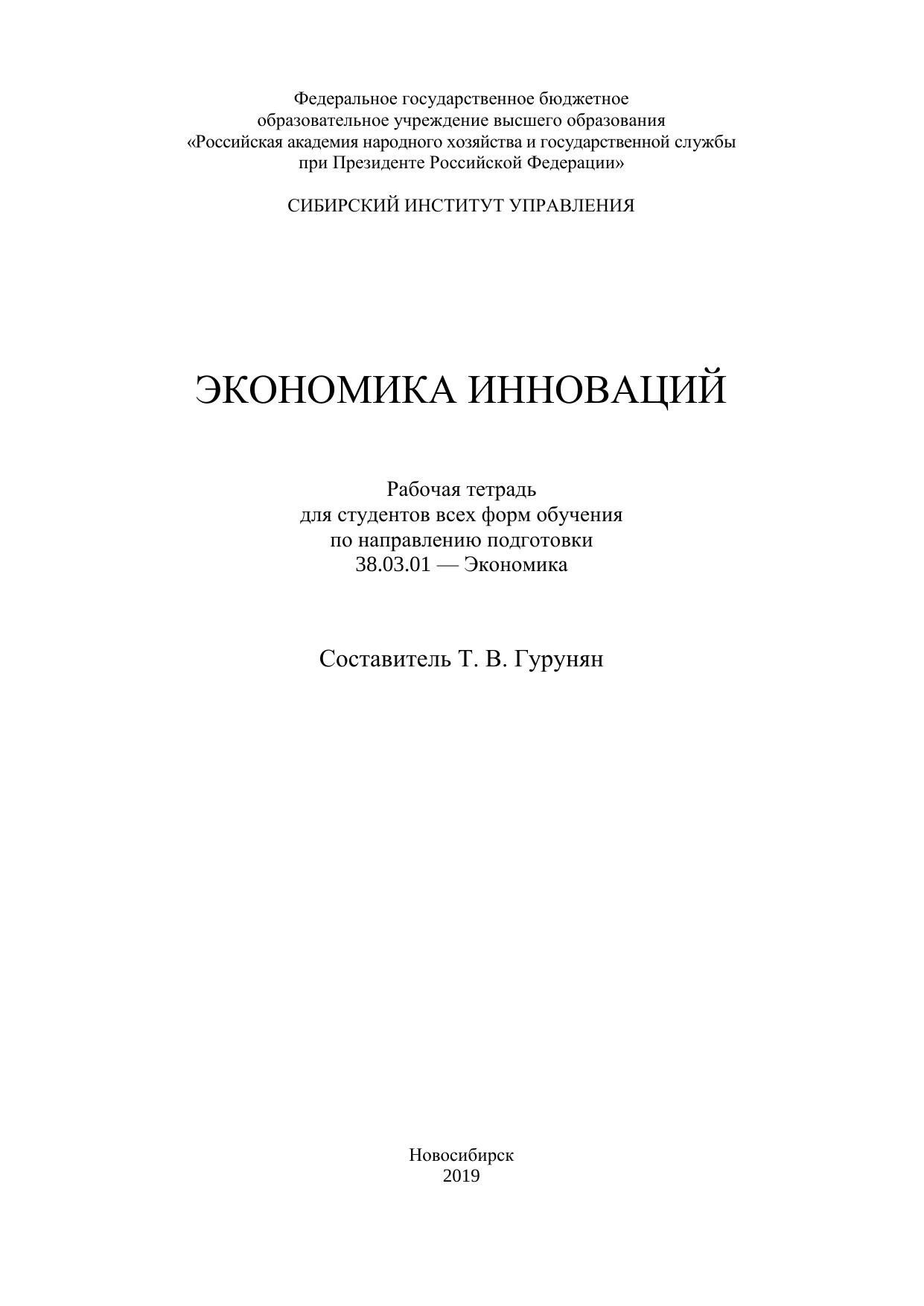 Рабочая тетрадь предназначена для учебно-методического обеспечения дисциплины «Экономика инно-ваций». В ней представлен материал, который содержит все элементы, соответствующие современным образо-вательным технологиям: вопросы для самоконтроля; задания и дискуссии, кейсы, практические и расчетные задания. Работа с материалами рабочей тетради позволит обучающимся повысить компетенции, приобрести прак-тические навыки управления инновациями (экономический аспект), оценки нематериальных активов и интел-лектуальной собственности. Адресована студентам всех форм обучения по направлению подготовки 38.03.01 — Экономика.