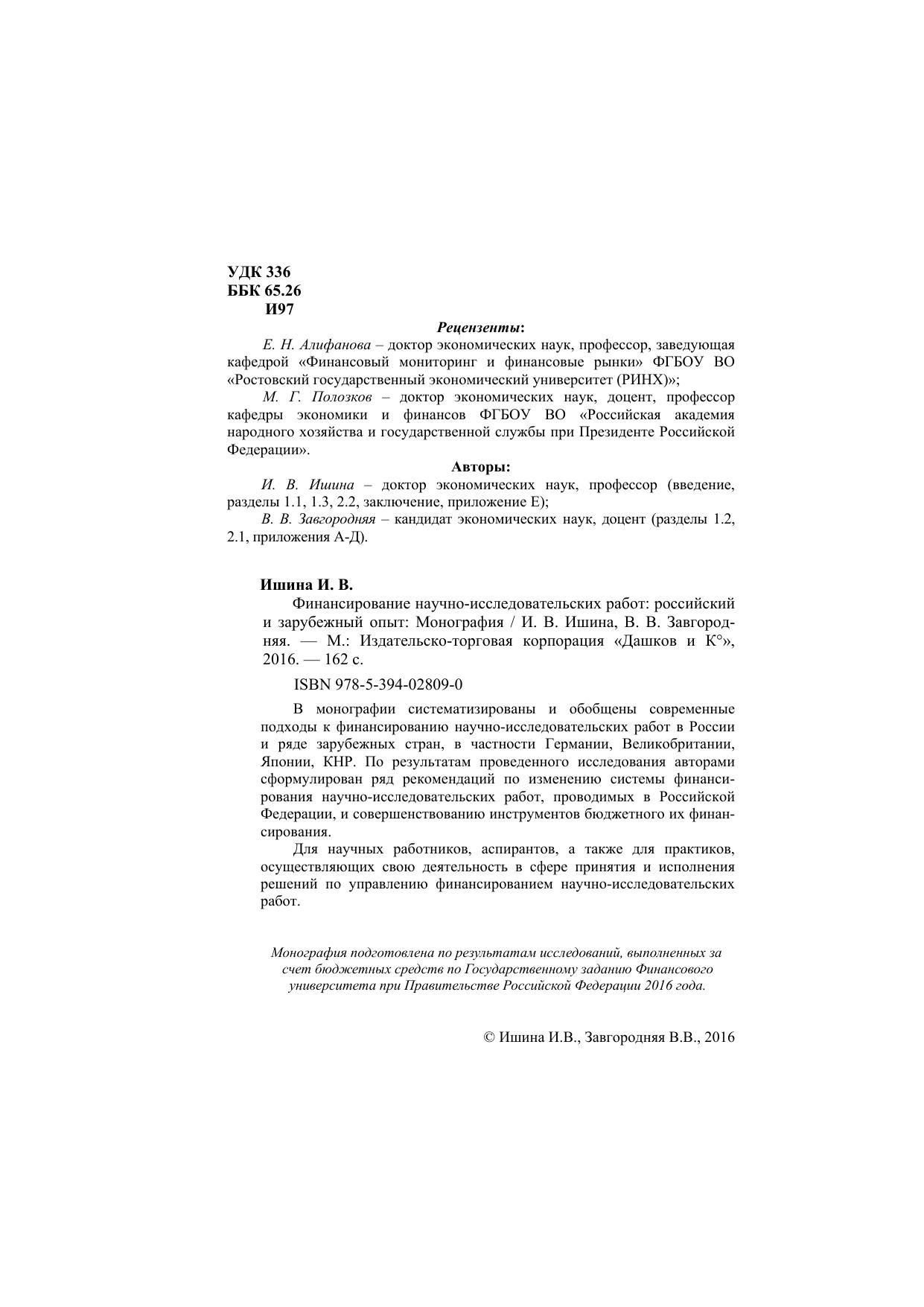 В монографии систематизированы и обобщены современные подходы к финансированию научно-исследовательских работ в России и ряде зарубежных стран, в частности Германии, Великобритании, Японии, КНР. По результатам проведенного исследования авторами сформулирован ряд рекомендаций по изменению системы финансирования научно-исследовательских работ, проводимых в Российской Федерации, и совершенствованию инструментов бюджетного их финансирования.