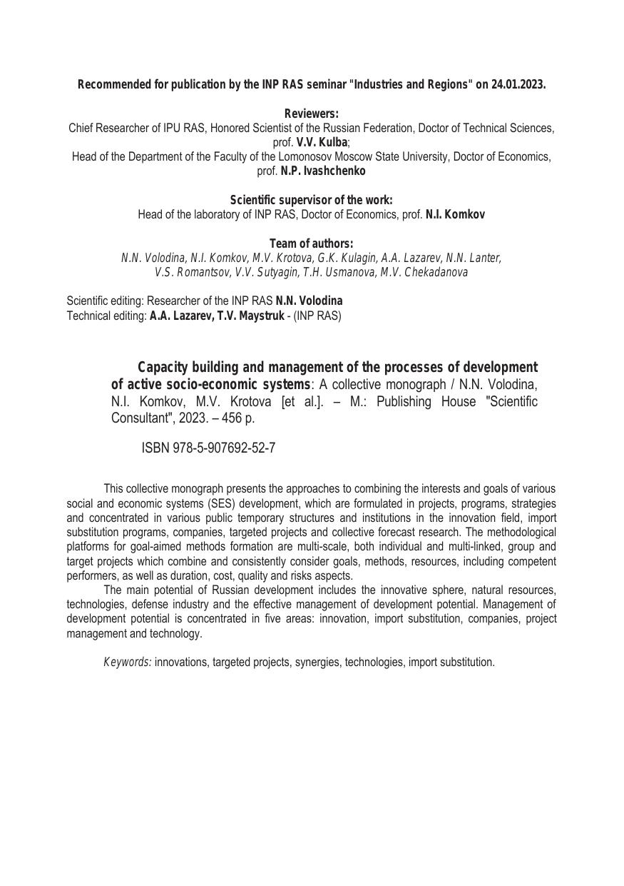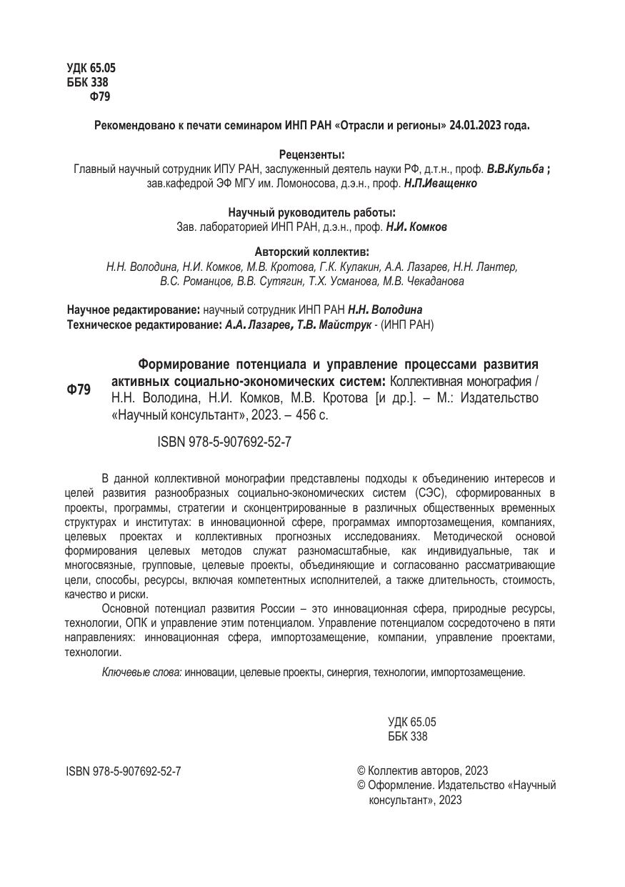 В данной коллективной монографии представлены подходы к объединению интересов и целей развития разнообразных социально-экономических систем (СЭС), сформированных в проекты, программы, стратегии и сконцентрированные в различных общественных временных структурах и институтах: в инновационной сфере, программах импортозамещения, компаниях, целевых проектах и коллективных прогнозных исследованиях. Методической основой формирования целевых методов служат разномасштабные, как индивидуальные, так и многосвязные, групповые, целевые проекты, объединяющие и согласованно рассматривающие цели, способы, ресурсы, включая компетентных исполнителей, а также длительность, стоимость, качество и риски.