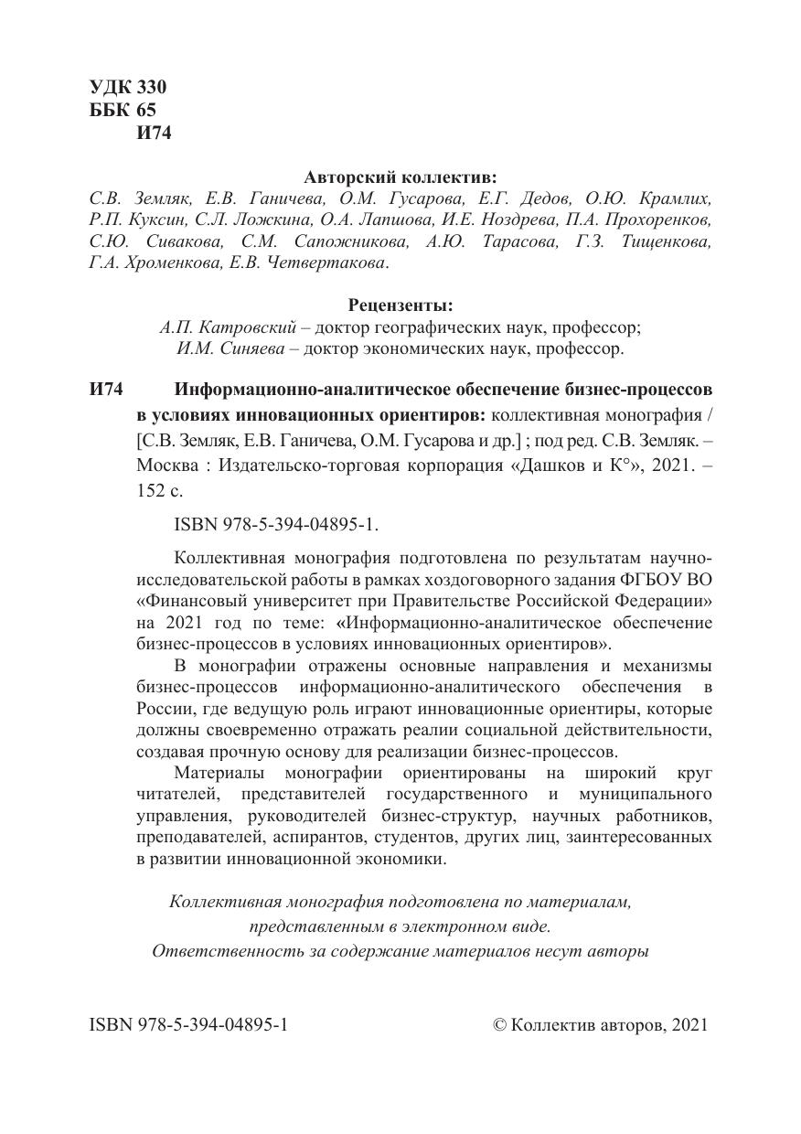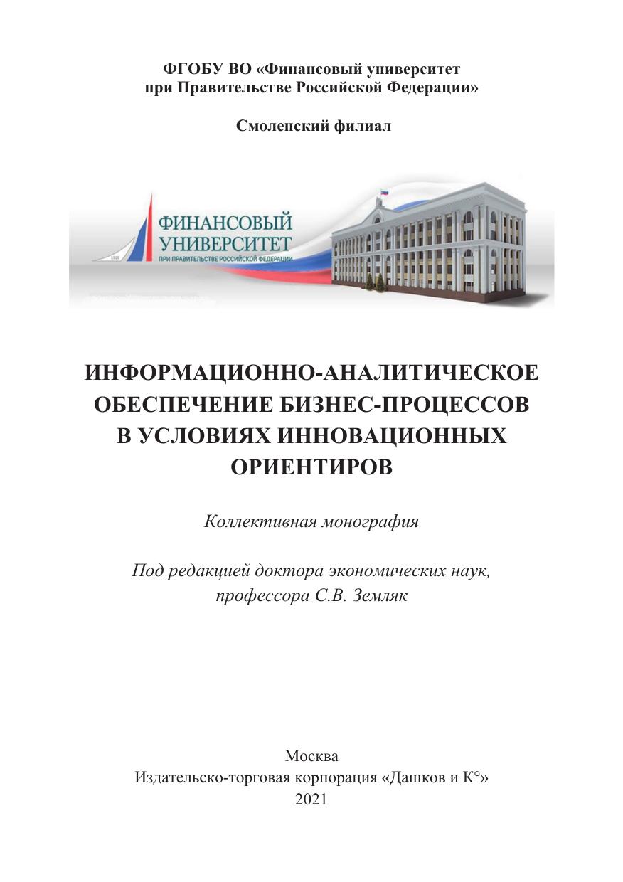 Коллективная монография подготовлена по результатам научно-исследовательской работы в рамках хоздоговорного задания ФГБОУ ВО «Финансовый университет при Правительстве Российской Федерации» на 2021 год по теме: «Информационно-аналитическое обеспечение бизнес-процессов в условиях инновационных ориентиров».