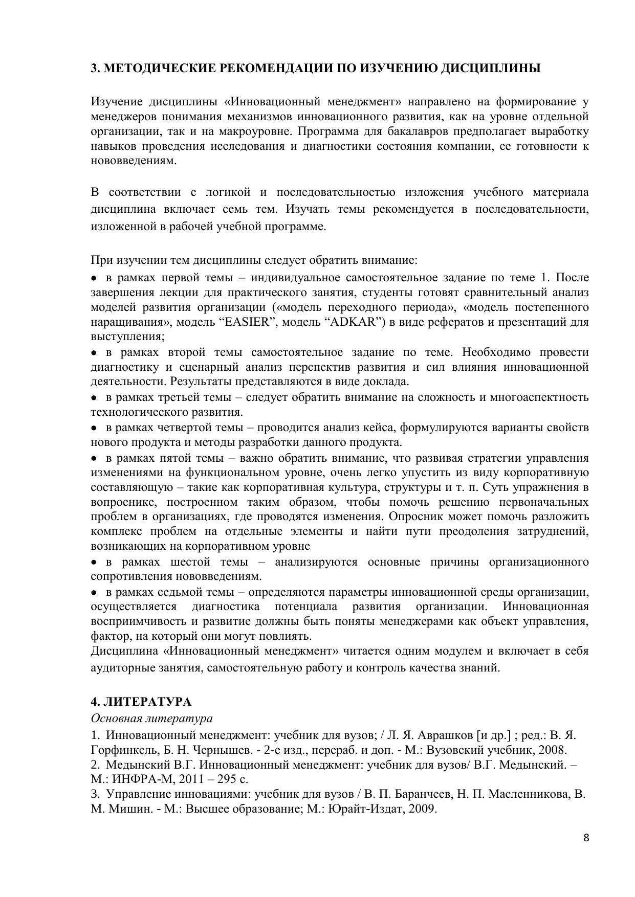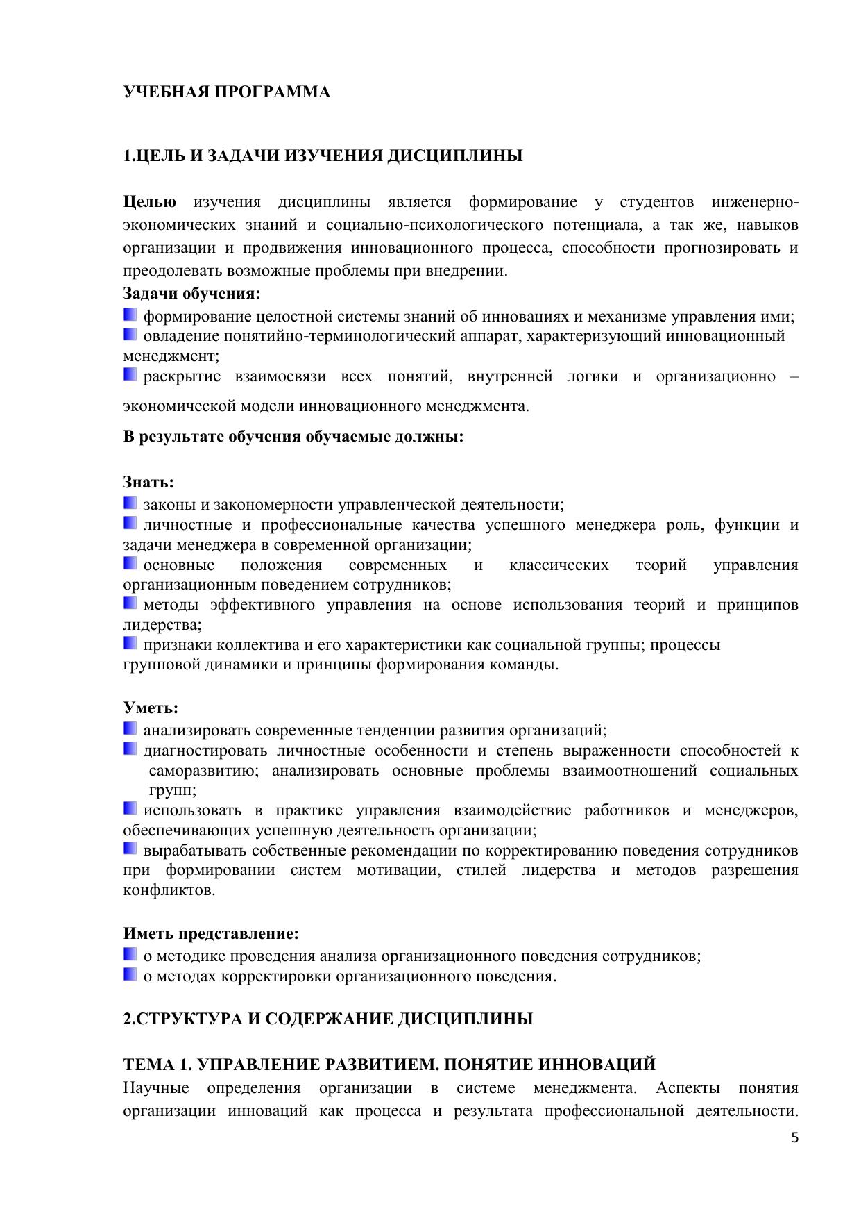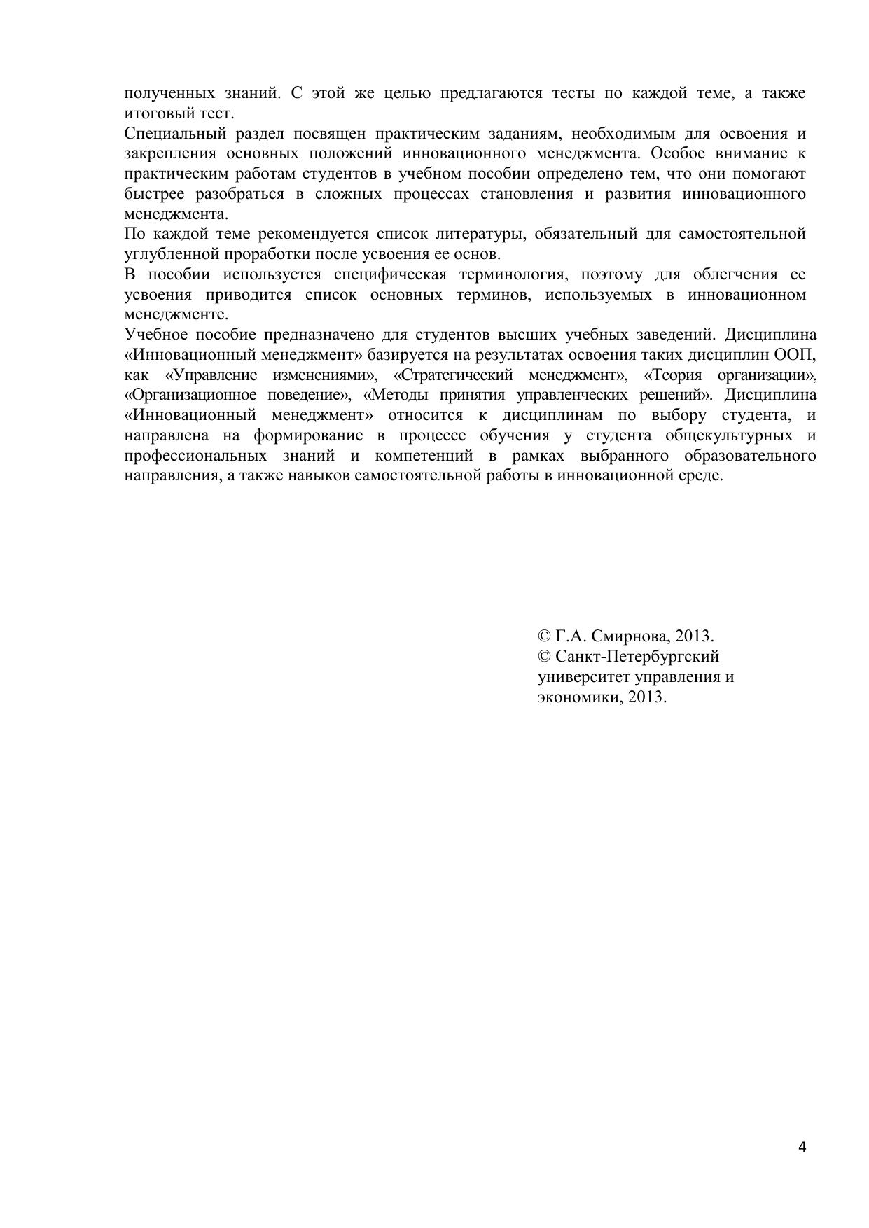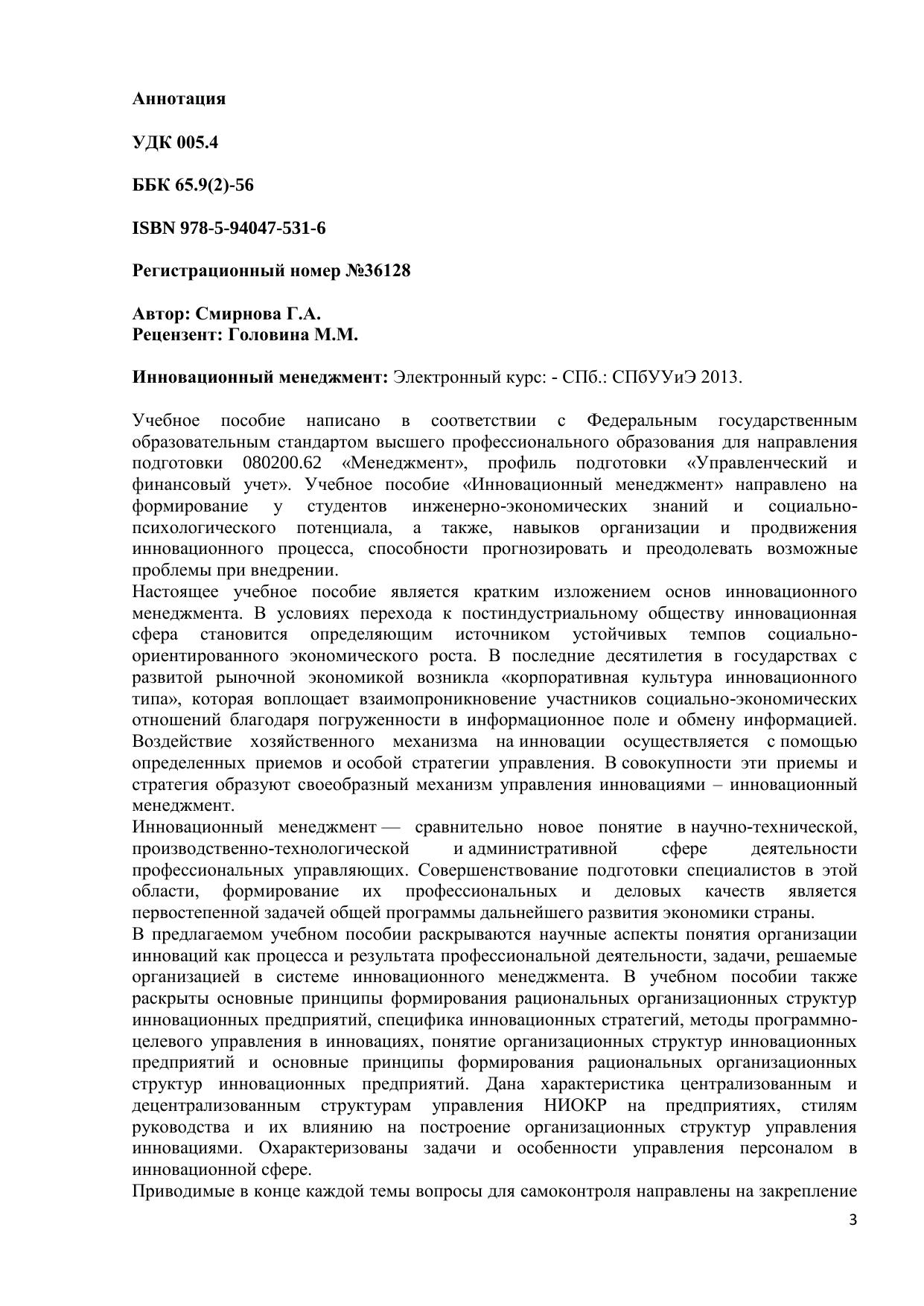 Учебное пособие написано в соответствии с Федеральным государственным образовательным стандартом высшего профессионального образования для направления подготовки 080200.62 «Менеджмент», профиль подготовки «Управленческий и финансовый учет». Учебное пособие «Инновационный менеджмент» направлено на формирование у студентов инженерно-экономических знаний и социально-психологического потенциала, а также, навыков организации и продвижения инновационного процесса, способности прогнозировать и преодолевать возможные проблемы при внедрении. Настоящее учебное пособие является кратким изложением основ инновационного менеджмента. В условиях перехода к постиндустриальному обществу инновационная сфера становится определяющим источником устойчивых темпов социально-ориентированного экономического роста. В последние десятилетия в государствах с развитой рыночной экономикой возникла «корпоративная культура инновационного типа», которая воплощает взаимопроникновение участников социально-экономических отношений благодаря погруженности в информационное поле и обмену информацией. Воздействие хозяйственного механизма на инновации осуществляется с помощью определенных приемов и особой стратегии управления. В совокупности эти приемы и стратегия образуют своеобразный механизм управления инновациями – инновационный менеджмент. Инновационный менеджмент — сравнительно новое понятие в научно-технической, производственно-технологической и административной сфере деятельности профессиональных управляющих. Совершенствование подготовки специалистов в этой области, формирование их профессиональных и деловых качеств является первостепенной задачей общей программы дальнейшего развития экономики страны. В предлагаемом учебном пособии раскрываются научные аспекты понятия организации инноваций как процесса и результата профессиональной деятельности, задачи, решаемые организацией в системе инновационного менеджмента. В учебном пособии также раскрыты основные принципы формирования рациональных организационных структур инновационных предприятий, специфика инновационных стратегий, методы программно-целевого управления в инновациях, понятие организационных структур инновационных предприятий и основные принципы формирования рациональных организационных структур инновационных предприятий. Дана характеристика централизованным и децентрализованным структурам управления НИОКР на предприятиях, стилям руководства и их влиянию на построение организационных структур управления инновациями. Охарактеризованы задачи и особенности управления персоналом в инновационной сфере. Приводимые в конце каждой темы вопросы для самоконтроля направлены на закрепление полученных знаний. С этой же целью предлагаются тесты по каждой теме, а также итоговый тест. Специальный раздел посвящен практическим заданиям, необходимым для освоения и закрепления основных положений инновационного менеджмента. Особое внимание к практическим работам студентов в учебном пособии определено тем, что они помогают быстрее разобраться в сложных процессах становления и развития инновационного менеджмента. По каждой теме рекомендуется список литературы, обязательный для самостоятельной углубленной проработки после усвоения ее осн