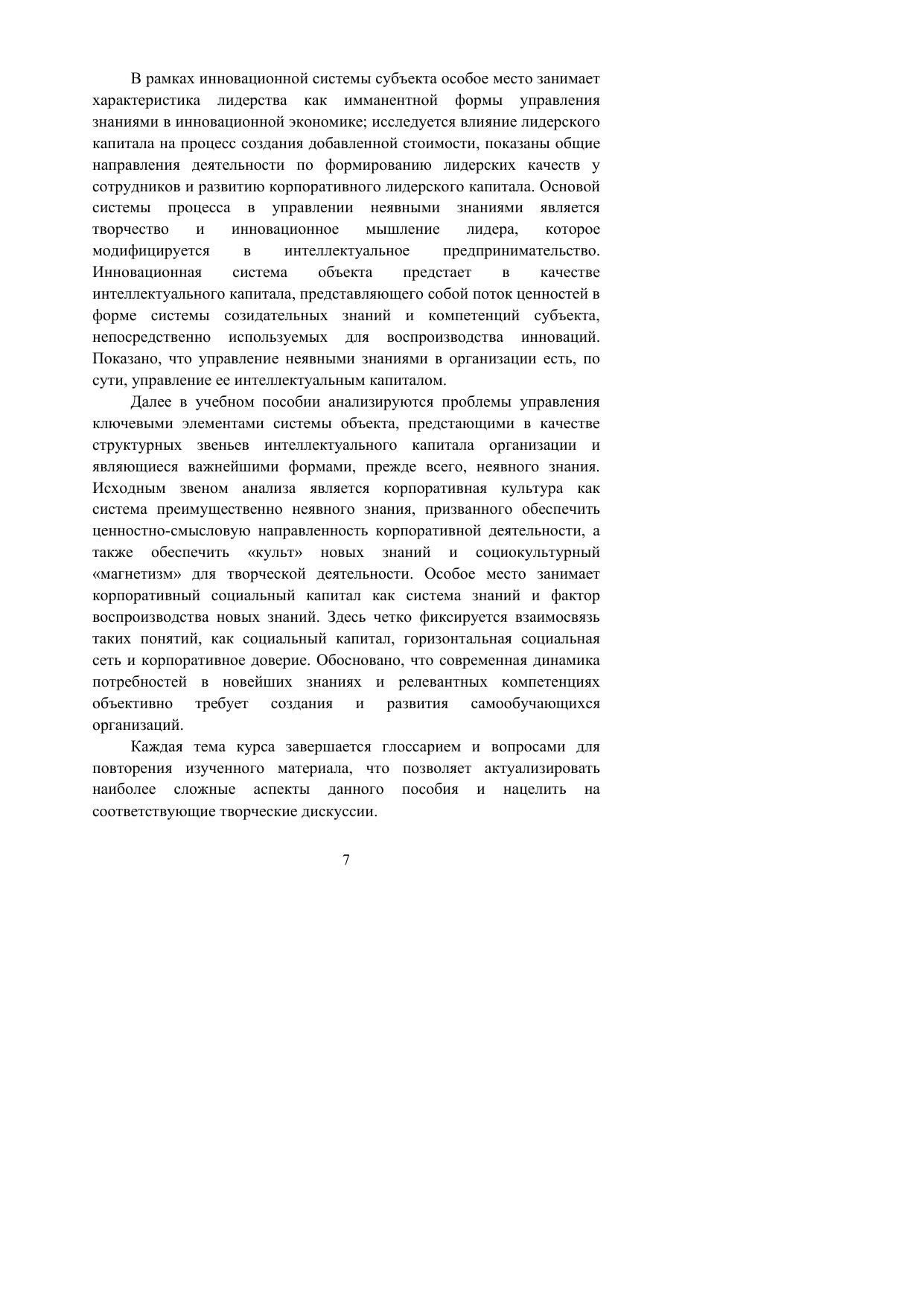В учебном пособии анализируются ключевые аспекты воспроизводства и рынка знаний. Раскрывается ключевая роль неявного знания в инновационной деятельности современных предприятий, а также характеризуются формы корпоративного интеллектуального капитала в современной экономике. Показана роль системной парадигмы в формировании механизма управления корпоративными знаниями. В качестве субъектной основы повышения эффективности управления знаниями в организации рассматривается система лидерства. Предлагается методика формирования и развития самообучающейся организации. Для преподавателей и студентов высших учебных заведений, изучающих комплекс экономических и управленческих дисциплин. Практические рекомендации могут быть использованы управленческими кадрами для организации корпоративного самообучения.