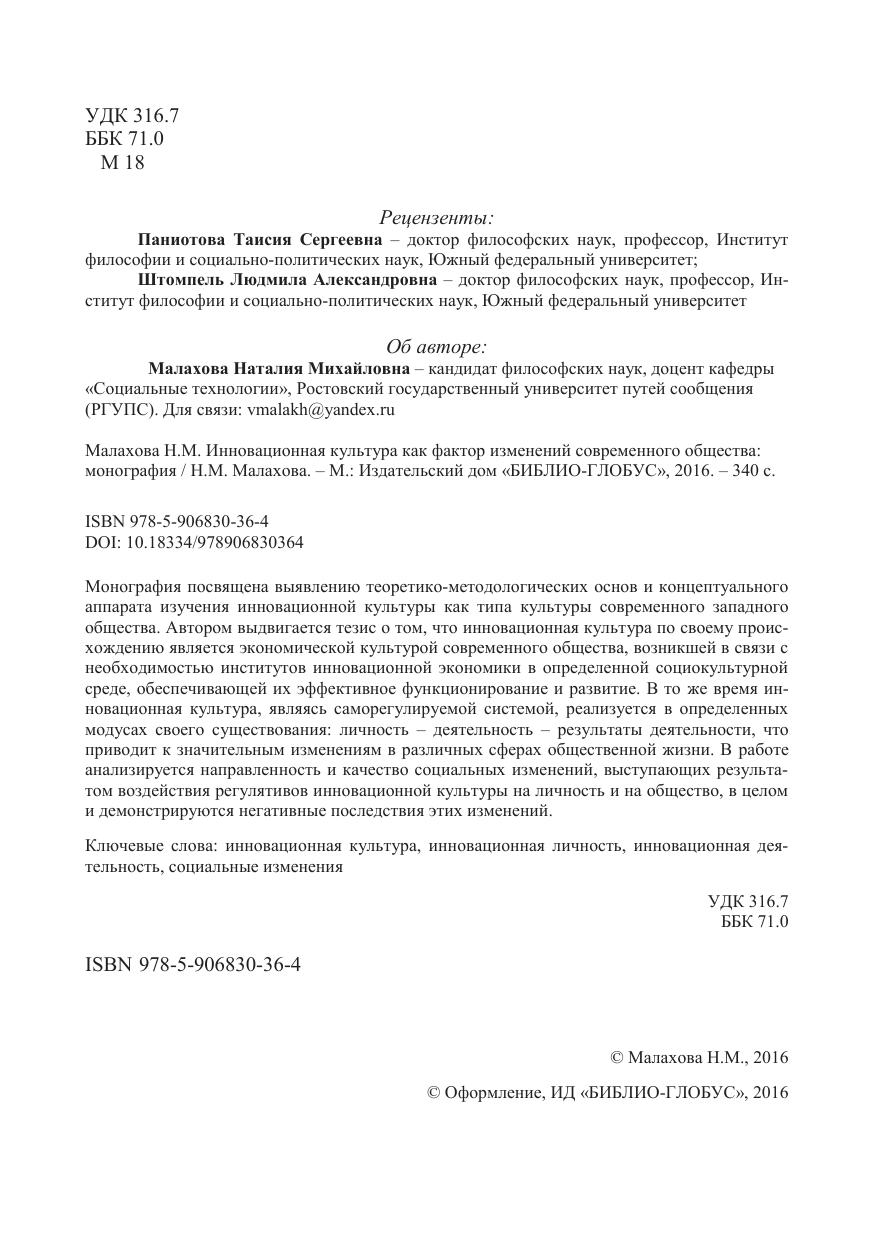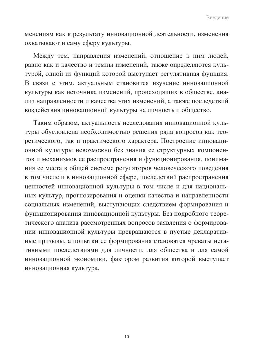 Монография посвящена выявлению теоретико-методологических основ и концептуального аппарата изучения инновационной культуры как типа культуры современного западного общества. Автором выдвигается тезис о том, что инновационная культура по своему происхождению является экономической культурой современного общества, возникшей в связи с необходимостью институтов инновационной экономики в определенной социокультурной среде, обеспечивающей их эффективное функционирование и развитие. В то же время инновационная культура, являясь саморегулируемой системой, реализуется в определенных модусах своего существования: личность – деятельность – результаты деятельности, что приводит к значительным изменениям в различных сферах общественной жизни. В работе анализируется направленность и качество социальных изменений, выступающих результатом воздействия регулятивов инновационной культуры на личность и на общество, в целом и демонстрируются негативные последствия этих изменений.