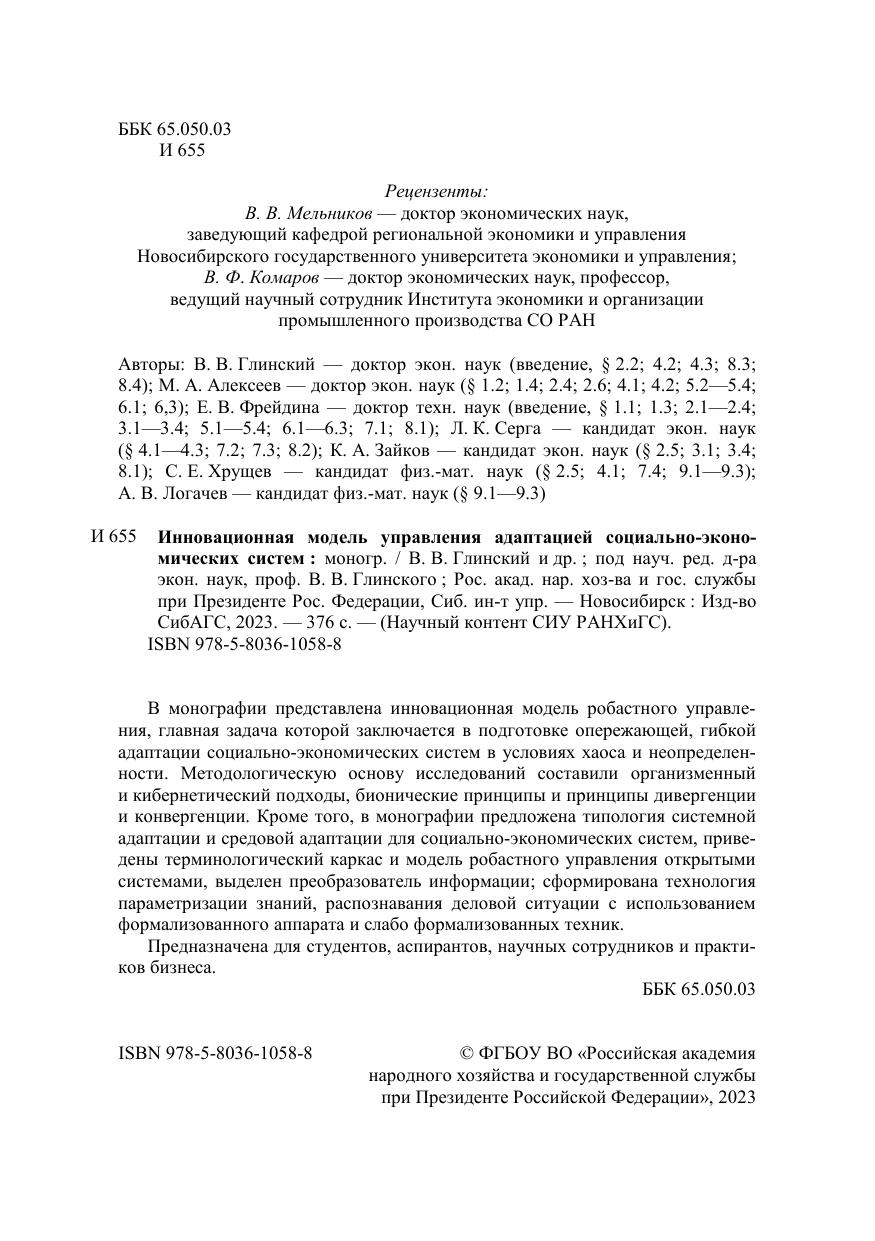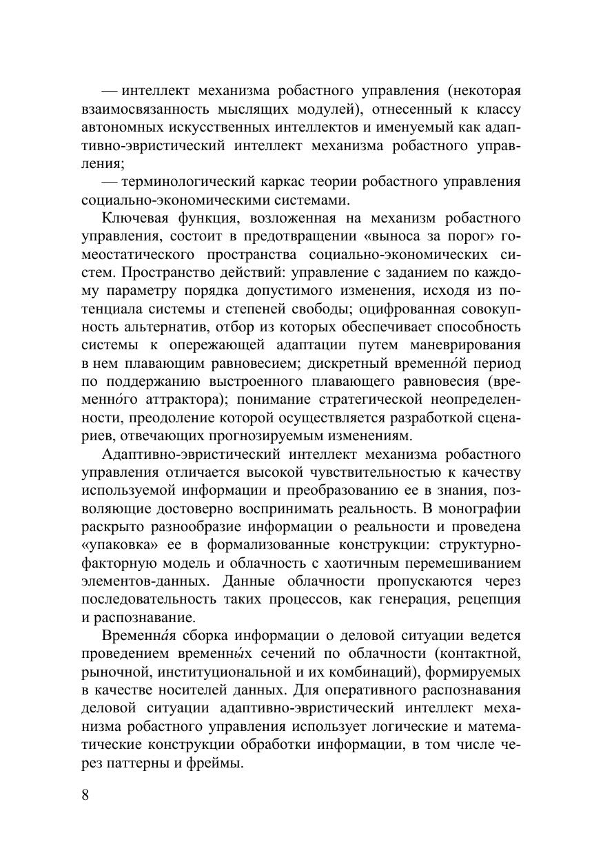 В монографии представлена инновационная модель робастного управле-ния, главная задача которой заключается в подготовке опережающей, гибкой адаптации социально-экономических систем в условиях хаоса и неопределен-ности. Методологическую основу исследований составили организменный и кибернетический подходы, бионические принципы и принципы дивергенции и конвергенции. Кроме того, в монографии предложена типология системной адаптации и средовой адаптации для социально-экономических систем, приве-дены терминологический каркас и модель робастного управления открытыми системами, выделен преобразователь информации; сформирована технология параметризации знаний, распознавания деловой ситуации с использованием формализованного аппарата и слабо формализованных техник. Предназначена для студентов, аспирантов, научных сотрудников и практи-ков бизнеса.