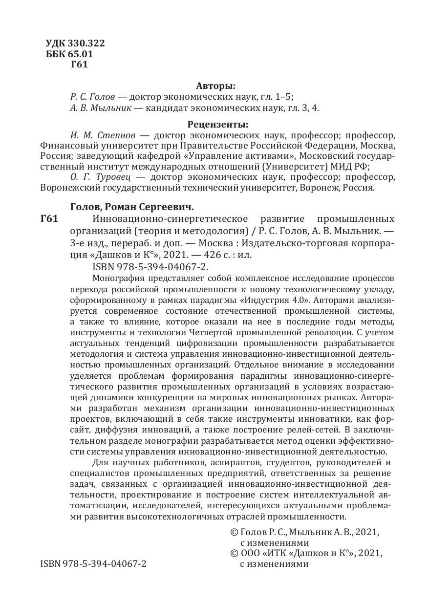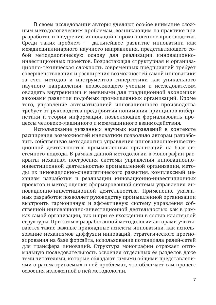 Книга посвящена разработке теории и методологии управления инновационно-инвестиционной деятельностью и инновационно-синергетическим развитием промышленных организаций на основе интеграции инновационных и инвестиционных процессов в условиях неопределенности и риска. В центре внимания теория и основы метод логической интеграции инноватики, синергетики, кибернетики, теории систем. На основе разработанного авторами подхода проведены синтез и формирование новой методологии управления инновационно-инвестиционной деятельностью, ее планирование, организация, контроллинг, анализ и регулирование в условиях неопределенности и риска. Показано развитие инновационно-синергетической парадигмы при росте инновационно-информационного потенциала человечества. Приводится метод оценки эффективности разработанной системы управления инновационно-инвестиционной деятельностью. Для научных работников, аспирантов, студентов, руководителей промышленных организаций, менеджеров, интересующихся синергетическими процессами и концепциями самоорганизации инновационно-инвестиционного развития организаций.