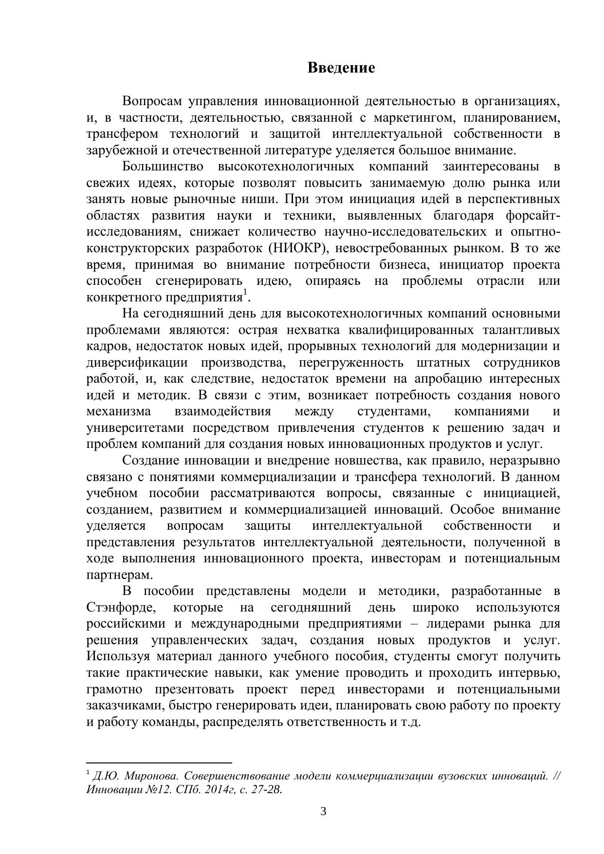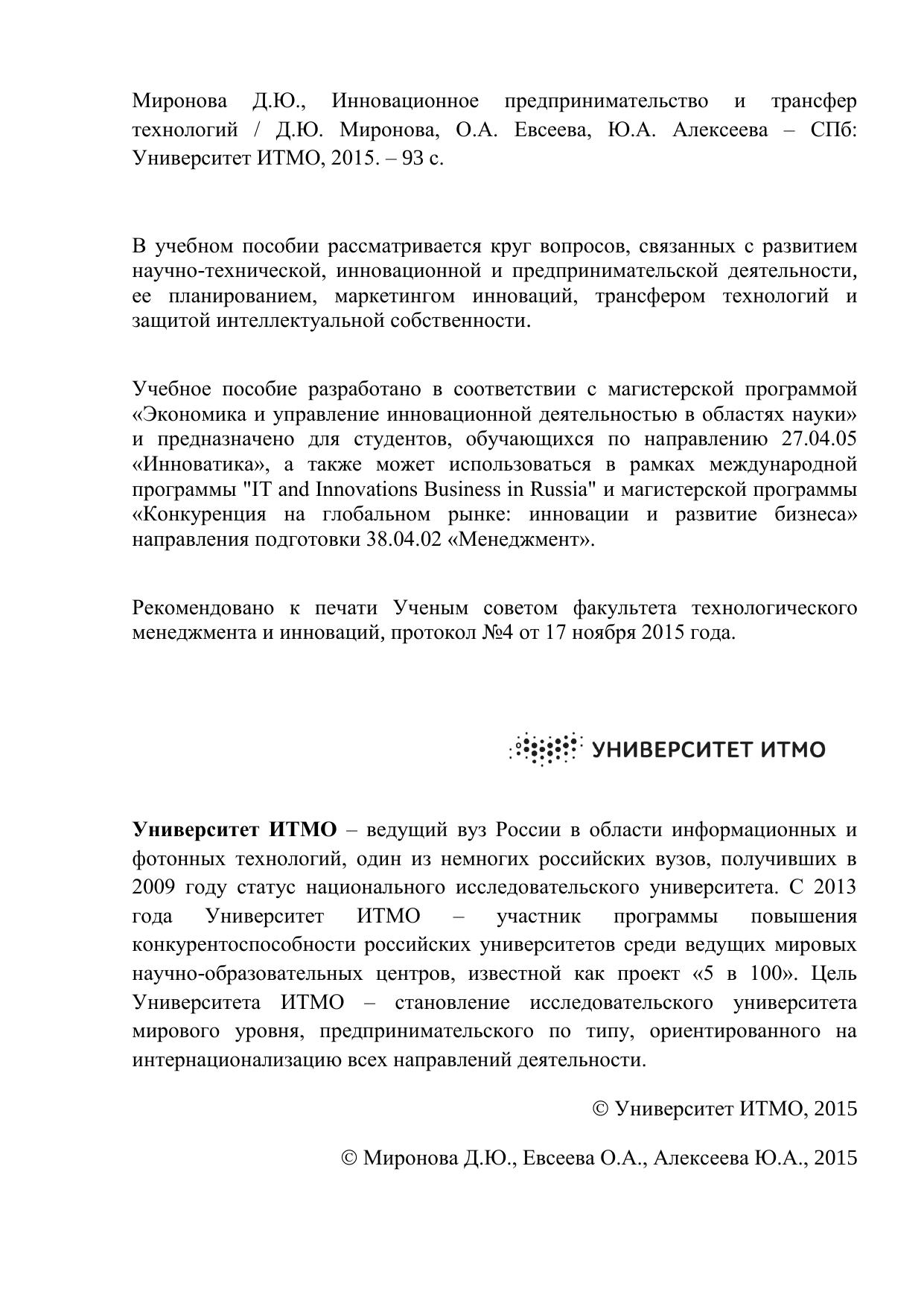 В учебном пособии рассматривается круг вопросов, связанных с развитием научно-технической, инновационной и предпринимательской деятельности, ее планированием, маркетингом инноваций, трансфером технологий и защитой интеллектуальной собственности. Учебное пособие разработано в соответствии с магистерской программой «Экономика и управление инновационной деятельностью в областях науки» и предназначено для студентов, обучающихся по направлению 27.04.05 «Инноватика», а также может использоваться в рамках международной программы "IT and Innovations Business in Russia" и магистерской программы «Конкуренция на глобальном рынке: инновации и развитие бизнеса» направления подготовки 38.04.02 «Менеджмент».
