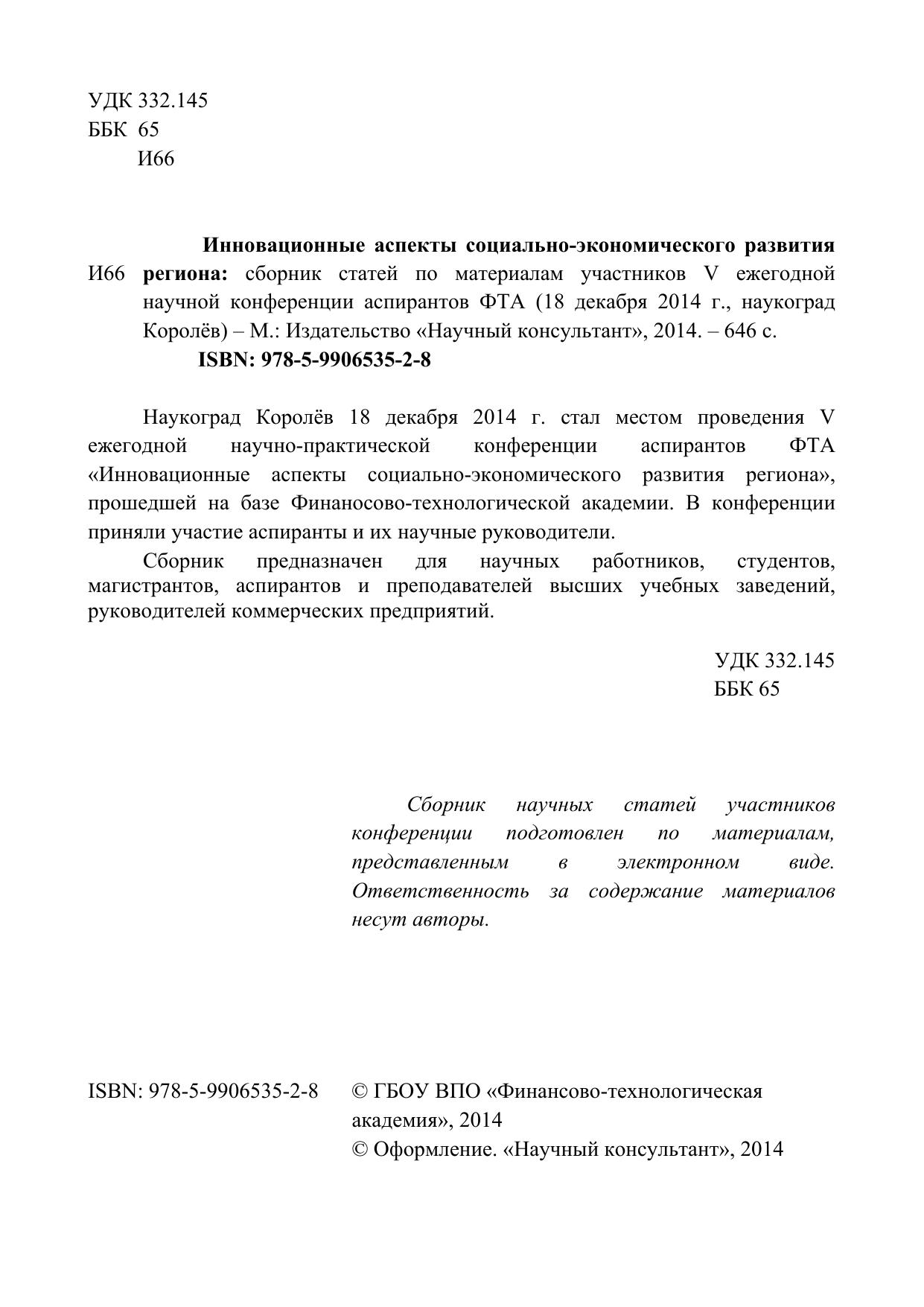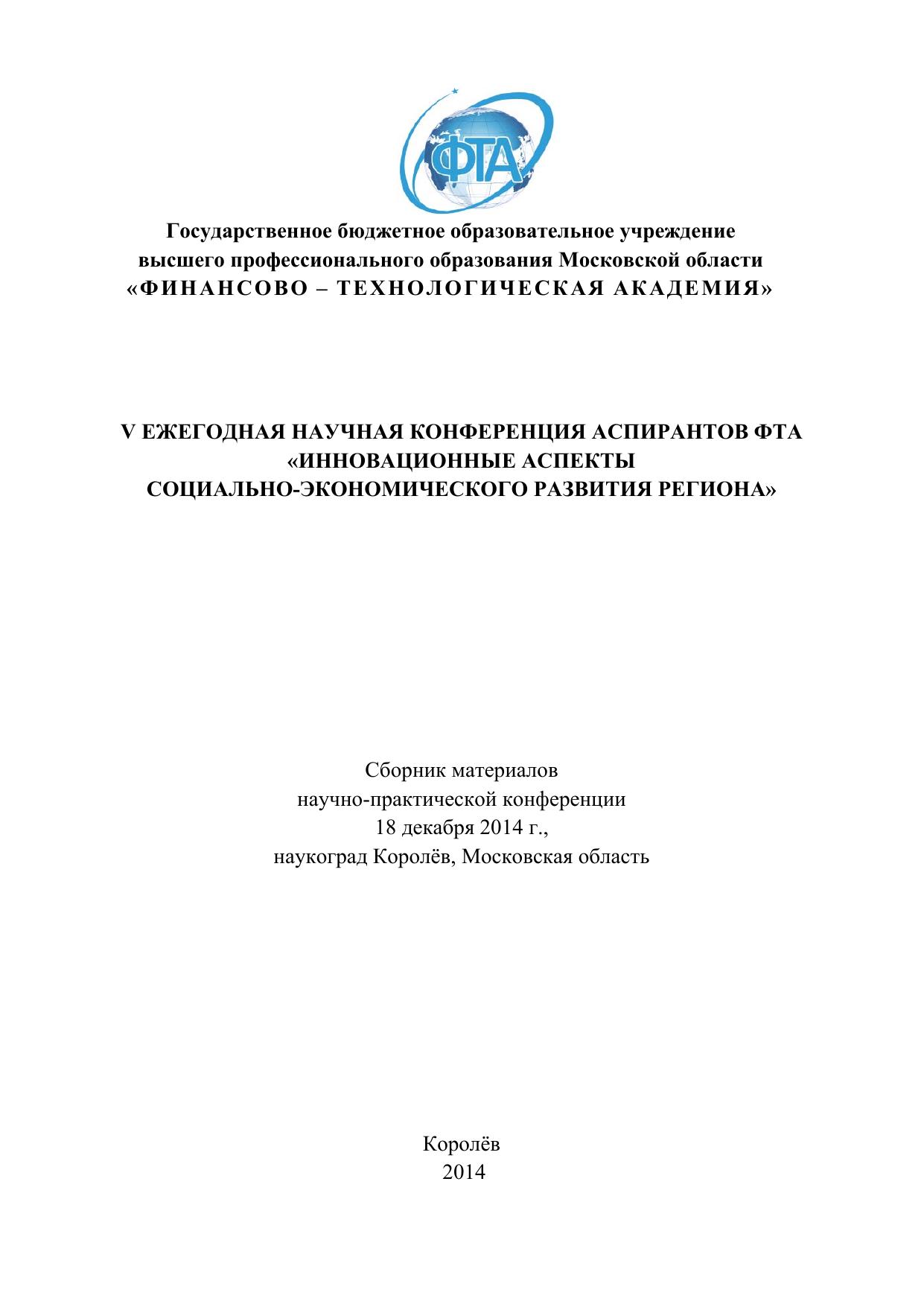 Инновационные аспекты социально-экономического развития региона: сборник статей по материалам участников V ежегодной научной конференции аспирантов ФТА (18 декабря 2014 г., наукоград Королёв)