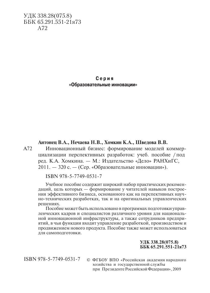 Серия Образовательные инновации. Учебное пособиесодержитширокийнаборпрактическихрекомендаций, цель которых — формирование у читателей навыков построения эффективного бизнеса, основанного как на перспективных научно-технических разработках, так и на оригинальных управленческих решениях. Пособиеможетбытьиспользовановпрограммахподготовкиуправленческих кадров и специалистов различного уровня для национальной инновационной инфраструктуры, а также сотрудников предприятий, в чьи функции входит управление разработкой, производством и продвижением нового продукта. Пособие также может использоваться для самоподготовки.