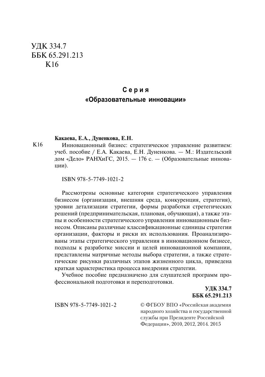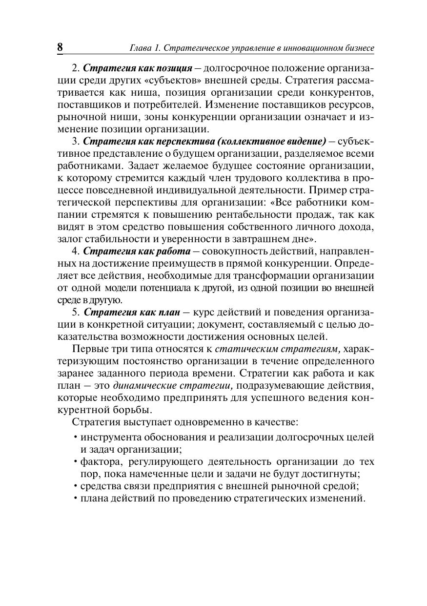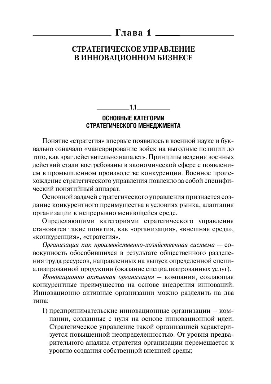 Серия Образовательные инновации. Рассмотрены основные категории стратегического управления бизнесом (организация, внешняя среда, конкуренция, стратегия), уровни детализации стратегии, формы разработки стретегических решений (предпринимательская, плановая, обучающая), а также этапы и особенности стратегического управления инновационным бизнесом. Описаны различные классификационные единицы стратегии организации, факторы и риски их использования. Проанализированы этапы стратегического управления в инновационном бизнесе, подходы к разработке миссии и целей инновационной компании, представлены матричные методы выбора стратегии, а также стратегические рисунки различных этапов жизненного цикла, приведена краткая характеристика процесса внедрения стратегии. Учебное пособие предназначено для слушателей программ профессиональной подготовки и переподготовки.