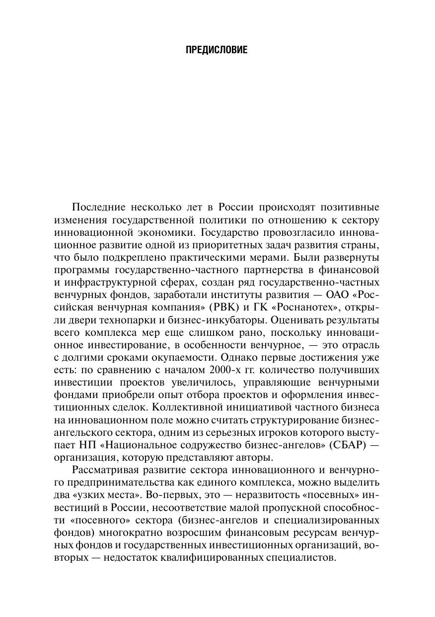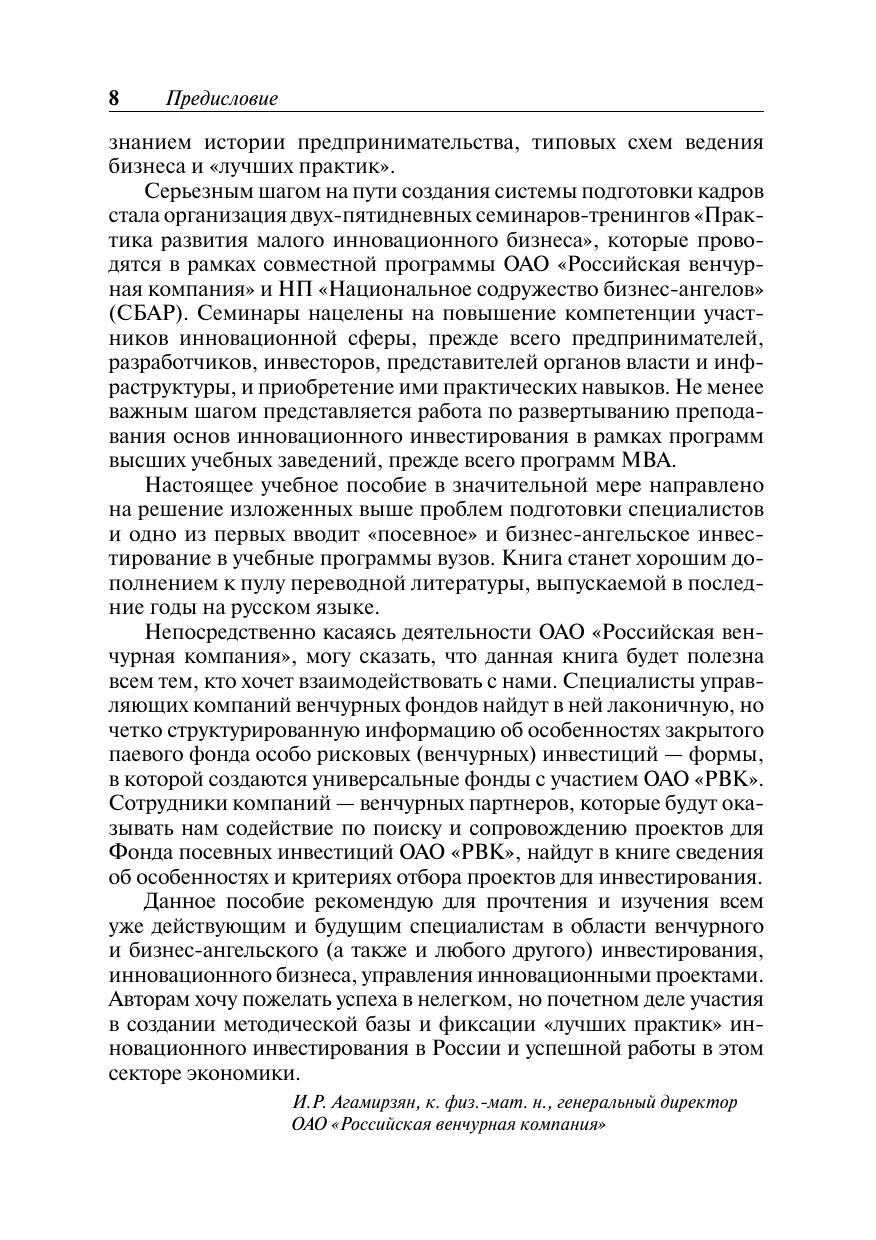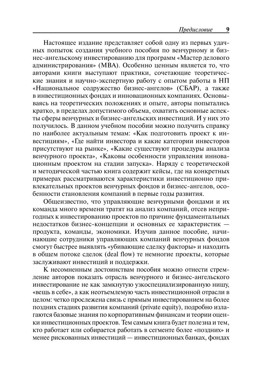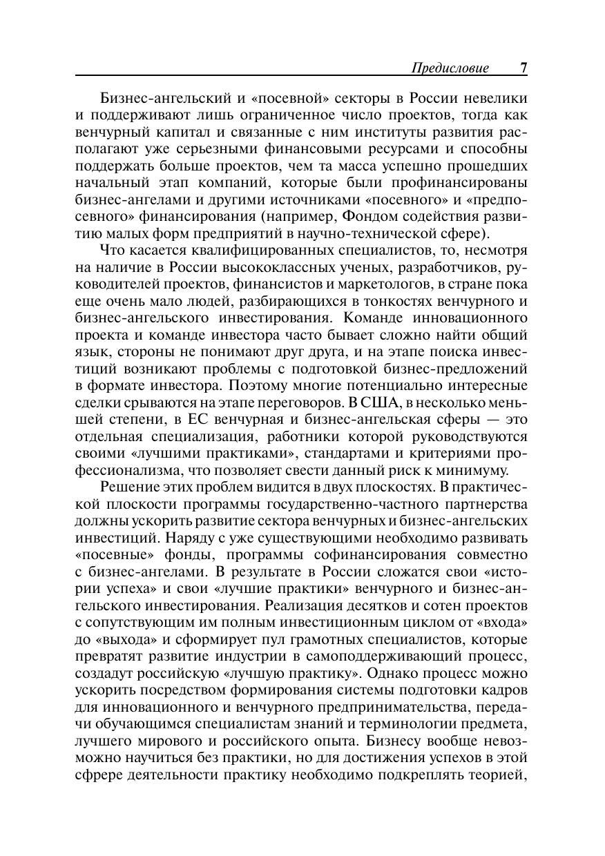 Серия Образовательные инновации. Учебное пособие знакомит с теоретическими основами и терминологией венчурного и бизнес-ангельского финансирования, практическими примерами осуществления инвестиционных проектов, процессом отбора инновационных компаний для инвестирования, навыками представления проекта инвестору и управления проинвестированными компаниями. Серьезное внимание уделяется бизнес-планированию и финансовому анализу эффективности венчурных и бизнес-ангельских инвестиций, задачам управления инновационной компанией от внесения инвестиций до «выхода» инвестора — продажи доли в проинвестированной компании с целью фиксации прибыли. Для студентов иаспирантов Российской академии народного хозяйства и государственной службы при Президенте РФ и других российских высших учебных заведений, а также для слушателей курсов профессиональной подготовки, переподготовки и повышения квалификации.
