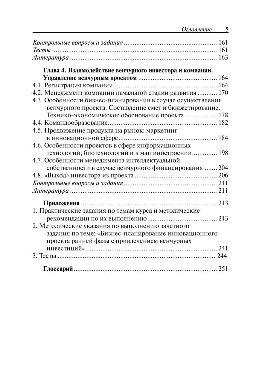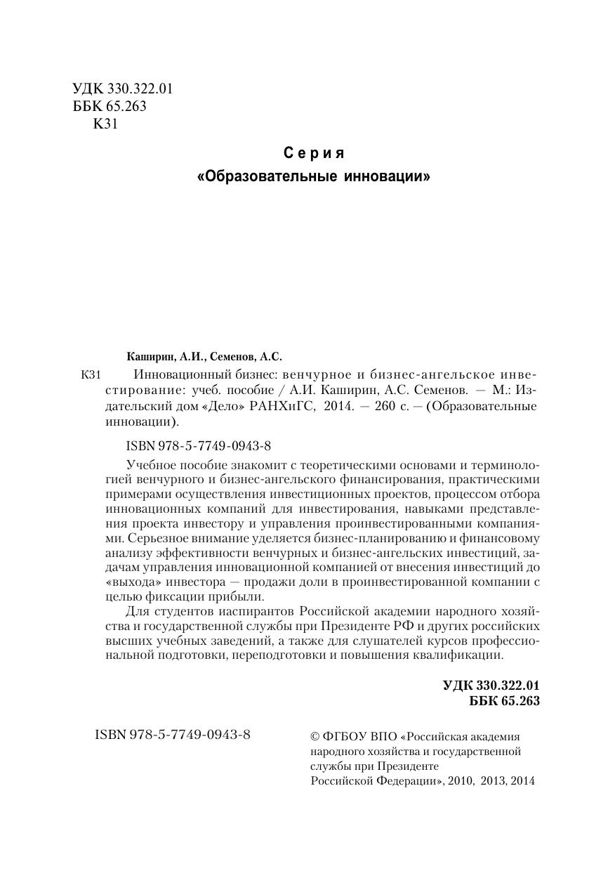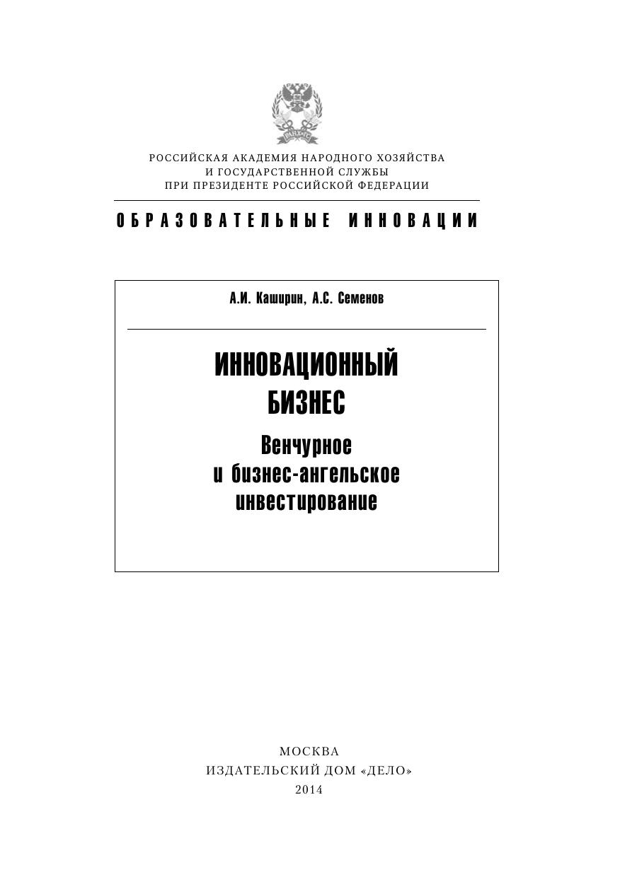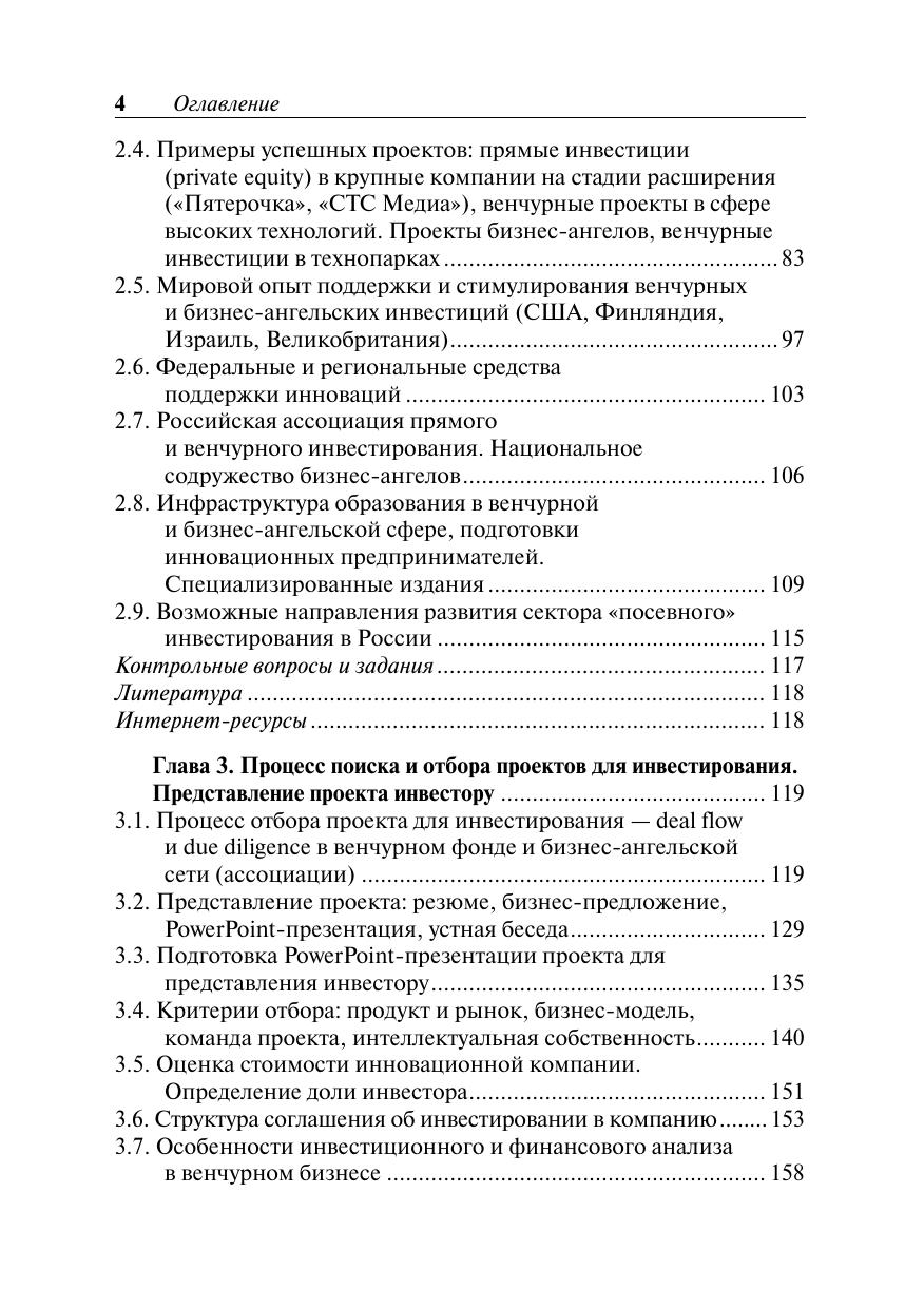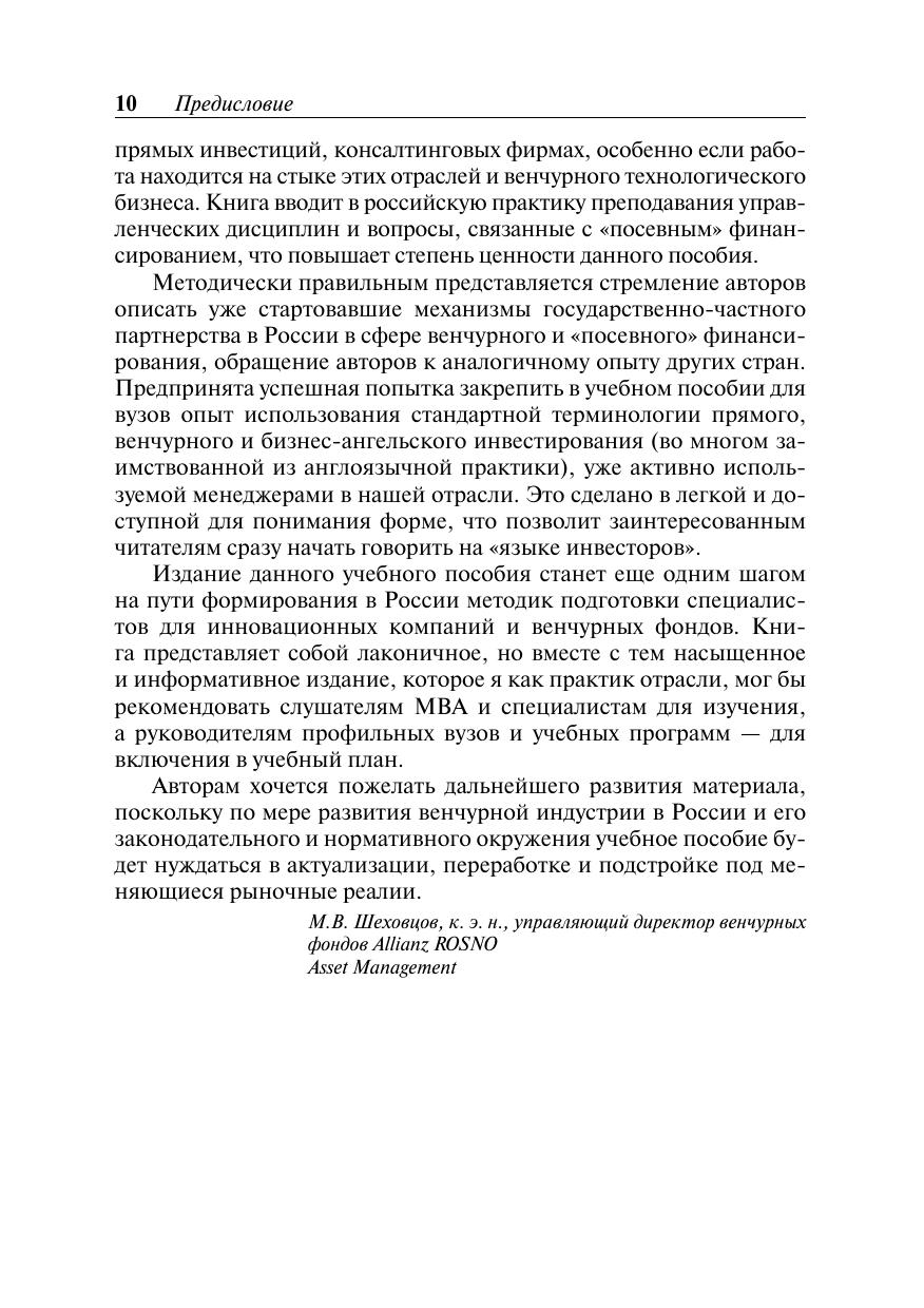 Серия Образовательные инновации. Учебное пособие знакомит с теоретическими основами и терминологией венчурного и бизнес-ангельского финансирования, практическими примерами осуществления инвестиционных проектов, процессом отбора инновационных компаний для инвестирования, навыками представления проекта инвестору и управления проинвестированными компаниями. Серьезное внимание уделяется бизнес-планированию и финансовому анализу эффективности венчурных и бизнес-ангельских инвестиций, задачам управления инновационной компанией от внесения инвестиций до «выхода» инвестора — продажи доли в проинвестированной компании с целью фиксации прибыли. Для студентов иаспирантов Российской академии народного хозяйства и государственной службы при Президенте РФ и других российских высших учебных заведений, а также для слушателей курсов профессиональной подготовки, переподготовки и повышения квалификации.
