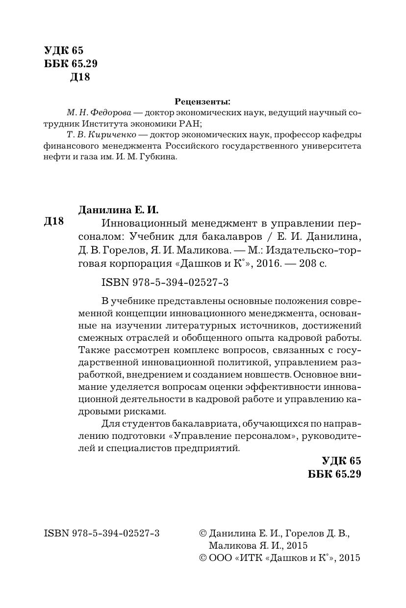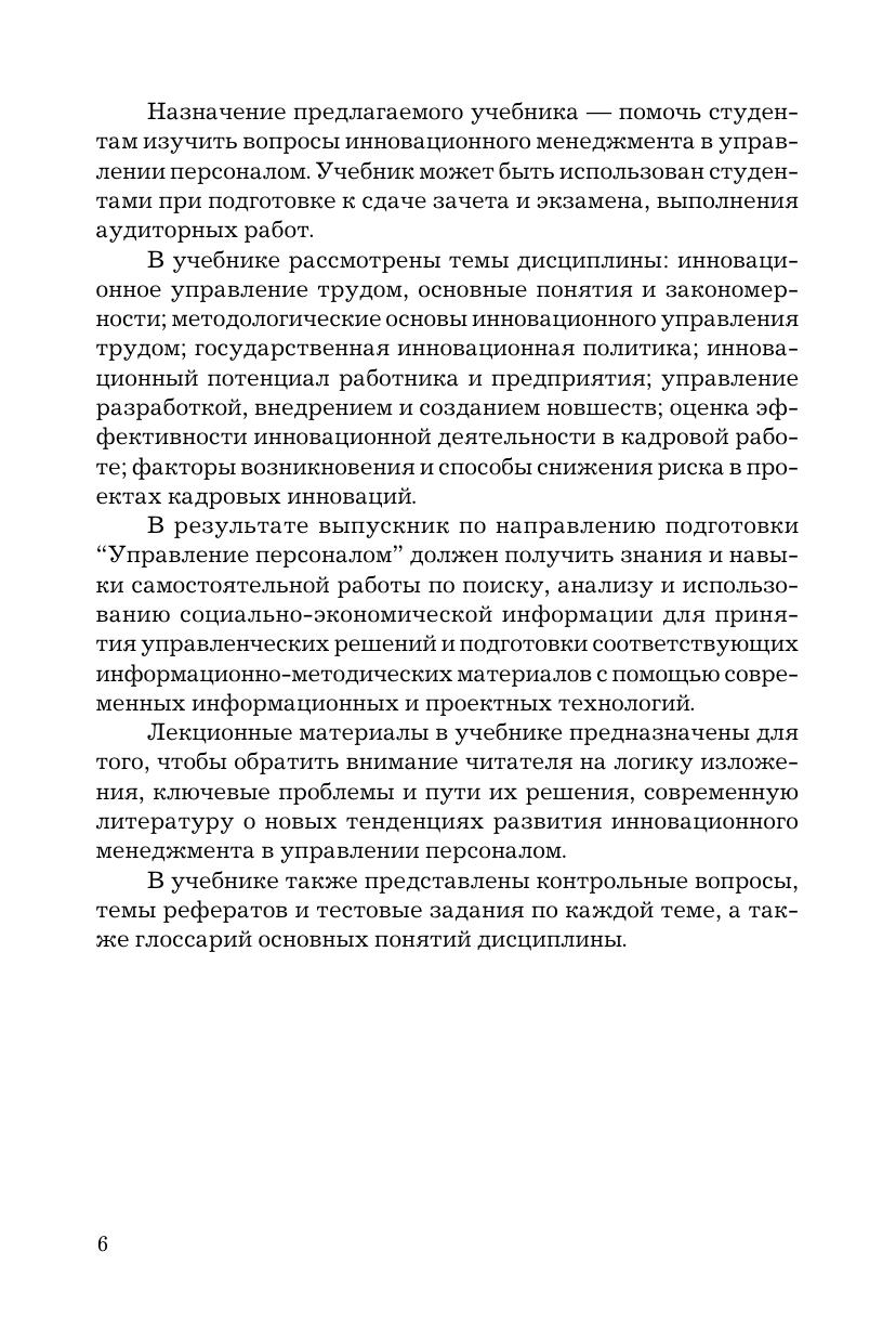 В учебнике представлены основные положения современной концепции инновационного менеджмента, основанные на изучении литературных источников, достижений смежных отраслей и обобщенного опыта кадровой работы. Также рассмотрен комплекс вопросов, связанных с государственной инновационной политикой, управлением разработкой, внедрением и созданием новшеств. Основное внимание уделяется вопросам оценки эффективности инновационной деятельности в кадровой работе и управлению кадровыми рисками. Для студентов бакалавриата, обучающихся по направлению подготовки "Управление персоналом", руководителей и специалистов предприятий. Гриф.