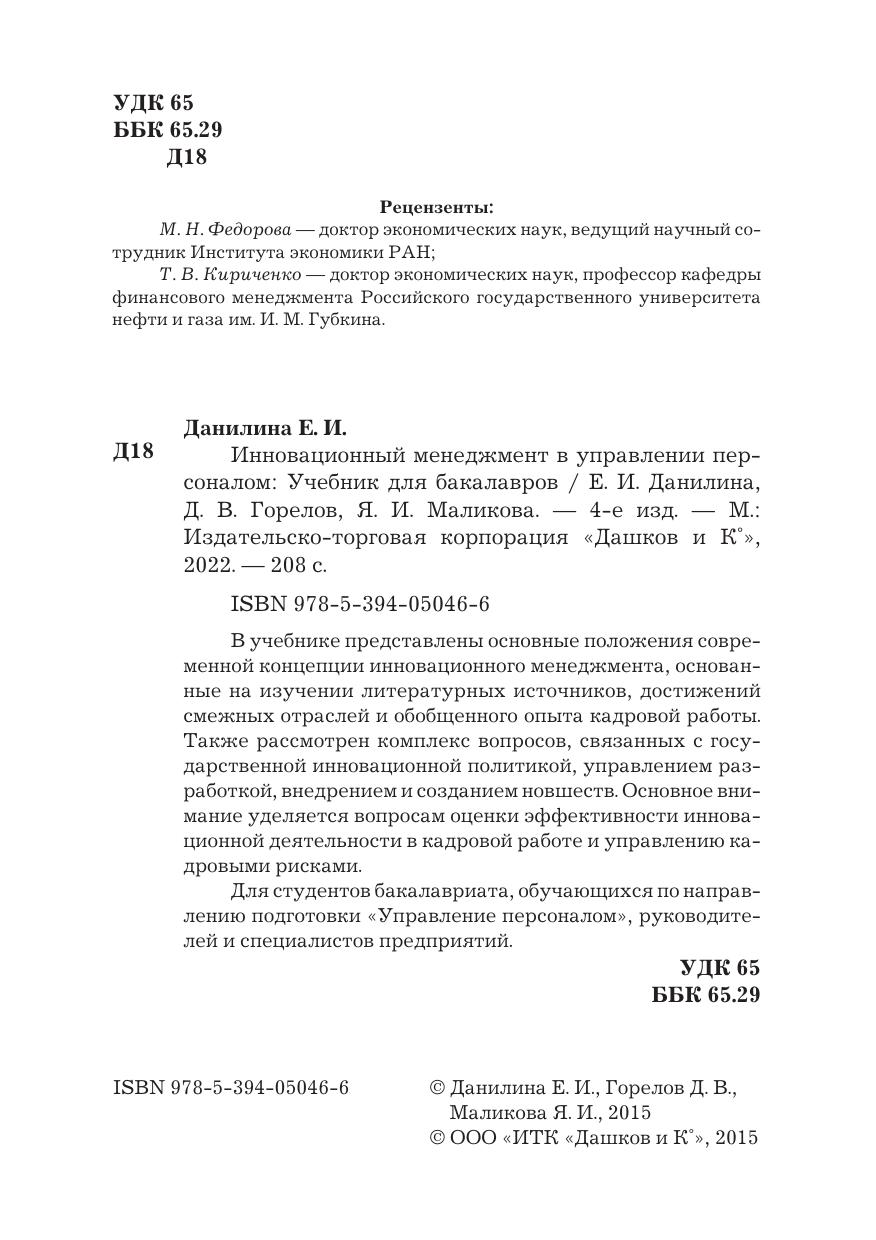 В учебнике представлены основные положения современной концепции инновационного менеджмента, основанные на изучении литературных источников, достижений смежных отраслей и обобщенного опыта кадровой работы. Также рассмотрен комплекс вопросов, связанных с государственной инновационной политикой, управлением разработкой, внедрением и созданием новшеств. Основное внимание уделяется вопросам оценки эффективности инновационной деятельности в кадровой работе и управлению кадровыми рисками. Для студентов бакалавриата, обучающихся по направлению подготовки "Управление персоналом", руководителей и специалистов предприятий. Гриф.