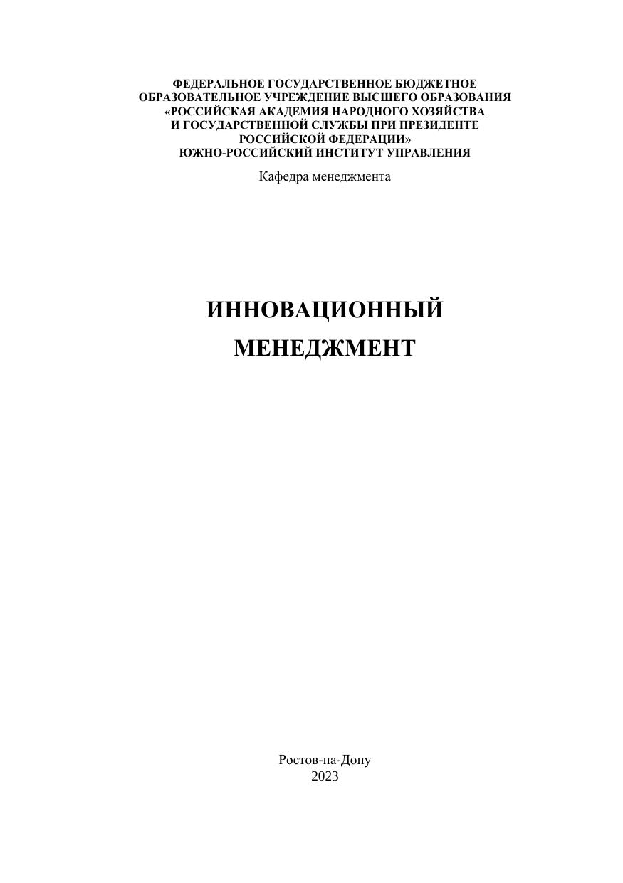 В учебном пособии раскрываются базовые понятия и положения инновационного менеджмента как важнейшей составной части общего менеджмента. Рассмотрены теоретические основы формирования инновационной составляющей как в деятельности организаций, так и в развитии экономики и государства. В пособии авторами представлены практические аспекты развития инновационной инфраструктуры современной России, что имеет существенное значение для получения представления о современном этапе инновационного развития. Пособие предназначено для студентов бакалавриата и магистратуры, обучающихся по направлениям подготовки «Менеджмент», «Государственное и муниципальное управление», преподавателей, а также для специалистов-практиков.