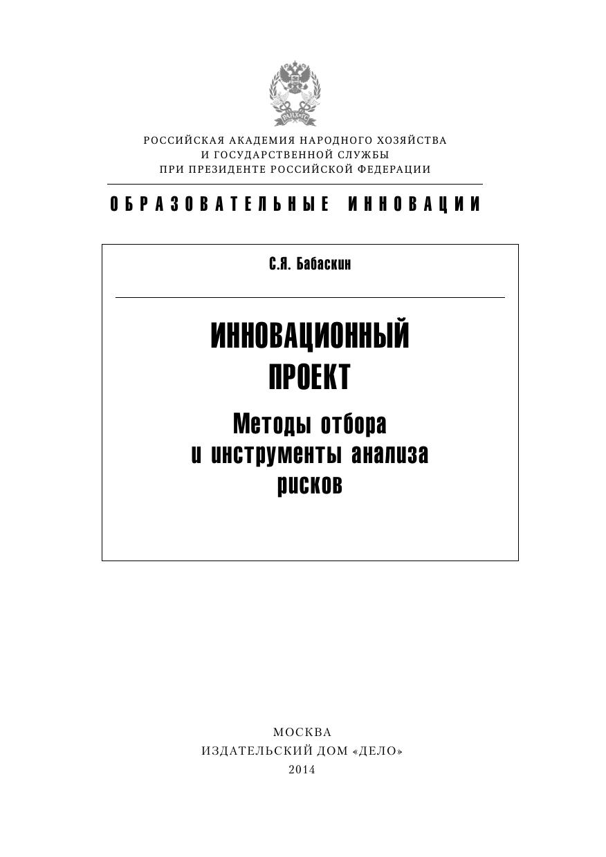 Серия Образовательные инновации. Учебное пособие включает описание методов и инструментов, кот орые используются в практике инновационной деятельности. Общей целью пособия является формирование у читателей навыков отбора и анализа рисков инновационных проектов. Книга может быть использована при реализации программ подготовки управленческих кадров различного уровня , в чьи функции входит анализ рисков инновационных проектов и отбор их для финансирования