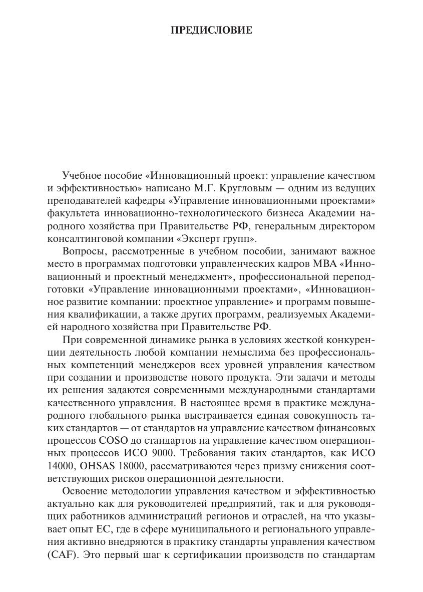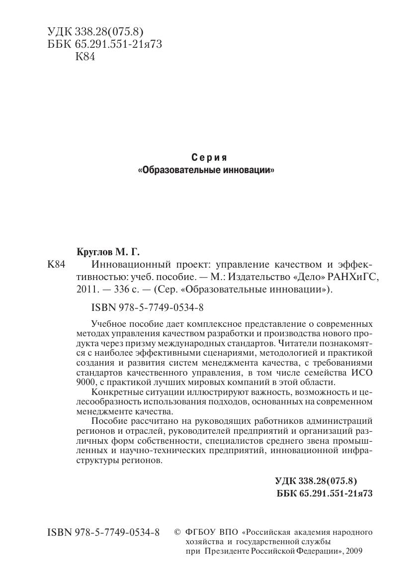 Серия Образовательные инновации. Учебное пособие дает комплексное представление о современных методах управления качеством разработки и производства нового продукта через призму международных стандартов. Читатели познакомятся с наиболее эффективными сценариями, методологией и практикой создания и развития систем менеджмента качества, с требованиями стандартов качественного управления, в том числе семейства ИСО 9000, с практикой лучших мировых компаний в этой области. Конкретные ситуации иллюстрируют важность, возможность и целесообразность использования подходов, основанных на современном менеджменте качества. Пособие рассчитано на руководящих работников администраций регионов и отраслей, руководителей предприятий и организаций различных форм собственности, специалистов среднего звена промышленных и научно-технических предприятий, инновационной инфраструктуры регионов.