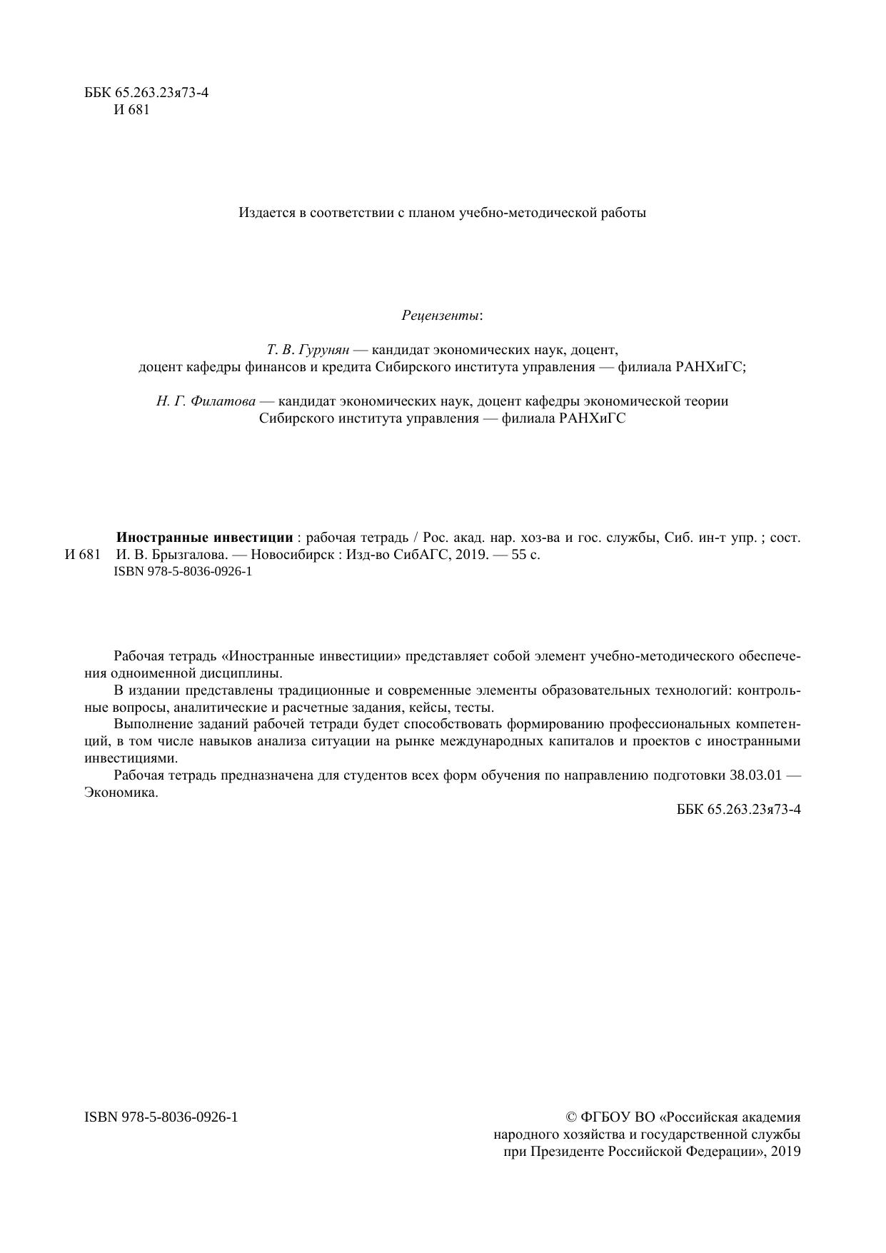 Рабочая тетрадь «Иностранные инвестиции» представляет собой элемент учебно-методического обеспече-ния одноименной дисциплины. В издании представлены традиционные и современные элементы образовательных технологий: контроль-ные вопросы, аналитические и расчетные задания, кейсы, тесты. Выполнение заданий рабочей тетради будет способствовать формированию профессиональных компетен-ций, в том числе навыков анализа ситуации на рынке международных капиталов и проектов с иностранными инвестициями. Рабочая тетрадь предназначена для студентов всех форм обучения по направлению подготовки 38.03.01 — Экономика.