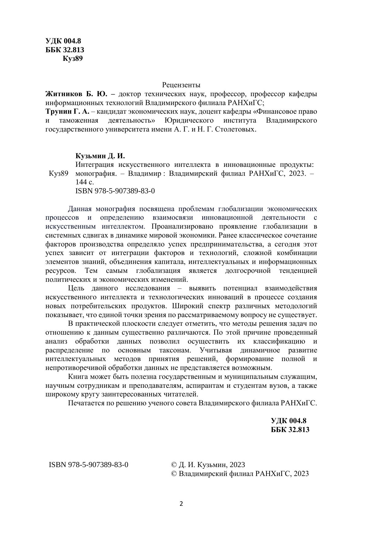 Данная монография посвящена проблемам глобализации экономических процессов и определению взаимосвязи инновационной деятельности с искусственным интеллектом. Проанализировано проявление глобализации в системных сдвигах в динамике мировой экономики. Ранее классическое сочетание факторов производства определяло успех предпринимательства, а сегодня этот успех зависит от интеграции факторов и технологий, сложной комбинации элементов знаний, объединения капитала, интеллектуальных и информационных ресурсов. Тем самым глобализация является долгосрочной тенденцией политических и экономических изменений. Цель данного исследования – выявить потенциал взаимодействия искусственного интеллекта и технологических инноваций в процессе создания новых потребительских продуктов. Широкий спектр различных методологий показывает, что единой точки зрения по рассматриваемому вопросу не существует. В практической плоскости следует отметить, что методы решения задач по отношению к данным существенно различаются. По этой причине проведенный анализ обработки данных позволил осуществить их классификацию и распределение по основным таксонам. Учитывая динамичное развитие интеллектуальных методов принятия решений, формирование полной и непротиворечивой обработки данных не представляется возможным. Книга может быть полезна государственным и муниципальным служащим, научным сотрудникам и преподавателям, аспирантам и студентам вузов, а также широкому кругу заинтересованных читателей. Печатается по решению ученого совета Владимирского филиала РАНХиГС.
