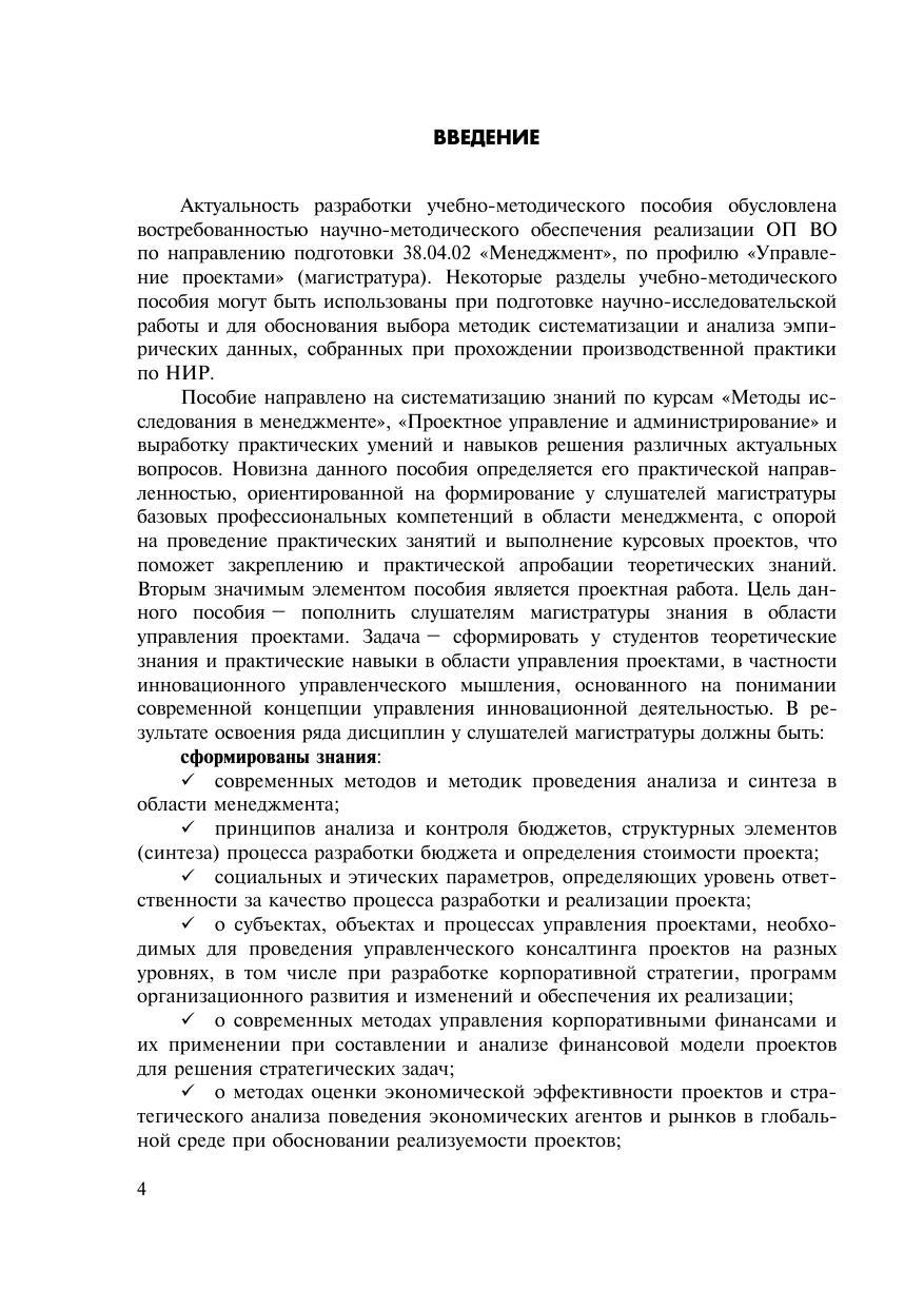 Учебно-методическое пособие предназначено для научно-методического обеспечения реализации ОП ВО по направлению подготовки 38.04.02 «Менеджмент», по профилю «Управление проектами» (магистратура). Некоторые разделы учебно-мето-дического пособия могут быть использованы при подготовке научно-исследовательской работы и для обоснования выбора ме-тодик систематизации и анализа эмпирических данных, собран-ных при прохождении производственной практики по НИР.