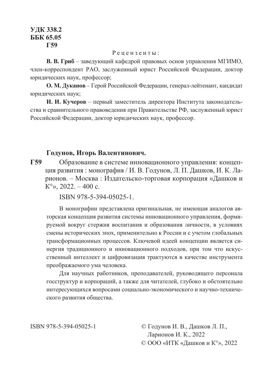 В монографии представлена оригинальная, не имеющая аналогов авторская концепция развития системы инновационного управления, формируемой вокруг стержня воспитания и образования личности, в условиях смены исторических эпох, применительно к России и с учетом глобальных трансформационных процессов. Ключевой идеей концепции является синергия традиционного и инновационного подходов, при том что искусственный интеллект и цифровизация трактуются в качестве инструмента преображаемого ума человека.