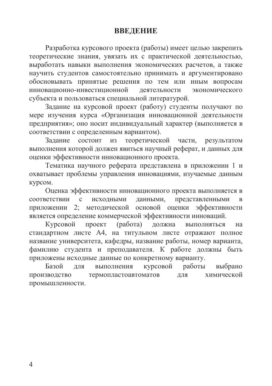 Учебное пособие включает в себя постановку комплексной задачи по оценки эффективности инновационного проекта, методические указания по выполнению курсового проекта (работы), пример расчета указанной комплексной задачи. Позволяет студентам закрепить теоретические знания и приобрести практические навыки в области оценки эффективности инновационных проектов. Предназначены для студентов, обучающихся по направлениям подготовки 38.03.01 -«Экономика», 38.03.02 - «Менеджмент», 27.04.07 - «Наукоемкие технологии и экономика инноваций», при изучении курса «Организация инновационной деятельности предприятия» для выполнения курсового проекта (работы) по этому курсу.
