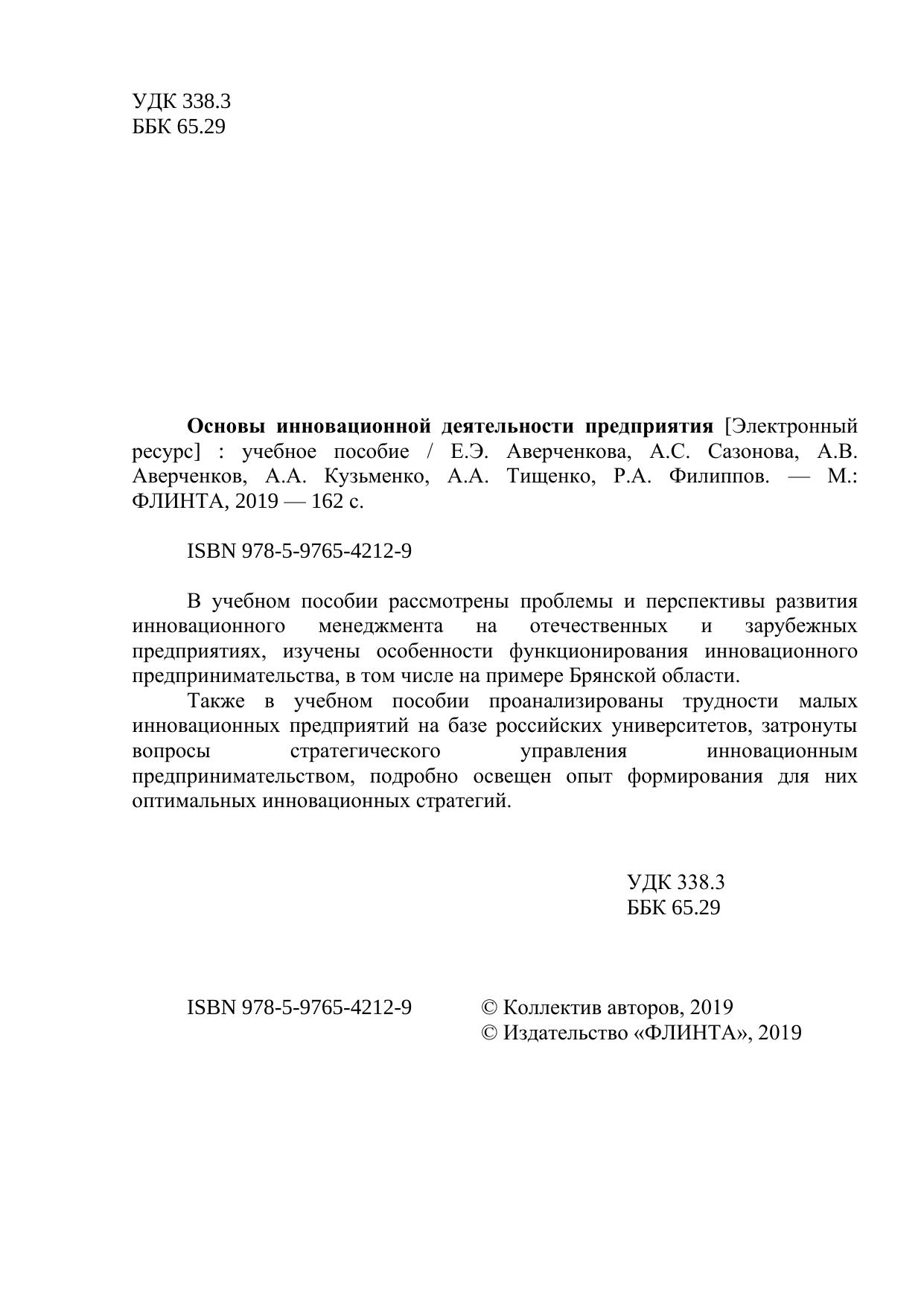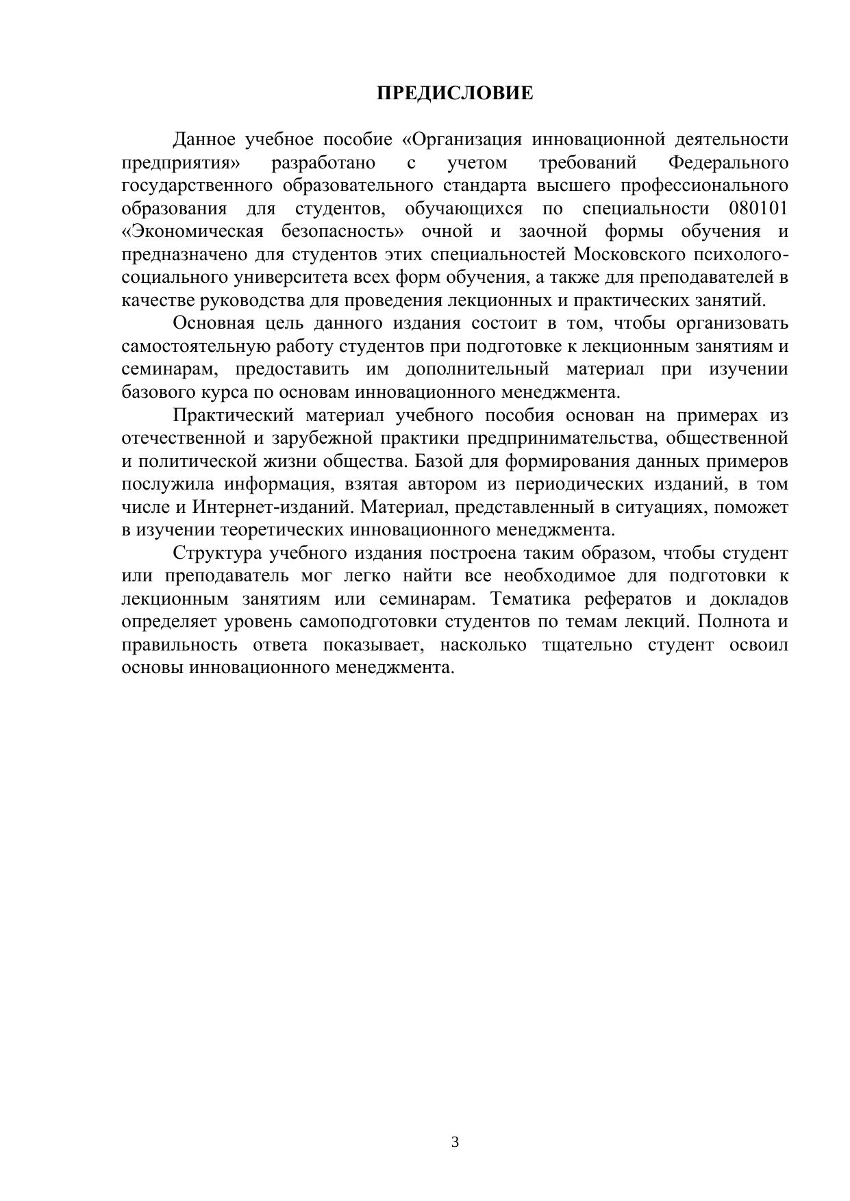 В учебном пособии рассмотрены проблемы и перспективы развития инновационного менеджмента на отечественных и зарубежных предприятиях, изучены особенности функционирования инновационного предпринимательства, в том числе на примере Брянской области.