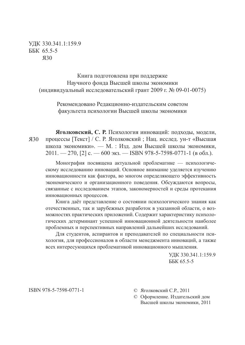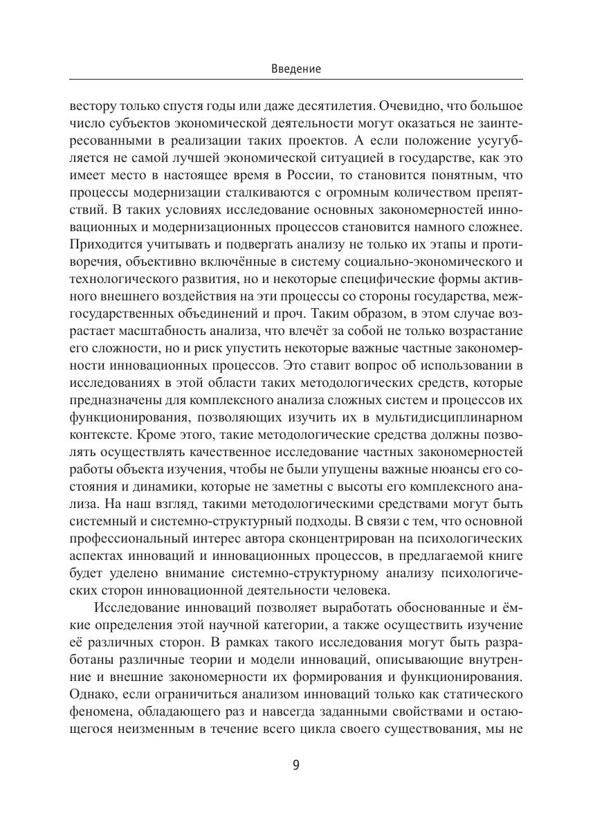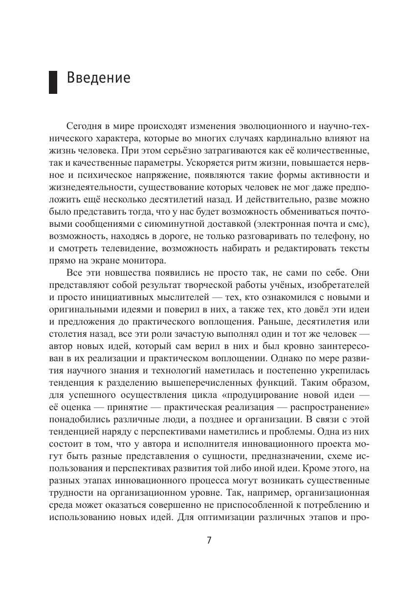 Монография посвящена актуальной проблематике — психологическому исследованию инноваций. Основное внимание уделяется изучению инновационности как фактора, во многом определяющего эффективность экономического и организационного поведения. Обсуждаются вопросы, связанные с исследованием этапов, закономерностей и среды протекания инновационных процессов. Книга даёт представление о состоянии психологического знания как отечественных, так и зарубежных разработок в указанной области, о возможностях практических приложений. Содержит характеристику психологических детерминант успешной инновационной деятельности наиболее проблемных и перспективных направлений дальнейших исследований. Для студентов, аспирантов и преподавателей по специальности психология, для профессионалов в области менеджмента инноваций, а также всех интересующихся проблематикой инновационного мышления.