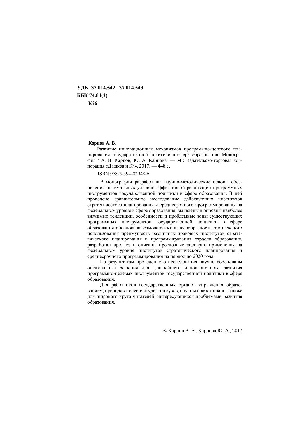 В монографии разработаны научно-методические основы обеспечения оптимальных условий эффективной реализации программных инструментов государственной политики в сфере образования. В ней проведено сравнительное исследование действующих институтов стратегического планирования и среднесрочного программирования на федеральном уровне в сфере образования, выявлены и описаны наиболее значимые тенденции, особенности и проблемные зоны существующих программных инструментов государственной политики в сфере образования, обоснована возможность и целесообразность комплексного использования преимуществ различных правовых институтов стратегического планирования и программирования отрасли образования, разработан прогноз и описаны прогнозные сценарии применения на федеральном уровне институтов стратегического планирования и среднесрочного программирования на период до 2020 года. По результатам проведенного исследования научно обоснованы оптимальные решения для дальнейшего инновационного развития программно-целевых инструментов государственной политики в сфере образования.