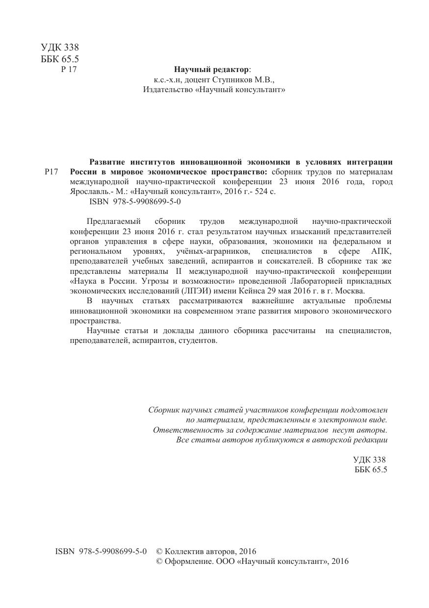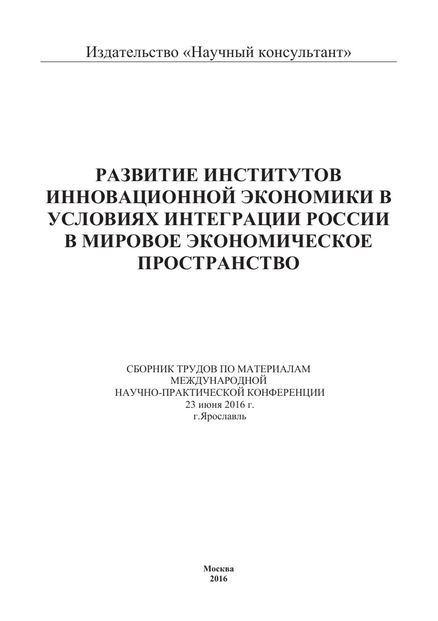 Развитие институтов инновационной экономики в условиях интеграции России в мировое экономическое пространство: сборник трудов по материалам международной научно-практической конференции 23 июня 2016 года, город Ярославль