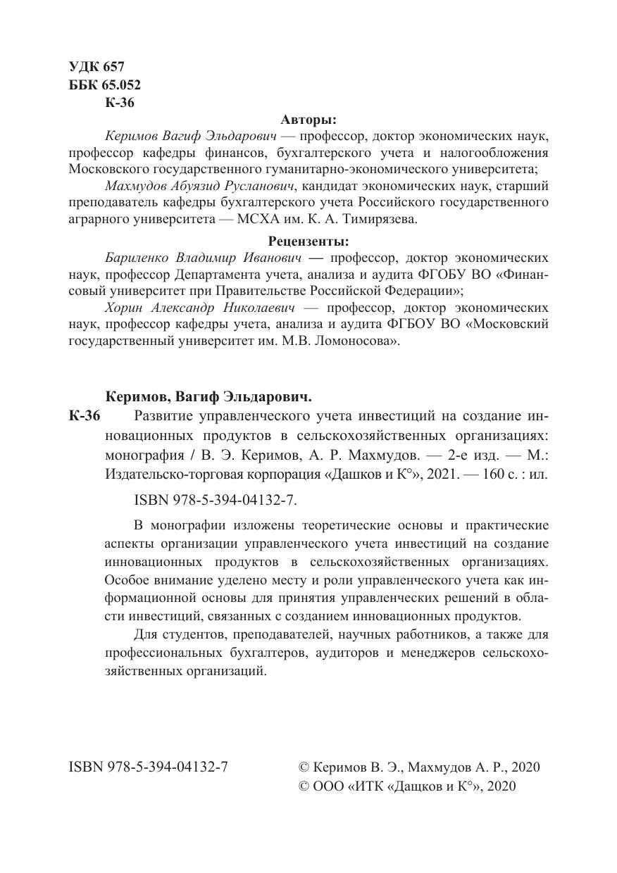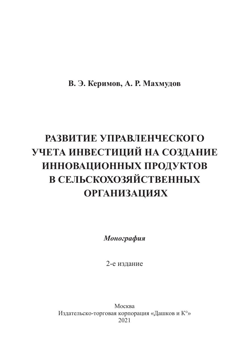 В монографии изложены теоретические основы и практические аспекты организации управленческого учета инвестиций на создание инновационных продуктов в сельскохозяйственных организациях. Особое внимание уделено месту и роли управленческого учета как информационной основы для принятия управленческих решений в области инвестиций, связанных с созданием инновационных продуктов.