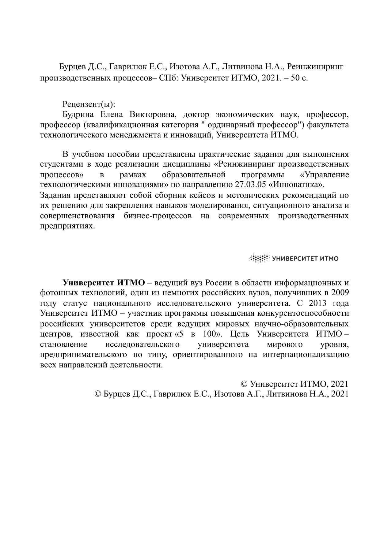 В учебном пособии представлены практические задания для выполнения студентами в ходе реализации дисциплины «Реинжиниринг производственных процессов» в рамках образовательной программы «Управление технологическими инновациями» по направлению 27.03.05 «Инноватика». Задания представляют собой сборник кейсов и методических рекомендаций по их решению для закрепления навыков моделирования, ситуационного анализа и совершенствования бизнес-процессов на современных производственных предприятиях.
