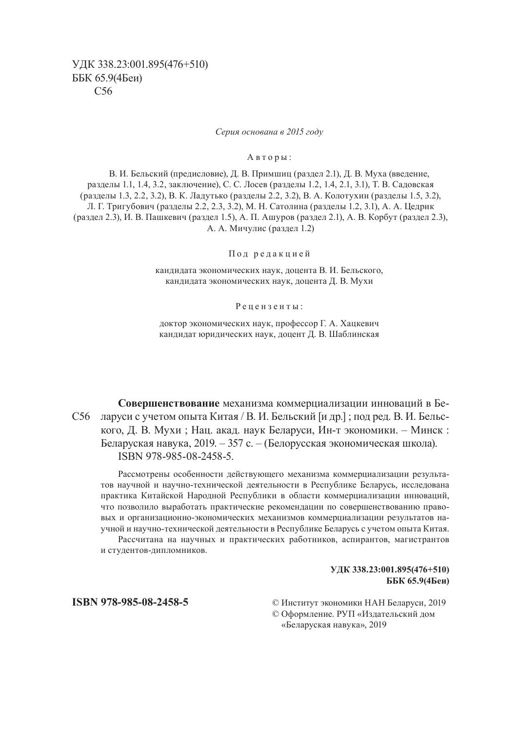 Рассмотрены особенности действующего механизма коммерциализации результатов научной и научнотехнической деятельности в Республике Беларусь, исследована практика Китайской Народной Республики в области коммерциализации инноваций, что позволило выработать практические рекомендации по совершенствованию правовых и организационноэкономических механизмов коммерциализации результатов научной и научнотехнической деятельности в Республике Беларусь с учетом опыта Китая. Рассчитана на научных и практических работников, аспирантов, магистрантов и студентовдипломников.