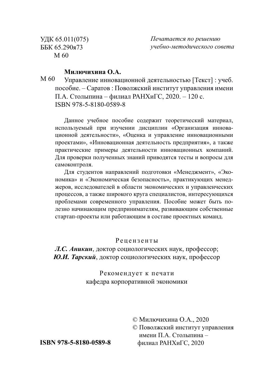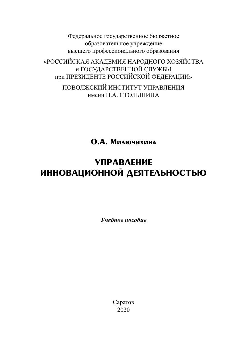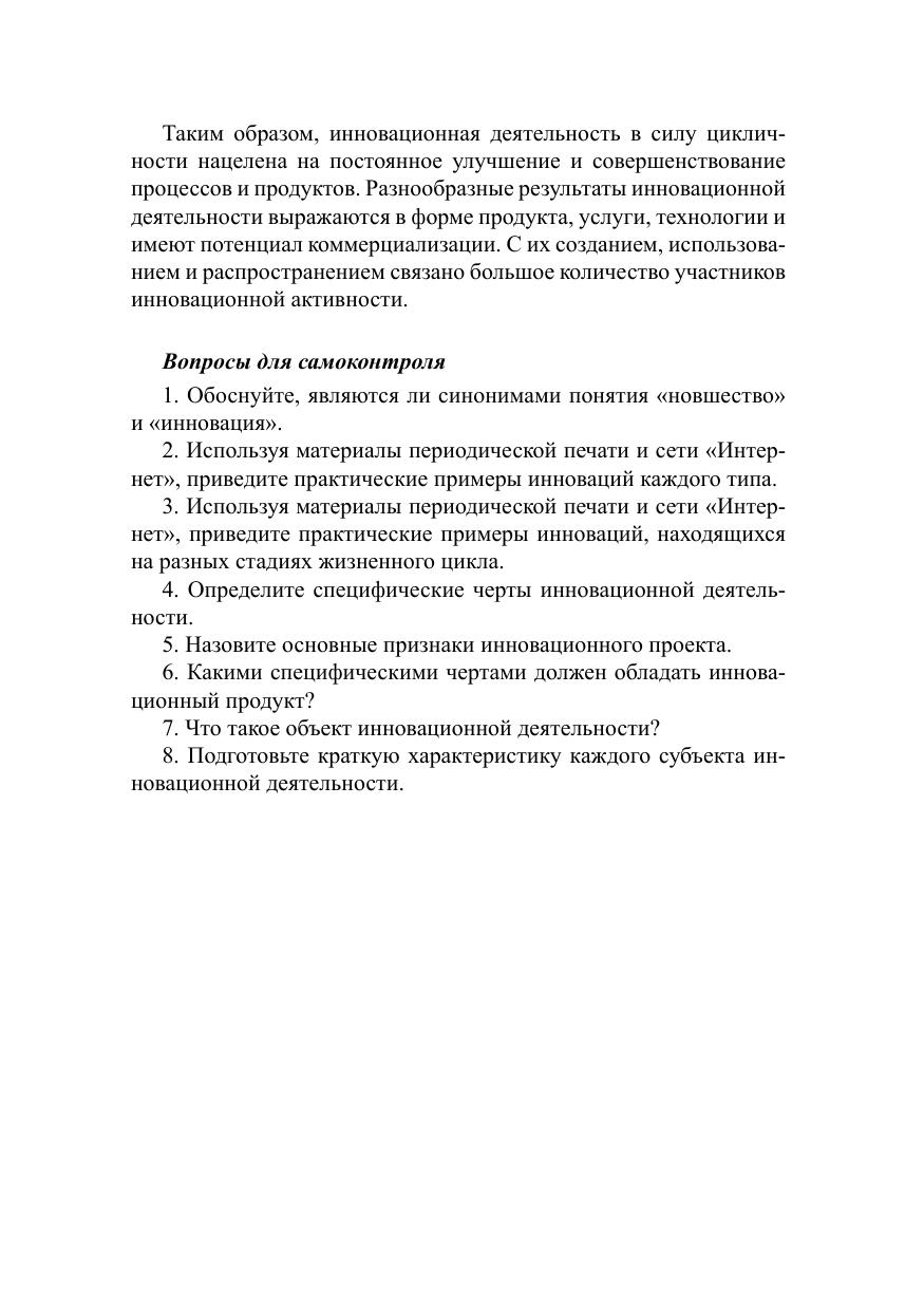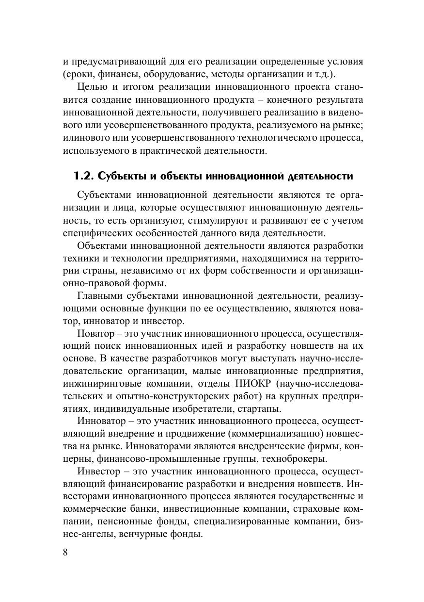 Данное учебное пособие содержит теоретический материал, используемый при изучении дисциплин «Организация инновационной деятельности», «Оценка и управление инновационными проектами», «Инновационная деятельность предприятия», а также практические примеры деятельности инновационных компаний. Для проверки полученных знаний приводятся тесты и вопросы для самоконтроля. Для студентов направлений подготовки «Менеджмент», «Экономика» и «Экономическая безопасность», практикующих менеджеров, исследователей в области экономических и управленческих процессов, а также широкого круга специалистов, интересующихся проблемами современного управления. Пособие может быть полезно начинающим предпринимателям, развивающим собственные стартап-проекты или работающим в составе проектных команд.