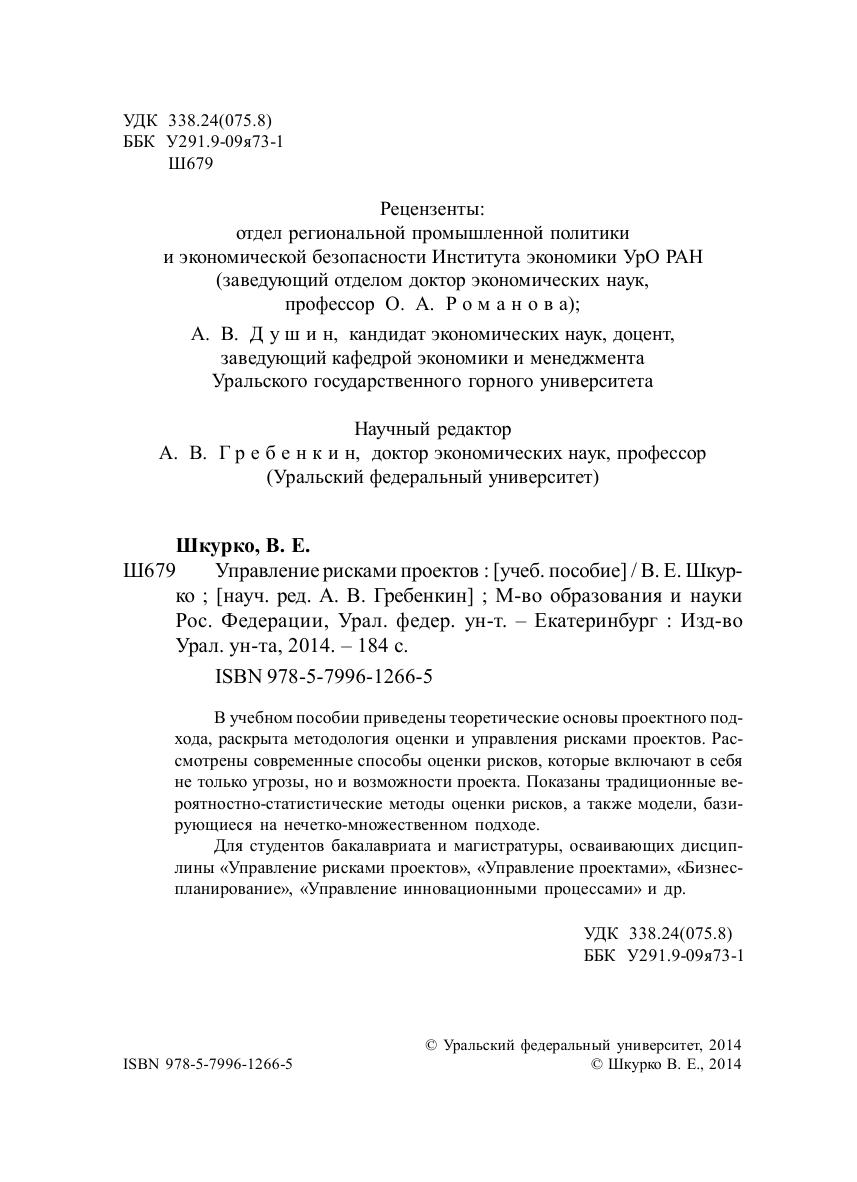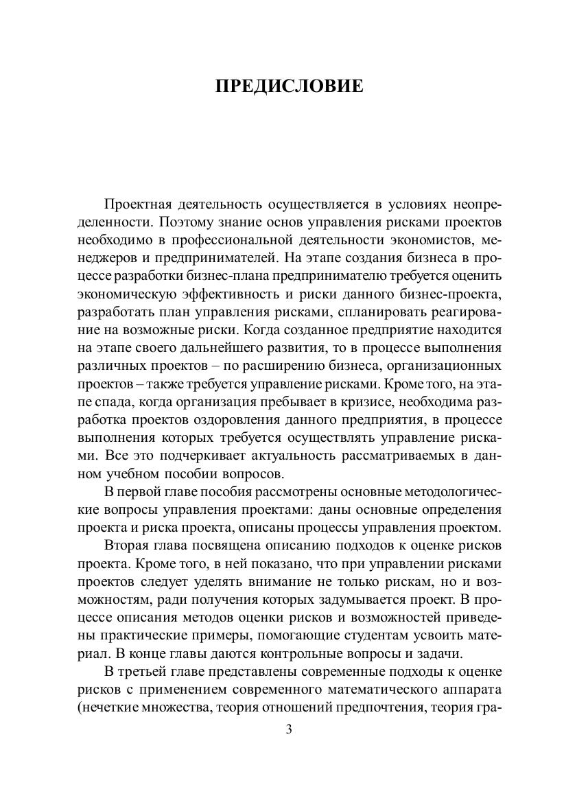 В учебном пособии приведены теоретические основы проектного подхода, раскрыта методология оценки и управления рисками проектов. Рассмотрены современные способы оценки рисков, которые включают в себя не только угрозы, но и возможности проекта. Показаны традиционные вероятностно-статистические методы оценки рисков, а также модели, базирующиеся на нечетко-множественном подходе. Для студентов бакалавриата и магистратуры, осваивающих дисциплины «Управление рисками проектов», «Управление проектами», «Бизнеспланирование», «Управление инновационными процессами» и др.