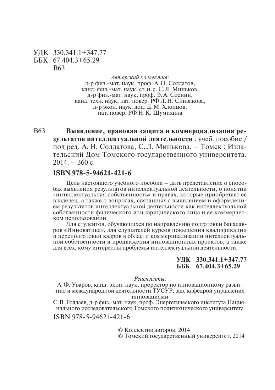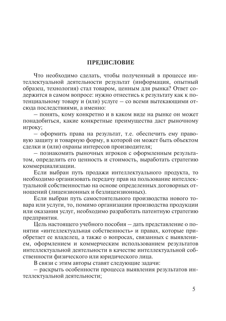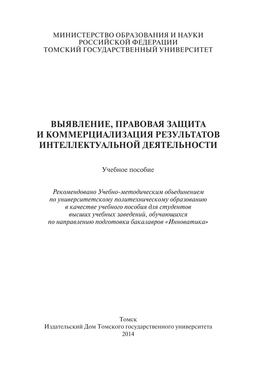 Цель настоящего учебного пособия – дать представление о способах выявления результатов интеллектуальной деятельности, о понятии «интеллектуальная собственность» и правах, которые приобретает ее владелец, а также о вопросах, связанных с выявлением и оформлением результатов интеллектуальной деятельности как интеллектуальной собственности физического или юридического лица и ее коммерческом использовании. Для студентов, обучающихся по направлению подготовки бакалавров «инноватика», для слушателей курсов повышения квалификации и переподготовки кадров в области коммерциализации интеллектуальной собственности и продвижения инновационных проектов, а также для всех, кому интересны проблемы интеллектуальной деятельности.