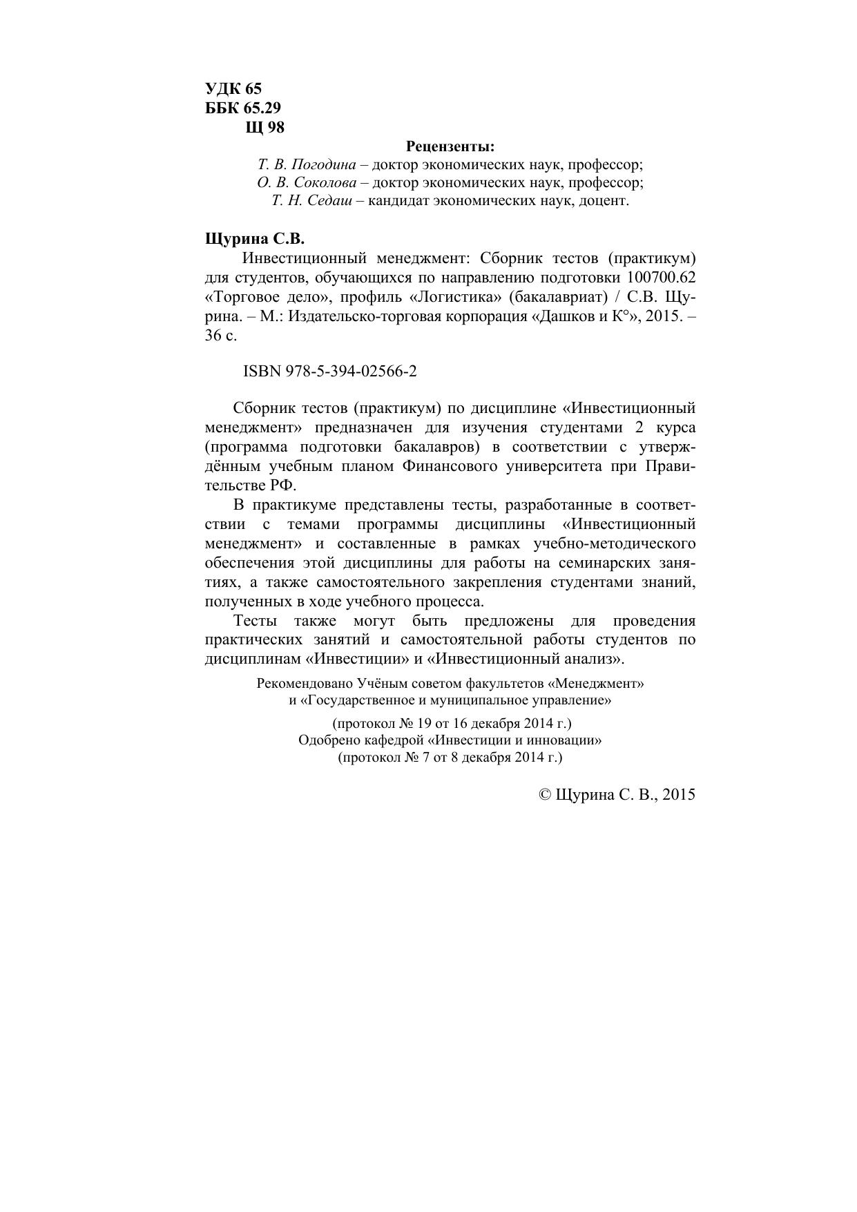 Сборник тестов (практикум) по дисциплине «Инвестиционный менеджмент» предназначен для изучения студентами 2 курса (программа подготовки бакалавров) в соответствии с утверждённым учебным планом Финансового университета при Правительстве РФ. В практикуме представлены тесты, разработанные в соответствии с темами программы дисциплины «Инвестиционный менеджмент» и составленные в рамках учебно-методического обеспечения этой дисциплины для работы на семинарских занятиях, а также самостоятельного закрепления студентами знаний, полученных в ходе учебного процесса. Тесты также могут быть предложены для проведения практических занятий и самостоятельной работы студентов по дисциплинам «Инвестиции» и «Инвестиционный анализ».