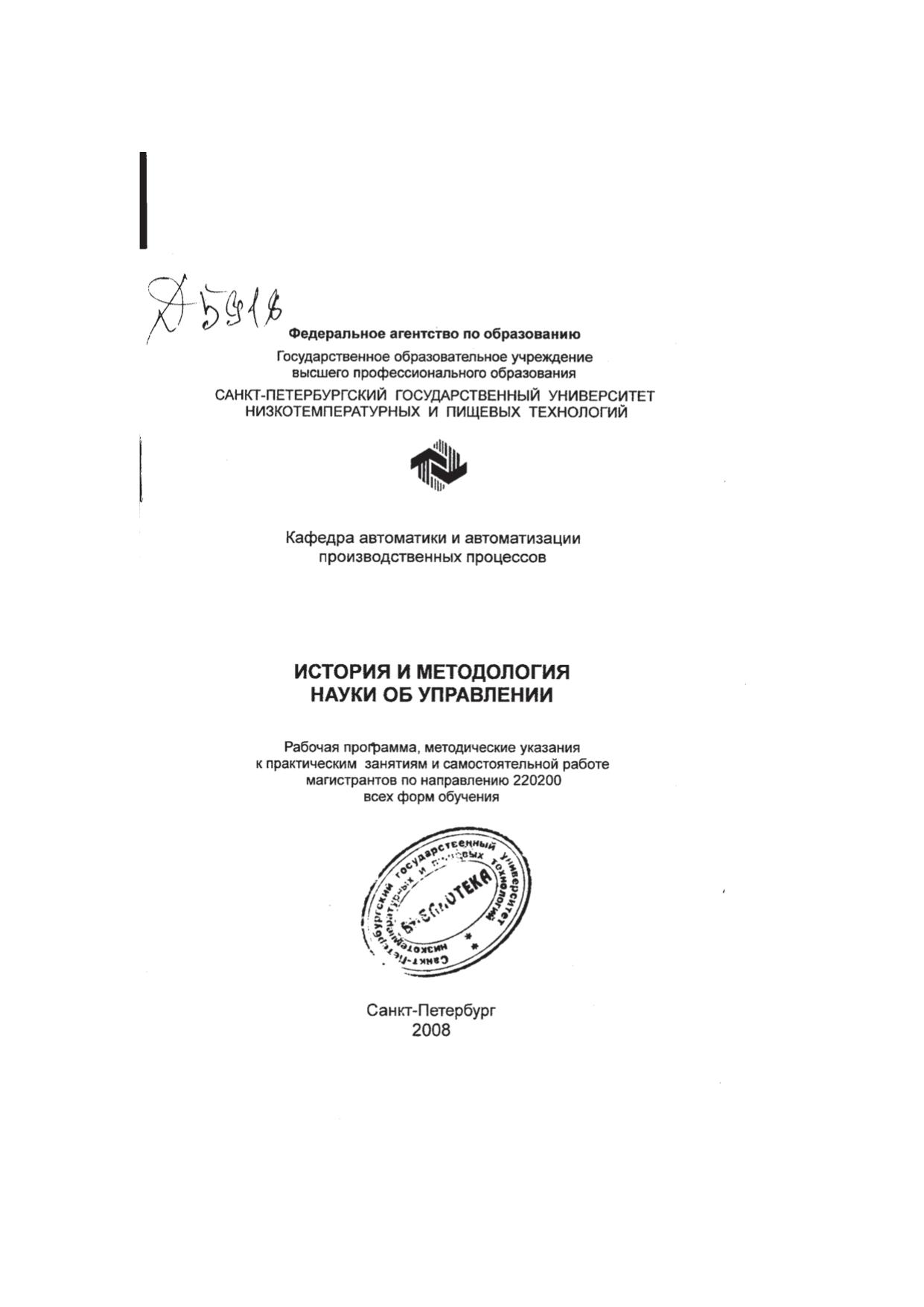 История и методология науки об управлении: Рабочая программа, метод, указания к практическим занятиям и самостоятельной работе магистрантов по направлению 220200 всех форм обучения