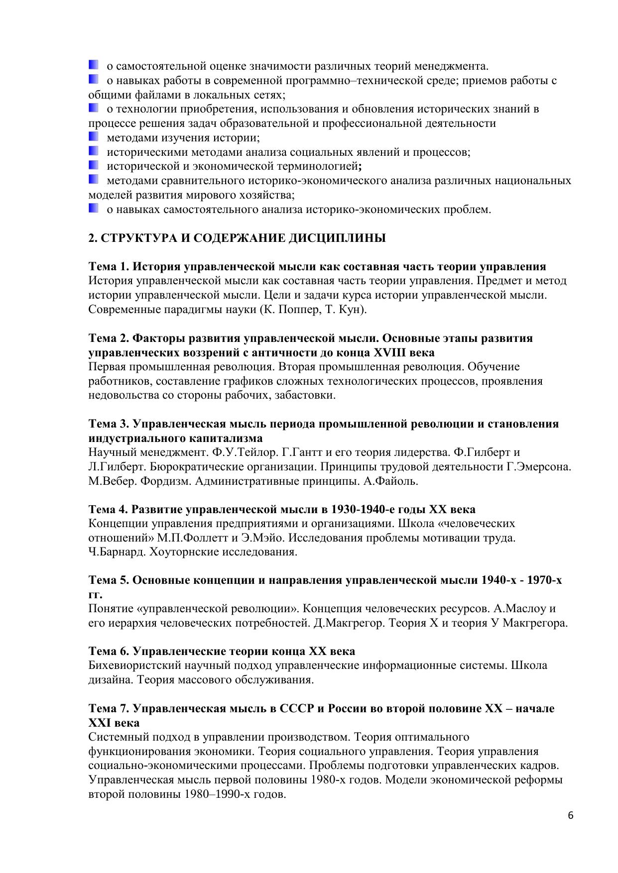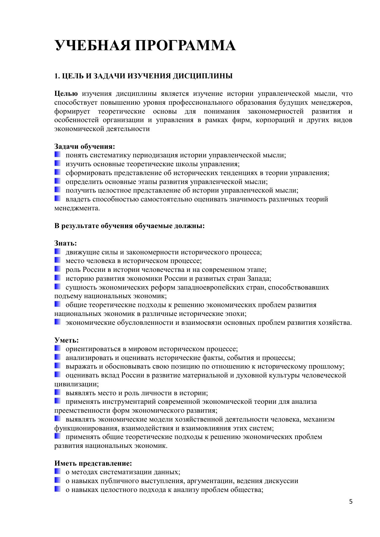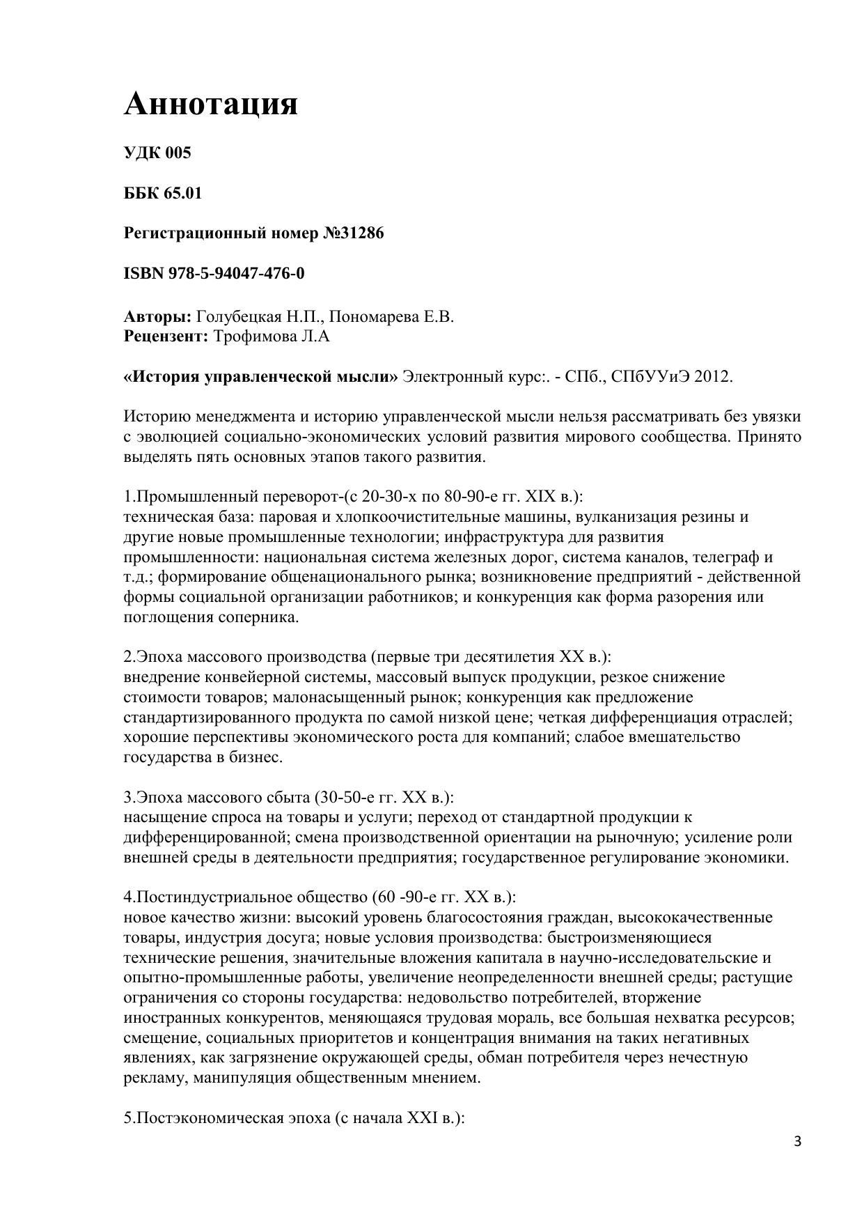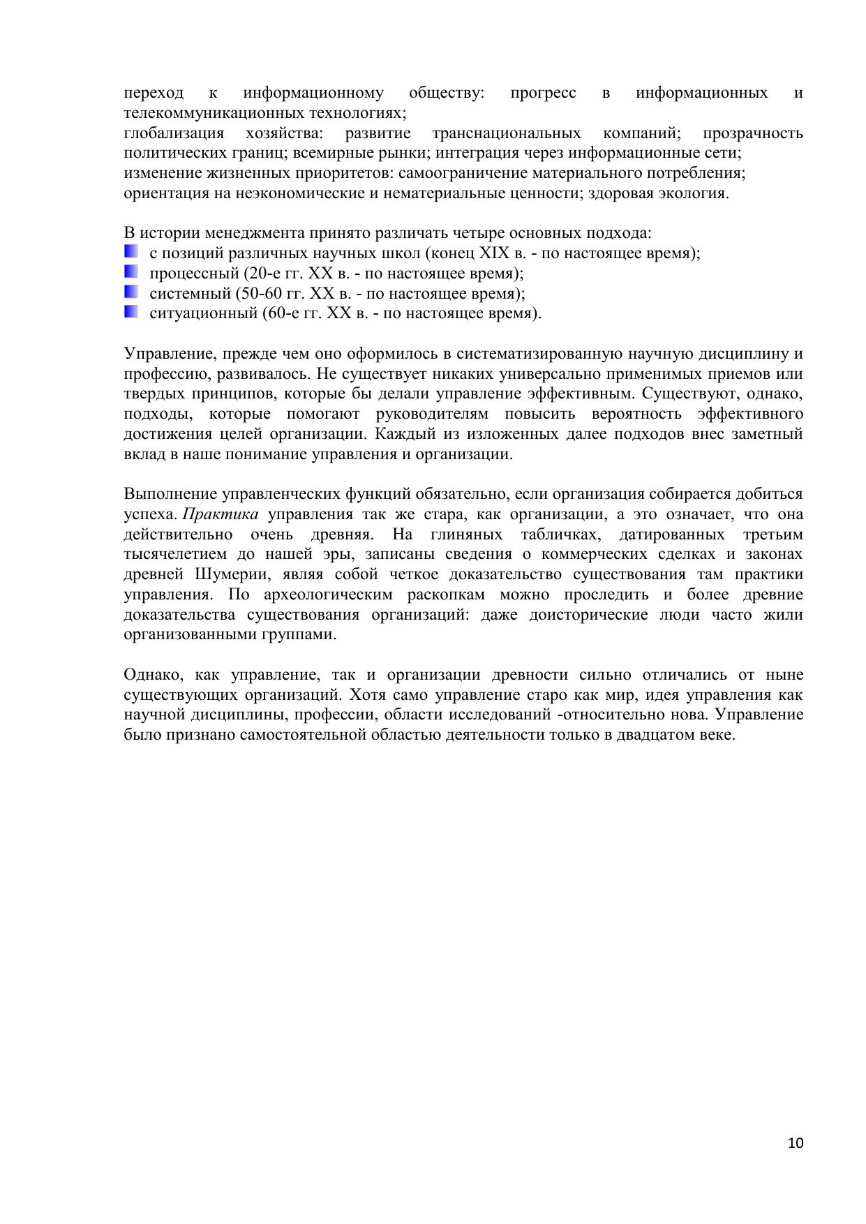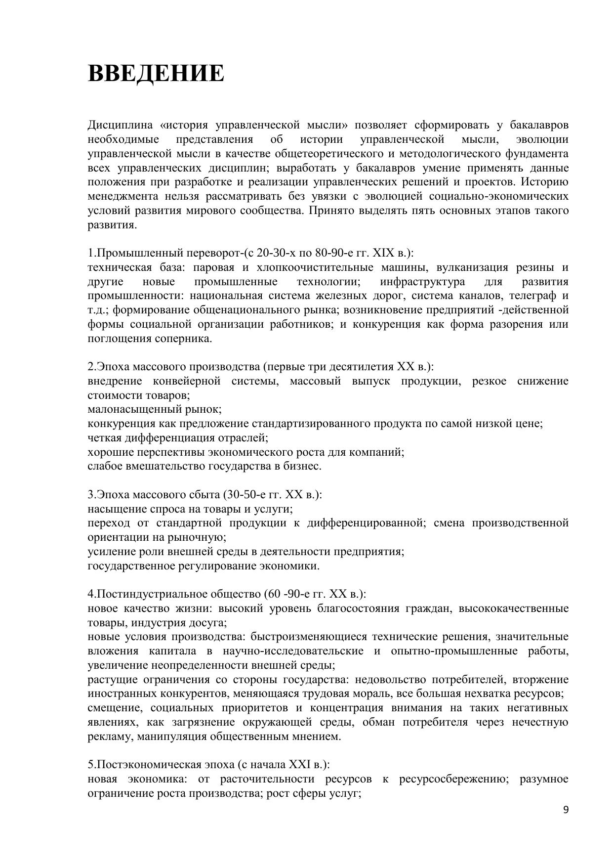 Историю менеджмента и историю управленческой мысли нельзя рассматривать без увязки с эволюцией социально-экономических условий развития мирового сообщества. Принято выделять пять основных этапов такого развития. 1.Промышленный переворот-(с 20-30-х по 80-90-е гг. XIX в.): техническая база: паровая и хлопкоочистительные машины, вулканизация резины и другие новые промышленные технологии инфраструктура для развития промышленности: национальная система железных дорог, система каналов, телеграф и т.д. формирование общенационального рынка возникновение предприятий - действенной формы социальной организации работников и конкуренция как форма разорения или поглощения соперника. 2.Эпоха массового производства (первые три десятилетия XX в.): внедрение конвейерной системы, массовый выпуск продукции, резкое снижение стоимости товаров малонасыщенный рынок конкуренция как предложение стандартизированного продукта по самой низкой цене четкая дифференциация отраслей хорошие перспективы экономического роста для компаний слабое вмешательство государства в бизнес. 3.Эпоха массового сбыта (30-50-е гг. XX в.): насыщение спроса на товары и услуги переход от стандартной продукции к дифференцированной смена производственной ориентации на рыночную усиление роли внешней среды в деятельности предприятия государственное регулирование экономики. 4.Постиндустриальное общество (60 -90-е гг. XX в.): новое качество жизни: высокий уровень благосостояния граждан, высококачественные товары, индустрия досуга новые условия производства: быстроизменяющиеся технические решения, значительные вложения капитала в научно-исследовательские и опытно-промышленные работы, увеличение неопределенности внешней среды растущие ограничения со стороны государства: недовольство потребителей, вторжение иностранных конкурентов, меняющаяся трудовая мораль, все большая нехватка ресурсов смещение, социальных приоритетов и концентрация внимания на таких негативных явлениях, как загрязнение окружающей среды, обман потребителя через нечестную рекламу, манипуляция общественным мнением.5.Постэкономическая эпоха (с начала XXI в.): новая экономика: от расточительности ресурсов к ресурсосбережению разумное ограничение роста производства рост сферы услуг переход к информационному обществу: прогресс в информационных и телекоммуникационных технологиях глобализация хозяйства: развитие транснациональных компаний прозрачность политических границ всемирные рынки интеграция через информационные сети изменение жизненных приоритетов: самоограничение материального потребления ориентация на неэкономические и нематериальные ценности здоровая экология. Курс предназначен для направления подготовки 080200.62 МЕНЕДЖМЕНТ Профили подготовки: «Логистика» «Управление человеческими ресурсами» «Управление проектами» «Управление технологическими инновациями» «Производственный менеджмент» «Управление малым бизнесом» «Маркетинг» «Информационный менеджмент» «Государственное и муниципальное управление» «Финансовый менеджмент» «Управленческий и финансовый учет»